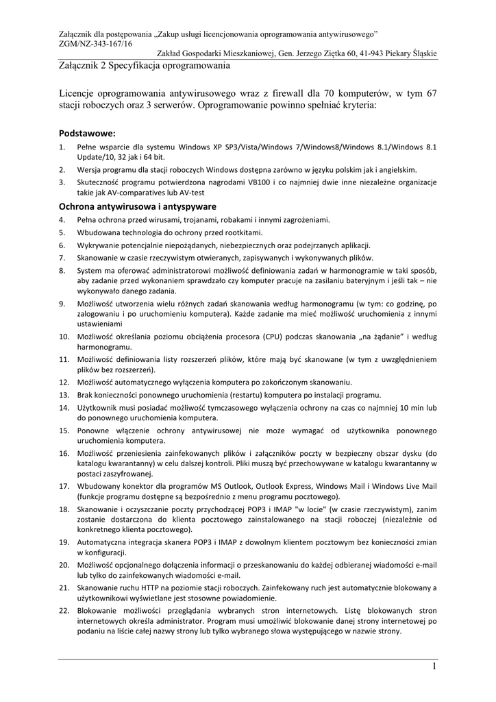 Załącznik dla postępowania „Zakup usługi licencjonowania oprogramowania antywirusowego” ZGM/NZ-343-167/16 Zakład Gospodarki Mieszkaniowej, Gen. Jerzego Ziętka 60, 41-943 Piekary Śląskie Załącznik 2 Specyfikacja oprogramowania Licencje oprogramowania antywirusowego wraz z firewall dla 70 komputerów, w tym 67 stacji roboczych oraz 3 serwerów. Oprogramowanie powinno spełniać kryteria: Podstawowe: 1. Pełne wsparcie dla systemu Windows XP SP3/Vista/Windows 7/Windows8/Windows 8.1/Windows 8.1 Update/10, 32 jak i 64 bit. 2. Wersja programu dla stacji roboczych Windows dostępna zarówno w języku polskim jak i angielskim. 3. Skuteczność programu potwierdzona nagrodami VB100 i co najmniej dwie inne niezależne organizacje takie jak AV-comparatives lub AV-test Ochrona antywirusowa i antyspyware 4. Pełna ochrona przed wirusami, trojanami, robakami i innymi zagrożeniami. 5. Wbudowana technologia do ochrony przed rootkitami. 6. Wykrywanie potencjalnie niepożądanych, niebezpiecznych oraz podejrzanych aplikacji. 7. Skanowanie w czasie rzeczywistym otwieranych, zapisywanych i wykonywanych plików. 8. System ma oferować administratorowi możliwość definiowania zadań w harmonogramie w taki sposób, aby zadanie przed wykonaniem sprawdzało czy komputer pracuje na zasilaniu bateryjnym i jeśli tak – nie wykonywało danego zadania. 9. Możliwość utworzenia wielu różnych zadań skanowania według harmonogramu (w tym: co godzinę, po zalogowaniu i po uruchomieniu komputera). Każde zadanie ma mieć możliwość uruchomienia z innymi ustawieniami 10. Możliwość określania poziomu obciążenia procesora (CPU) podczas skanowania „na żądanie” i według harmonogramu. 11. Możliwość definiowania listy rozszerzeń plików, które mają być skanowane (w tym z uwzględnieniem plików bez rozszerzeń). 12. Możliwość automatycznego wyłączenia komputera po zakończonym skanowaniu. 13. Brak konieczności ponownego uruchomienia (restartu) komputera po instalacji programu. 14. Użytkownik musi posiadać możliwość tymczasowego wyłączenia ochrony na czas co najmniej 10 min lub do ponownego uruchomienia komputera. 15. Ponowne włączenie ochrony antywirusowej nie może wymagać od użytkownika ponownego uruchomienia komputera. 16. Możliwość przeniesienia zainfekowanych plików i załączników poczty w bezpieczny obszar dysku (do katalogu kwarantanny) w celu dalszej kontroli. Pliki muszą być przechowywane w katalogu kwarantanny w postaci zaszyfrowanej. 17. Wbudowany konektor dla programów MS Outlook, Outlook Express, Windows Mail i Windows Live Mail (funkcje programu dostępne są bezpośrednio z menu programu pocztowego). 18. Skanowanie i oczyszczanie poczty przychodzącej POP3 i IMAP "w locie" (w czasie rzeczywistym), zanim zostanie dostarczona do klienta pocztowego zainstalowanego na stacji roboczej (niezależnie od konkretnego klienta pocztowego). 19. Automatyczna integracja skanera POP3 i IMAP z dowolnym klientem pocztowym bez konieczności zmian w konfiguracji. 20. Możliwość opcjonalnego dołączenia informacji o przeskanowaniu do każdej odbieranej wiadomości e-mail lub tylko do zainfekowanych wiadomości e-mail. 21. Skanowanie ruchu HTTP na poziomie stacji roboczych. Zainfekowany ruch jest automatycznie blokowany a użytkownikowi wyświetlane jest stosowne powiadomienie. 22. Blokowanie możliwości przeglądania wybranych stron internetowych. Listę blokowanych stron internetowych określa administrator. Program musi umożliwić blokowanie danej strony internetowej po podaniu na liście całej nazwy strony lub tylko wybranego słowa występującego w nazwie strony. 1 Załącznik dla postępowania „Zakup usługi licencjonowania oprogramowania antywirusowego” ZGM/NZ-343-167/16 Zakład Gospodarki Mieszkaniowej, Gen. Jerzego Ziętka 60, 41-943 Piekary Śląskie 23. Automatyczna integracja z dowolną przeglądarką internetową bez konieczności zmian w konfiguracji. 24. Program ma umożliwiać skanowanie ruchu sieciowego wewnątrz szyfrowanych protokołów HTTPS, POP3S, IMAPS. 25. Program ma zapewniać skanowanie ruchu HTTPS transparentnie bez potrzeby konfiguracji zewnętrznych aplikacji takich jak przeglądarki Web lub programy pocztowe. 26. Możliwość zgłoszenia witryny z podejrzeniem phishingu z poziomu graficznego interfejsu użytkownika w celu analizy przez laboratorium producenta. 27. Program musi posiadać funkcjonalność która na bieżąco będzie odpytywać serwery producenta o znane i bezpieczne procesy uruchomione na komputerze użytkownika. 28. Procesy zweryfikowane jako bezpieczne mają być pomijane podczas procesu skanowania na żądanie oraz przez moduły ochrony w czasie rzeczywistym. 29. Użytkownik musi posiadać możliwość przesłania pliku celem zweryfikowania jego reputacji bezpośrednio z poziomu menu kontekstowego. 30. Wbudowane dwa niezależne moduły heurystyczne – jeden wykorzystujący pasywne metody heurystyczne (heurystyka) i drugi wykorzystujący aktywne metody heurystyczne oraz elementy sztucznej inteligencji (zaawansowana heurystyka). Musi istnieć możliwość wyboru, z jaką heurystyka ma odbywać się skanowanie – z użyciem jednej i/lub obu metod jednocześnie. 31. Możliwość automatycznego wysyłania nowych zagrożeń (wykrytych przez metody heurystyczne) do laboratoriów producenta bezpośrednio z programu (nie wymaga ingerencji użytkownika). Użytkownik musi mieć możliwość określenia rozszerzeń dla plików, które nie będą wysyłane automatycznie, oraz czy próbki zagrożeń mają być wysyłane w pełni automatycznie czy też po dodatkowym potwierdzeniu przez użytkownika. 32. Do wysłania próbki zagrożenia do laboratorium producenta aplikacja nie może wykorzystywać klienta pocztowego wykorzystywanego na komputerze użytkownika. 33. Możliwość zabezpieczenia konfiguracji programu hasłem, w taki sposób, aby użytkownik siedzący przy komputerze przy próbie dostępu do konfiguracji by