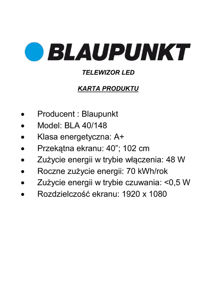 TELEWIZOR LED KARTA PRODUKTU Producent : Blaupunkt Model: BLA 40/148 Klasa energetyczna: A+ Przekątna ekranu: 40”; 102 cm Zużycie energii w trybie włączenia: 48 W Roczne zużycie energii: 70 kWh/rok Zużycie energii w trybie czuwania: <0,5 W Rozdzielczość ekranu: 1920 x 1080