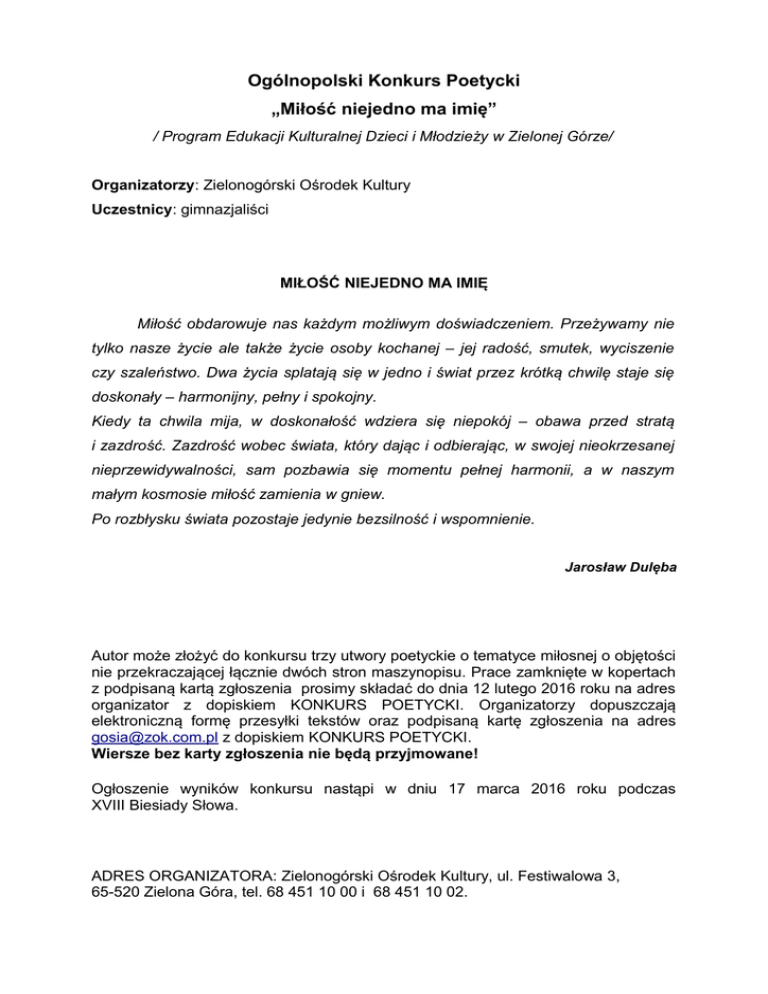 Ogólnopolski Konkurs Poetycki „Miłość niejedno ma imię” / Program Edukacji Kulturalnej Dzieci i Młodzieży w Zielonej Górze/ Organizatorzy: Zielonogórski Ośrodek Kultury Uczestnicy: gimnazjaliści MIŁOŚĆ NIEJEDNO MA IMIĘ Miłość obdarowuje nas każdym możliwym doświadczeniem. Przeżywamy nie tylko nasze życie ale także życie osoby kochanej – jej radość, smutek, wyciszenie czy szaleństwo. Dwa życia splatają się w jedno i świat przez krótką chwilę staje się doskonały – harmonijny, pełny i spokojny. Kiedy ta chwila mija, w doskonałość wdziera się niepokój – obawa przed stratą i zazdrość. Zazdrość wobec świata, który dając i odbierając, w swojej nieokrzesanej nieprzewidywalności, sam pozbawia się momentu pełnej harmonii, a w naszym małym kosmosie miłość zamienia w gniew. Po rozbłysku świata pozostaje jedynie bezsilność i wspomnienie. Jarosław Dulęba Autor może złożyć do konkursu trzy utwory poetyckie o tematyce miłosnej o objętości nie przekraczającej łącznie dwóch stron maszynopisu. Prace zamknięte w kopertach z podpisaną kartą zgłoszenia prosimy składać do dnia 12 lutego 2016 roku na adres organizator z dopiskiem KONKURS POETYCKI. Organizatorzy dopuszczają elektroniczną formę przesyłki tekstów oraz podpisaną kartę zgłoszenia na adres [email protected] z dopiskiem KONKURS POETYCKI. Wiersze bez karty zgłoszenia nie będą przyjmowane! Ogłoszenie wyników konkursu nastąpi w dniu 17 marca 2016 roku podczas XVIII Biesiady Słowa. ADRES ORGANIZATORA: Zielonogórski Ośrodek Kultury, ul. Festiwalowa 3, 65-520 Zielona Góra, tel. 68 451 10 00 i 68 451 10 02.