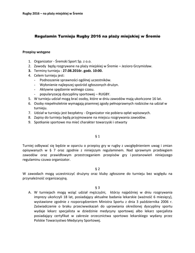 Regulamin Turnieju Rugby 2016 na plaży miejskiej