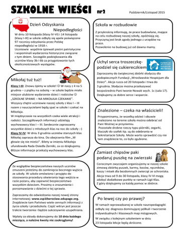 SZKOLNE WIEŚCI Dzień Odzyskania Niepodległości W dniu 10 listopada (klasy IV-VI) i 14 listopada (klasy I-III) w szkole odbyły się apele poświęcone 97 rocznicy odzyskania przez Polskę niepodległości w 1918 r. Uczniowie wspólnie śpiewali pieśni patriotyczne i wspominali wydarzenia historyczne związane z tym dniem. Szczególe podziękowania dla uczniów klasy 3b i 6b za przygotowanie tych okolicznościowych występów. Mikołaj tuż tuż! Klasy I-III: Znowu śpimy w szkole! W nocy z 4 na 5 grudnia – z piątku na sobotę – w szkole będzie miało miejsce ulubione wydarzenie dzieci i rodziców „SZKOLNE SPANIE – NA MIKOŁAJA CZEKANIE”. Wszyscy chętni uczniowie naszej szkoły z klas I – III razem z nauczycielami będą spać w szkole i czekać na Mikołaja. W międzyczasie na wszystkich czeka wiele atrakcji i radości. Szczegółowych informacji udzielają wychowawcy klas I – III. Serdecznie zapraszamy wszystkie dzieci z młodszych klas na noc do szkoły :-) Klasy IV-IV: W dniu 3 grudnia uczniów starszych klas Mikołaj zaprasza do kina. Do obejrzenia film „W głowie się nie mieści”. Bilety w imieniu Mikołaja ufundowała Rada Osiedla Żerniki, za co dziękujemy. Bliższe informacje przekażą wychowawcy klas. Ze względów bezpieczeństwa naszych uczniów zmuszeni jesteśmy do zamknięcia bocznego wyjścia ze szkoły. W szkole omówiono i przyjęto do stosowania procedury otwierania tego wejścia w razie pożaru, aby zapewnić bezpieczeństwo wszystkim dzieciom. Prosimy o zrozumienie i porozmawianie z dziećmi o tej sprawie. Zapraszamy do odwiedzania naszej nowej strony internetowej: www.zsp10wroclaw.edupage.org. Znajdziecie tam Państwo wiele cennych informacji z życia szkoły i przedszkola. Część witryn jest jeszcze trakcie tworzenia i będzie sukcesywnie uzupełniana. Wpłaty za obiady dokonujemy do 10 dnia każdego miesiąca, a należne kwoty nie zaokrąglamy! nr2 Październik/Listopad 2015 Szkoła w rozbudowie Z przykrością informuję, że prace budowlane, mające na celu rozbudowę naszej szkoły, opóźniają się. Przyczyną jest brak zgody jednego z urzędów na prace. Pozwolenie na budowę już od dawna mamy. Uchyl serca troszeczkępodziel się cukiereczkiem Zapraszamy do świątecznej zbiórki słodyczy dla podopiecznych Fundacji „Wrocławskie Hospicjum dla Dzieci”. Akcja rusza od 20 listopada i trwa do 3 grudnia. Słodycze można przekazywać bezpośrednio Pani Iwonie Nowak wych. 1c (sala 17). Dziękujemy za dobre serce i wsparcie. Znalezione – czeka na właścicieli! Przypominamy, że wszelką odzież i obuwie znalezione na terenie szkoły można odebrać od Pani Woźnej w przyziemiu. Pozostałe drobne rzeczy typu piórniki, zegarki, kluczyki do szafek itp. są do odebrania w Sekretariacie Szkoły. Może warto sprawdzić czy nie tam znajdziecie to, co było zgubione. Zamiast chipsów paki podaruj puszkę na zwierzaki Corocznym zwyczajem organizujemy w naszej szkole zimową zbiórkę puszek, karmy, koców, ręczników, kaszy i misek dla bezdomnych zwierząt ze schroniska. Akcja trwa od 9 do 30 listopada, klasy IV-VI mogą zdobyć dodatkowe punkty w ramach Ligii Klas. Z góry dziękujemy za każdą pomoc w zbiórce. Po lewej czy po prawej? W ramach wprowadzanej w szkole nauropedagogiki odbyły się: diagnoza dominującej półkuli i tworzenie indywidualnych i klasowych map mózgowych. W związku z kolejnym szkoleniem w dniu 23 listopada lekcje będą skrócone. SZKOLNE WIEŚCI nr2 Październik/Listopad 2015 Konkursy w naszej szkole Międzyświetlicowy Konkurs „ Jesienne impresje” organizowany przez naszą szkolną świetlicę rozstrzygnięty. Szczegóły na stornie internetowej szkoły- zakładka Świetlica. Gratulujemy wszystkim nagrodzonym i dziękujemy za nadesłane prace. Bieżące konkursy: Konkurs plastyczno-językowy HELLO SCOTLAND! dla klas I-III. Termin składania prac do 30 listopada. Ogólnopolski konkurs twórczości plastycznej „Niebo w kolorze – spotkanie z zorzą polarną”. Termin składania prac do 1 grudnia. Kategorie wiekowe uczestników konkursu 6-7 lat, 8-10 lat, 11-13 lat. Ogólnopolski konkurs plastyczny „Pieski w kredki”. Termin oddania prac do 10 grudnia. Prace można składać w grupach wiekowych: dzieci w wieku 6 lat, 7-9 lat, młodzież w wieku 10- 13 lat oraz 14-16 lat. Konkurs recytatorski „Wyraź siebie wierszem”- dla klas IV-VI. Konkurs odbędzie się 11 grudnia. Zgłoszenia u polonistów. Konkurs plastyczny Bombka Bożonarodzeniowa, dla klas I-III. Termin składnia prac do 14 grudnia u wychowawców klas. Konkurs plastyczny Anioł Bożonarodzeniowy, dla klas I-III. Termin składnia prac do 14 grudnia u wychowawców klas. Między szklony konkurs wiedzy o krajach anglo- i niemieckojęzycznych. Termin-1 grudnia. Zgłoszenia u nauczycieli języków obcych. Więcej informacji można znaleźć na nowych stronach internetowych szkoły lub w Librusie-Synergii ( Ogłoszenia). Kartka z kalendarza PAŹDZIERNIK Klasy I-III Wycieczka do Wyższej Szkoły Oficerskiej Wojsk Lądowych we Wrocławiu- klasy 2d i 2e. Uczniowie zwiedzali Salę Tradycji, Zakład Logistyki, gdzie widzieli pojazdy używane do celów szkoleniowych, Video-strzelnicę „Śnieżnik” oraz Zakład Łączności z radiostacjami krótkiego i długiego zasięgu, a także Zakład W-Fu. 26 X- Uroczyste pasowanie pierwszoklasistów na uczniów szkoły Wyjście w ramach projektu SWM do Teatru Lalek na Warsztaty „Wycieczka po teatrze”. Dodatkowo warsztaty z aktorem i ze scenografem„ Technika teatru lalkowego” i „Kolor w teatrze i jego znaczenie” . Również w ramach SWM zajęcia sportowe w Hasta La Vista. Klasy IV-VI 15 X - Przeprowadzenie szkolnego etapu konkursu „zDolny Ślązaczek” Udział wzięło 23 uczniów. 16 X-Warsztaty edukacyjne w Humanitarium -Profilaktyka spożywania alkoholu - klasy 6a i 6b. 24 X – Kilkuosobowa grupa uczniów z klas IV-VI pojechała do Parku Nauki i Techniki ExploraPark w Wałbrzychu. Uczest