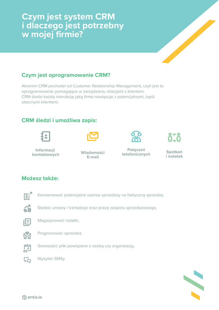 Czym jest system CRM i dlaczego jest potrzebny w mojej firmie? Czym jest oprogramowanie CRM? Akronim CRM pochodzi od Customer Relationship Management, czyli jest to oprogramowanie pomagające w zarządzaniu relacjami z klientem. CRM śledzi każdą interakcję jaką firma nawiązuje z potencjalnymi, bądź obecnymi klientami. CRM śledzi i umożliwa zapis: Informacji kontaktowych Wiadomości E-mail Połączeń telefonicznych Możesz także: Konwertować potencjalne szanse sprzedaży na faktyczną sprzedaż, Śledzić umowy i transakcje oraz pracę zespołu sprzedażowego, Magazynować notatki, Prognozować sprzedaż, Gromadzić pliki powiązane z osobą czy organizacją, Wysyłać SMSy. Spotkań i notatek Atuty systemu CRM Wszystkie dane masz w jednym miejscu (centralizacja) CRM trzyma całą informację o ofercie, transakcji w jednym miejscu dlatego nie musisz przeszukiwać wielu miejsc, aby odtworzyć historię wszystkich interakcji z klientem. Standaryzacja danych Dane trzymane są według jednego standardu zapisu. Każdy sprzedawca może mieć inny sposób prowadzenia swojej pracy. CRM niweluje tę różnorodność i gwarantuje spójność i szybki podgląd kondycji Twojej firmy. Możliwość skalowania Ręczne śledzenie każdej interakcji z klientem jest możliwe w sytuacji gdy masz ich kilku i jednego pracownika. Kiedy się rozwijasz, proszenie pracowników aby manualnie wprowadzali wszystkie dane do np. Excela (spędzając przy tym długie godziny) nie jest efektywnym wykorzystaniem ich czasu pracy. Czy potrzebujesz CRMa? Krótka odpowiedź: TAK! Wykorzystywanie Excela jako narzędzia CRM może na razie wystarczać, ale szybko stanie się uciążliwe kiedy Twój zespół sprzedażowy oraz baza klientów będzie rosła. Jeżeli zamierasz się rozwijać, to potrzebujesz narzędzia które rozwija się razem z Tobą. Dlatego nawet w małych firmach użycie CRM-a to bardzo dobry wybór. Funkcjonalności których powinieneś oczekiwać w CRM-ach Każdy biznes ma inne potrzeby ale niektóre funkcją są uniwersalne i niezbędne: Informacje kontaktowe Robienie notatek wewnątrz systemu Obsługa plików Podgląd lejka sprzedażowego Widok linii czasu pełnej interakcji z klientem Raporty sprzedaży Kalendarz aktywności i spotkań Eksport danych