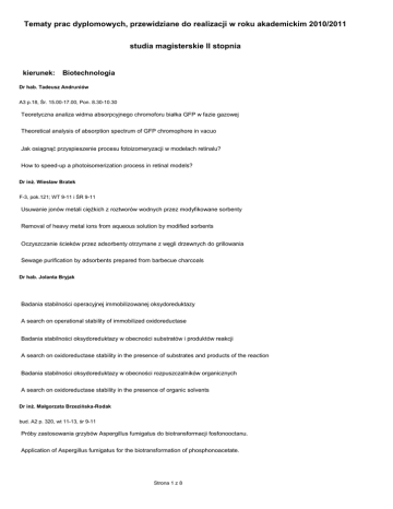 Tematy prac dyplomowych, przewidziane do realizacji w roku akademickim 2010/2011 studia magisterskie II stopnia kierunek: Biotechnologia Dr hab. Tadeusz Andruniów A3 p.18, Śr. 15.00-17.00, Pon. 8.30-10.30 Teoretyczna analiza widma absorpcyjnego chromoforu białka GFP w fazie gazowej Theoretical analysis of absorption spectrum of GFP chromophore in vacuo Jak osiągnąć przyspieszenie procesu fotoizomeryzacji w modelach retinalu? How to speed-up a photoisomerization process in retinal models? Dr inŜ. Wiesław Bratek F-3, pok.121; WT 9-11 i ŚR 9-11 Usuwanie jonów metali cięŜkich z roztworów wodnych przez modyfikowane sorbenty Removal of heavy metal ions from aqueous solution by modified sorbents Oczyszczanie ścieków przez adsorbenty otrzymane z węgli drzewnych do grillowania Sewage purification by adsorbents prepared from barbecue charcoals Dr hab. Jolanta Bryjak Badania stabilności operacyjnej immobilizowanej oksydoreduktazy A search on operational stability of immobilized oxidoreductase Badania stabilności oksydoreduktazy w obecności substratów i produktów reakcji A search on oxidoreductase stability in the presence of substrates and products of the reaction Badania stabilności oksydoreduktazy w obecności rozpuszczalników organicznych A search on oxidoreductase stability in the presence of organic solvents Dr inŜ. Małgorzata Brzezińska-Rodak bud. A2 p. 320, wt 11-13, śr 9-11 Próby zastosowania grzybów Aspergillus fumigatus do biotransformacji fosfonooctanu. Application of Aspergillus fumigatus for the biotransformation of phosphonoacetate. Strona 1 z 8 Zastosowanie grzybów Beauveria sp. do utleniania chiralnych hydroksyfosfonianów. Application of Beauveria sp. for the oxidation of chiral hydroxyphosphonates. Próby zastosowania grzybów z rodzaju Beauveria do biotransformacji fosfonooctanu. Application of Beauveria species for the biotransformation of phosphonoacetate. Dr hab. inŜ. Piotr Dobryszycki budynek F-4, pokój C-8, PN 14-15, ŚR 12-15 Poszukiwanie minimalnego fragmentu odpowiedzialnego za aktywność biomineralizacyjną białka Starmaker Searching the minimal fragment responsibile for the biomineralization activity of the Starmaker protein. Dr inŜ. Marcin Drąg Specyficzne substraty metaloproteaz uczestniczących w rozwoju nowotworów Specific substrates for metalloproteases participating in the cancer development Specyficzne substraty proteaz serynowych uczestniczących w rozwoju nowotworów Specific substrates for serine proteases participating in the cancer development Dr inŜ. Robert Góra Pokój 17 budynek A2, wtorek i piątek w godz. 13-15 Theoretical studies of the mechanism of nucleotides formation in prebiotically plausible conditions Teoretyczne badania mechanizmu powstawania nukleotydów w warunkach prebiotycznych Dr Agnieszka Grabowiecka pon, wt, śr. 10-12 p.324 lub 311 bud. A2 Charakterystyka bakteryjnej 'kwaśnej' ureazy izolowanej z rodzaju Lactobacillus. Isolation and characteristics of acid urease from genus Lactobacillus. Badanie podatności związków hamujących enzymatyczny rozkład mocznika na hydrolizę i mikrobiologiczną degradację. Susceptibility of urease inhibitors to hydrolysis and microbial degradation. Dr inŜ. Michał Jewgiński A2 322A, Wt. 10-12, Czw. 11-13 Komputerowe modelowanie oddziaływania beta-aminoalkilofosfonowy pochodnych azobenzenu z jonami metali. Molecular modeling of interaction of beta-aminoalkylphosphonates derivatives of azobenzen with metal ions. Strona 2 z 8 Zastosowanie modelowania molekularnego do projektowania inhibitorów katepsyny C. Application of molecular modelling to design inhibitors of cathepsin C. Zastosowanie spektroskopii 31P NMR w badaniach oddziaływania fosfonowych analogów aminokwasów z LAP. Application of 31P NMR spectroscopy for investigation of phosphonate analogs of amino acids and LAP interactions Fotoprzełączalne beta-aminofosfoniany - potencjalne inhibitory metaloproteaz - określenie zdolności kompleksowania jonów metali. Photo-switchable beta-aminophosphonates -potential inhibitors of metaloproteases - determination of abilities to complex of metal ions. Badanie oddziaływania fosfonowych pochodnych azobenzenu z jonami metali. Investigation of interaction of phosphonate derivatives of azobenzen with metal ions. Dr inŜ. Paweł Kędzierski A3 301A, Śr 13-15 i Czw 11-13 Teoretyczne przewidywanie efektów miejscowych mutacji białka Theoretical prediction of effects of site-directed protein mutagenesis Modelowanie kompleksów białko-ligand metodami dynamiki molekularnej Modeling of protein-ligand complexes using molecular dynamics method Zastosowania metod analizy filogenetycznej Applications of phylogenetic analysis methods Dr inŜ. Magdalena Klimek-Ochab Próby zastosowania grzybów z rodzaju Penicillium do biotransformacji fosfonooctanów. The application of Penicillium strains for the biotransformation of phosphonoacetates. Optymalizacja metod oznaczania aktywności lipolitycznej u drobnoustrojów. Evaluation of lipolytic activity of microbial cells Optymalizacja metod oznaczania aktywności lipolitycznej u grzybów. Evaluation of lipolytic activity of fungal cells dr Iwona Kochanowska Identyfikacja i oznaczanie biologicznej aktywności dwóch lizoform rekombinacyjnych białek morfogenetycznych ekspresjonowanych przez transformowane ludzkimi genami BMP-2 i BMP4 droŜdŜe szczepu Yarrowia lipolytica Identification and determination of biological activity of two isoforms of recombinant bone morphogenetic proteins expressed in Yarrowia lipolytica yeasts transformed by human genes BMP-2 and BMP-4 Strona 3 z 8 Prof. dr hab. Ludwik Komorowski Poniedziałek 13-15, pok. 315 A-3 Modelowanie numeryczne hipercykli w reakcjach chemicznych: zjawiska selekcji i mutacji. Numerical modeling of hypercycles in chemical reactions: selection and mutation phenomena dr Agnieszka Korzeniowska-Kowal Badania nad ustaleniem warunków stabilizacji bakteriofaga fiK1 Research on establishi