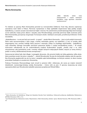 Maria Kownacka | streszczenia dramatów | opracowała: Katarzyna Kułakowska Maria Kownacka „Małe laleczki, mimo swej niepozorności i często naiwnych kształtów, mają ogromne znaczenie wychowawcze”. To właśnie za sprawą Marii Kownackiej powstał na warszawskim Żoliborzu Teatr Baj, obecnie najstarszy zawodowy teatr lalek w Polsce. Pierwsze wystawiane w Baju spektakle inspirowane były polską szopką kukiełkową, z czasem zaczęto inscenizować bajki i wiersze. Na zamówienie przedwojennego Baja kierowanego aż do wybuchu wojny przez aktora i muzyka, Jana Wesołowskiego, powstały pierwsze bajki sceniczne pióra Marii Kownackiej, począwszy od gawędy O strasznym smoku i dzielnym szewczyku, prześlicznej królewnie i królu Gwoździku. „Kukiełkarstwo – to nie jest fach ani zawód – to pasja” – pisała Maria Kownacka – „Jest w tych małych stworach, które sami wyczarowujemy z byle czego, z korka, ziemniaka, gazety, czy makówki (...) coś, co urzeka, jakiś nieprzeparty czar, swoisty wdzięk, który porywa i zniewala, robiąc ze zwykłego śmiertelnika – kukiełkarza, czyli człowieka, którego nierzadko otoczenie pomawiać będzie o rodzaj nieszkodliwej manii…”. W swojej twórczości odwoływała się do wielowiekowej tradycji krakowskich szopek: „chodzi więc o to, żeby utrzymawszy cały groteskowy urok i swoisty wdzięk naszych tradycyjnych kukieł, nasycić je nową treścią i podać w nowej, udoskonalonej formie zewnętrznej”1. Zazwyczaj jej teksty były zbyt długie i wymagały skracania. „Bo przecież kukły nie lubią gadaniny, tylko akcje, która powinna toczyć się żywo i szparko”2 – mówił Wesołowski. Na tym tle dochodziło między nimi do sporów. Raz Kownacka pogniewała się nie na żarty i zażądała sądu koleżeńskiego, na którym uznano, że skoro można przerabiać Szekspira, to można też i Kownacką. Podczas Powstania Warszawskiego teatr stracił w pożarze lalki i dekoracje, ale zaraz po wojnie wznowił działalność, wystawiając kolejną sztukę Kownackiej – Cztery mile za piec. O oprawę muzyczną jej sztuk najczęściej dbał sam Wesołowski, kukiełki natomiast projektował Witold Miller. 1 Maria Kownacka, Do Kukiełkarzy. Wstęp [w:] Stanisław Iłowski, Teatr kukiełkowy. Podręcznik praktyczny, Spółdzielnia Wydawnicza SZTUKA, Warszawa 1949, s. 5-6. 2 Jan Wesołowski [w:] Plastusiowa mama. Wspomnienia o Marii Kownackiej, zebrała i oprac. Mariola Pryzwan, PIW, Warszawa 2009, s. 53. 1 Maria Kownacka | streszczenia dramatów | opracowała: Katarzyna Kułakowska Tytuł Wydawnictwo Miejsce i rok wydania Typ Słowa klucze Wystawienia Bajowe bajeczki i świerszczykowi skrzypeczki, czyli o straszliwym smoku i dzielnym szewczyku, prześlicznej królewnie i królu Gwoździku Nasza Księgarnia Warszawa 1935, 1949 Sztuka dla dzieci | teatrzyk kukiełkowy | bajka | gawęda królewna | Baba Jaga | smok | siedmiomilowe buty | zaczarowany las | Łysa Góra | zaczarowane gęśle | Szewczyk Dratewka Sztuka wystawiana wielokrotnie („przeszło sto razy” czytamy w przedmowie do dramatu) przez Teatr Kukiełek „BAJ” R.T.P.D na Żoliborzu z opracowaniem muzycznym Jana Wesołowskiego. Cieszyła się też powodzeniem w zespołach prowincjonalnych. „Za górami, za lasami, był sobie kraj nad krajami. A w tym kraju każda rzeka była z miodu albo z mleka. A w tym kraju wszystkie góry były z pysznej konfitury” – zaczyna opowieść Baj skupiając wokół siebie zaciekawione dzieci, niczym wiejska bajarka czy zakopiański gawędziarz Sabała. To właśnie gawędę wybrała zafascynowana polską tradycją Kownacka jako najlepszy sposób na snucie opowieści, której odbiorcami są dzieci. „Gawęda jest to zadanie specjalne i bardzo różnorodne”3 – pisał Jan Wesołowski, dyrektor artystyczny przedwojennego Teatru Baj. Gawędziarz bowiem nie tylko pełni rolę narratora, lecz także wyjaśnia zawiłości fabuły, wzmacnia ciekawość, zapewnia łączność między widownią a sceną angażując dzieci w konstruowanie opowieści, dopytując o zachowania poszczególnych bohaterów czy też zachęcając do wspólnego śpiewania piosenek, wypowiadania zaklęć, wołania zagubionych postaci. „Nie chcemy, żeby rampa dzieląca widownię od sceny, była jak wał średniowiecznej twierdzy, nie do przebycia” – pisała Maria Kownacka – „przeciwnie chcemy, żeby (…) dzieckowidz mogło podbiec do scenki i bohatera sztuki pociągnąć za nos”4. Baj, „stary, miły dziadek (…) w czapce, krasnym kaftanie i żółtych chodakach”, przechowuje bajki w wielkim worku, z którego raz po raz dochodzi głos awantury: to smok domaga się, żeby królewna się posunęła, to znowuż królewna narzeka, że niedługo zostanie zgnieciona. Gdy tylko nastanie wieczór, a wraz z nim przyjdzie „kumcia Szara Godzinka”, dzieci gromadzą się wokół kominka, a Baj wyciąga z worka jedną z bajek. Tym razem sięgnął po opowieść o królewnie i dzielnym szewczyku. Pewnego dnia córka króla Gwoździka, „takiego z tych dobrych, baśniowych króli”, przepiękna królewna spotyka w ogrodzie Babę Jagę rodem z Łysej Góry, która proponuje jej wędrówkę do zaczarowanego lasu. Wiedząc, że królewnę fascynują kwiaty, obiecuje, że w zaczarowanym lesie znajdzie takie, które zapewnią jej długowieczność. Królewna nie daje się nabrać słowom czarownicy. „Idź precz, wstrętne twoje czary” – wykrzykuje – „Nie chcę nic od tej poczwary!”. Rozjuszona Baba Jaga wzywa na pomoc smoka, który porywa królewnę. Widząc to Ochmistrzyni woła trębaczy, by o zajściu trąbili w cztery strony świata: „Trąbcie wnet z najwyższej wieży, niech tu pędzi pułk rycerzy”. Rycerz, który stoczy zwycięską walkę ze smokiem, otrzyma w nagrodę rękę królewny i pół królestwa. Jednym z wyruszających na ratunek królewnie jest Szewczyk Dratewka. Na swojej drodze spotyka czarnego kota, który pilnuje domku 