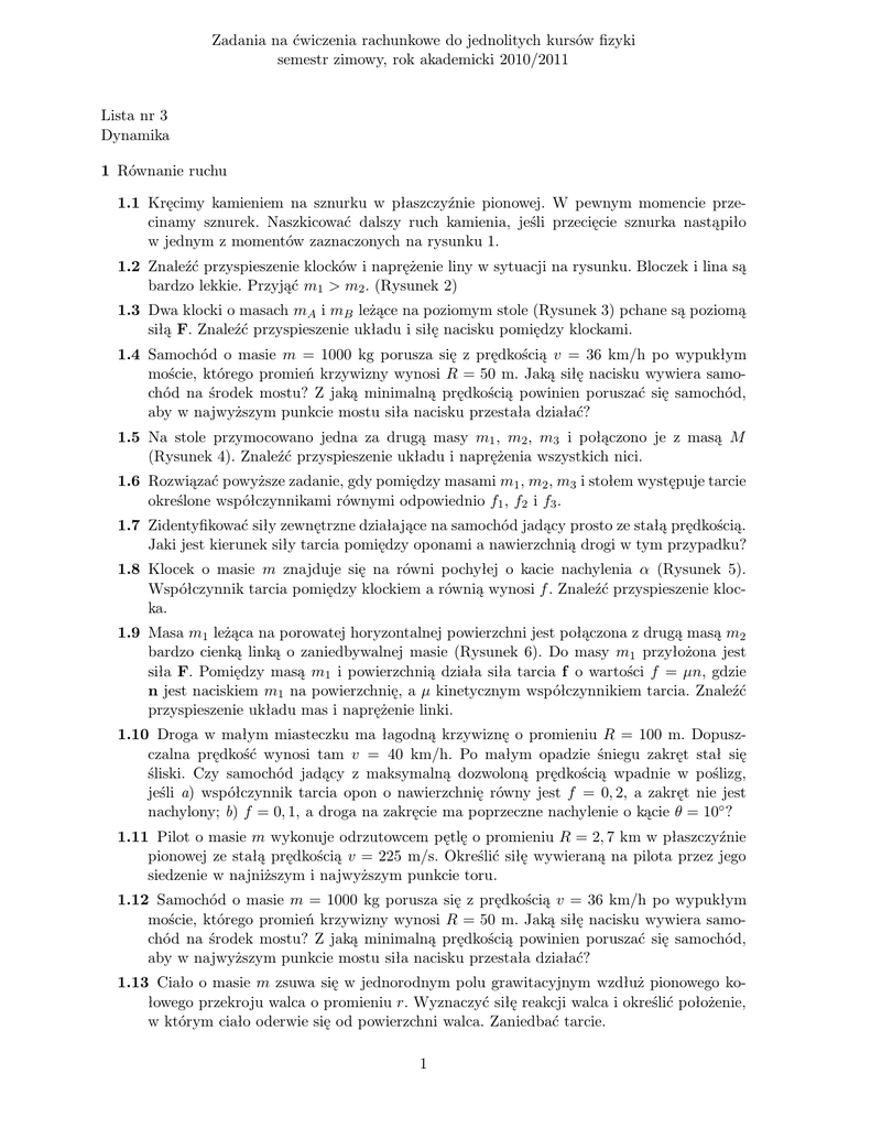 Zadania na ćwiczenia rachunkowe do jednolitych kursów fizyki semestr zimowy, rok akademicki 2010/2011 Lista nr 3 Dynamika 1 Równanie ruchu 1.1 Kręcimy kamieniem na sznurku w płaszczyźnie pionowej. W pewnym momencie przecinamy sznurek. Naszkicować dalszy ruch kamienia, jeśli przecięcie sznurka nastąpiło w jednym z momentów zaznaczonych na rysunku 1. 1.2 Znaleźć przyspieszenie klocków i naprężenie liny w sytuacji na rysunku. Bloczek i lina są bardzo lekkie. Przyjąć m1 > m2 . (Rysunek 2) 1.3 Dwa klocki o masach mA i mB leżące na poziomym stole (Rysunek 3) pchane są poziomą siłą F. Znaleźć przyspieszenie układu i siłę nacisku pomiędzy klockami. 1.4 Samochód o masie m = 1000 kg porusza się z prędkością v = 36 km/h po wypukłym moście, którego promień krzywizny wynosi R = 50 m. Jaką siłę nacisku wywiera samochód na środek mostu? Z jaką minimalną prędkością powinien poruszać się samochód, aby w najwyższym punkcie mostu siła nacisku przestała działać? 1.5 Na stole przymocowano jedna za drugą masy m1 , m2 , m3 i połączono je z masą M (Rysunek 4). Znaleźć przyspieszenie układu i naprężenia wszystkich nici. 1.6 Rozwiązać powyższe zadanie, gdy pomiędzy masami m1 , m2 , m3 i stołem występuje tarcie określone współczynnikami równymi odpowiednio f1 , f2 i f3 . 1.7 Zidentyfikować siły zewnętrzne działające na samochód jadący prosto ze stałą prędkością. Jaki jest kierunek siły tarcia pomiędzy oponami a nawierzchnią drogi w tym przypadku? 1.8 Klocek o masie m znajduje się na równi pochyłej o kacie nachylenia α (Rysunek 5). Współczynnik tarcia pomiędzy klockiem a równią wynosi f . Znaleźć przyspieszenie klocka. 1.9 Masa m1 leżąca na porowatej horyzontalnej powierzchni jest połączona z drugą masą m2 bardzo cienką linką o zaniedbywalnej masie (Rysunek 6). Do masy m1 przyłożona jest siła F. Pomiędzy masą m1 i powierzchnią działa siła tarcia f o wartości f = µn, gdzie n jest naciskiem m1 na powierzchnię, a µ kinetycznym współczynnikiem tarcia. Znaleźć przyspieszenie układu mas i naprężenie linki. 1.10 Droga w małym miasteczku ma łagodną krzywiznę o promieniu R = 100 m. Dopuszczalna prędkość wynosi tam v = 40 km/h. Po małym opadzie śniegu zakręt stał się śliski. Czy samochód jadący z maksymalną dozwoloną prędkością wpadnie w poślizg, jeśli a) współczynnik tarcia opon o nawierzchnię równy jest f = 0, 2, a zakręt nie jest nachylony; b) f = 0, 1, a droga na zakręcie ma poprzeczne nachylenie o kącie θ = 10◦ ? 1.11 Pilot o masie m wykonuje odrzutowcem pętlę o promieniu R = 2, 7 km w płaszczyźnie pionowej ze stałą prędkością v = 225 m/s. Określić siłę wywieraną na pilota przez jego siedzenie w najniższym i najwyższym punkcie toru. 1.12 Samochód o masie m = 1000 kg porusza się z prędkością v = 36 km/h po wypukłym moście, którego promień krzywizny wynosi R = 50 m. Jaką siłę nacisku wywiera samochód na środek mostu? Z jaką minimalną prędkością powinien poruszać się samochód, aby w najwyższym punkcie mostu siła nacisku przestała działać? 1.13 Ciało o masie m zsuwa się w jednorodnym polu grawitacyjnym wzdłuż pionowego kołowego przekroju walca o promieniu r. Wyznaczyć siłę reakcji walca i określić położenie, w którym ciało oderwie się od powierzchni walca. Zaniedbać tarcie. 1 1.14 Ciało o masie m porusza się po paraboli umieszczonej w jednorodnym polu grawitacyjnym. Wyznaczyć siłę reakcji paraboli. Rozważyć następujące parabole: a) y = px2 , b) y = −px2 , c) y 2 = px, gdzie p > 0. 1.15 Z jaką szybkością v powinna poruszać się po okręgu o promieniu r masa m, aby układ był w równowadze, jeśli M > m (Rysunek 7)? Rysunek 1: Rysunek 2: m1 m3 m2 M Rysunek 3: Rysunek 4: F θ m1 m2 Rysunek 5: Rysunek 6: m M r v Rysunek 7: ——————————————————————————————— 12 października 2010 Zadania zebrał Grzegorz Harań 2