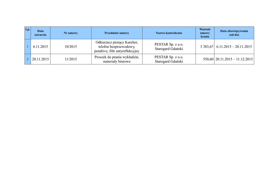 Lp. Data zawarcia Wartość umowy brutto Data obowiązywania (od-do) Nr umowy Przedmiot umowy Nazwa kontrahenta PESTAR Sp. z o.o. Starogard Gdański 3 383,67 6.11.2015 – 20.11.2015 PESTAR Sp. z o.o. Starogard Gdański 550,60 20.11.2015 – 11.12.2015 1 6.11.2015 10/2015 Odkurzacz piorący Karcher, telefon bezprzewodowy, pendrive, filtr antyrefleksyjny 2 20.11.2015 11/2015 Proszek do prania wykładzin, materiały biurowe