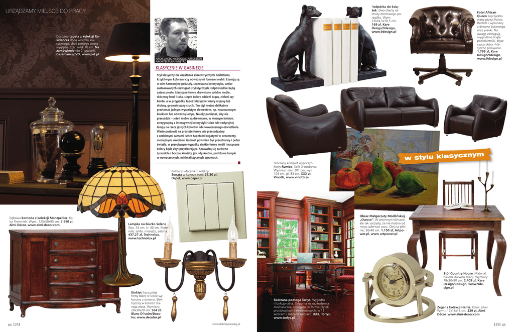 Podpórka do książek. Dwa charty na straży domowego porządku. Wym: 23x24,5x10,5 cm. 169 zł, Kare Design/9design, www.9design.pl URZĄDZAMY MIEJSCE DO PRACY Fotel African Queen zaprojektowany przez Franca Bentelli i wykonany z drewna bukowego oraz pianki. Na uwagę zasługują oryginalnie ścięte podłokietniki, błyszcząca skóra i klasyczne pikowanie. 1.799 zł, Kare Design/9design, www.9design.pl Dostojna tapeta z kolekcji Residences doda wnętrzu klasycznego, choć pełnego ciepła wyglądu. Szer. rolek 70 cm. Na zamówienie (do 2 tygodni), Casamance/JVD, www.jvd.pl ARCH. JACEK NIEZGODA, ARTDESIGN ARCHITEKTURA WNĘTRZ KLASYCZNIE W GABINECIE Styl klasyczny nie oszałamia ekscentrycznymi dodatkami, krzykliwymi kolorami czy odważnymi formami mebli. Esencją są w nim harmonijne podziały, stonowana kolorystyka, umiar zastosowanych rozwiązań stylistycznych. Odpowiednie będą zatem proste, klasyczne formy, drewniane solidne meble, skórzany fotel i sofa, ciepłe kolory odcieni brązu, zieleni czy bordo, a w przypadku tapet: klasyczne wzory w pasy lub drobny, geometryczny rzucik. Ten styl można delikatnie przełamać jednym wyrazistym elementem, np. nowoczesnym biurkiem lub odważną lampą. Należy pamiętać, aby nie przesadzić – jeżeli meble są drewniane, w mocnym kolorze, zrezygnujmy z intensywnej kolorystyki ścian lub tradycyjnej lampy na rzecz jasnych kolorów lub nowoczesnego oświetlenia. Warto postawić na prostotę formy, nie przesadzajmy z ozdobnymi ramami luster, tapetami bogatymi w ornamenty, mosiężnymi okuciami. Gabinet powinien być przestronny i pełen światła, w przeciwnym wypadku ciężkie formy mebli i nasycone kolory będą zbyt przytłaczające. Sprawdzą się zarówno żyrandole i boczne kinkiety, jak i dyskretne, punktowe lampki w nowoczesnych, minimalistycznych oprawach. Potrójny włącznik z kolekcji Sonata w kolorze ecru. 21,30 zł, Ospel, www.ospel.pl Dębowa komoda z kolekcji Montpellier. Kolor Flemmish. Wym.: 125x50x95 cm. 7.990 zł, Almi Décor, www.almi-decor.com Skórzany komplet wypoczynkowy Rumba. Sofa 3-osobowa. Wymiary: szer. 201 cm, wys. 103 cm, gł. 83 cm. XXX zł, Vinotti, www.vinotti.eu znym w stylu klasyc Obraz Małgorzaty Modlińskiej „Owoce”. W jesiennym klimacie, ale tak soczysty, że nie można od niego oderwać oczu. Olej na płótnie, 30x40 cm. 1.150 zł, Artpower.pl, www artpower.pl Lampka na biurko Selene. Wys. 53 cm, śr. 40 cm. Materiały: szkło, mosiądz, patyna. 437,27 zł, Technolux, www.technolux.pl Stół Country House. Materiał: bielone drewno akacji. Wymiary: 78x90x90 cm. 2.409 zł, Kare Design/9design, www.9design.pl Kinkiet francuskiej firmy Blanc D’ivoire wykonany z drewna. Elektryczny w kolorze starego złota. Wymiary: 26x30x20 cm. 564 zł, Blanc D’ivoire/Decolor, www.decolor.pl 64 DM Skórzana podłoga Torlys. Wygodna i funkcjonalna. Odporna na uszkodzenia mechaniczne. Dostępna w formie płytek prostokątnych i kwadratowych, w 12 wzorach i różnych kolorach. XXX, Torlys, www.torlys.pl www.dobrzemieszkaj.pl Zegar z kolekcji Harris. Kolor: silver. Wym.: 17x16x13 cm. 229 zł, Almi Décor, www.almi-decor.com DM 65