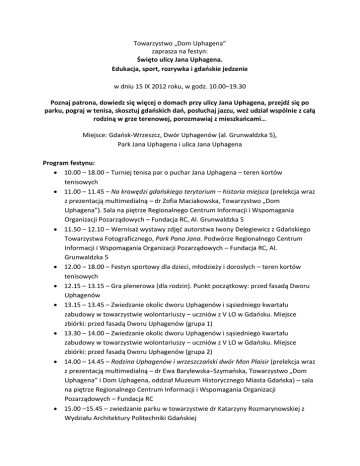 Towarzystwo „Dom Uphagena” zaprasza na festyn: Święto ulicy Jana Uphagena. Edukacja, sport, rozrywka i gdańskie jedzenie w dniu 15 IX 2012 roku, w godz. 10.00–19.30 Poznaj patrona, dowiedz się więcej o domach przy ulicy Jana Uphagena, przejdź się po parku, pograj w tenisa, skosztuj gdańskich dań, posłuchaj jazzu, weź udział wspólnie z całą rodziną w grze terenowej, porozmawiaj z mieszkańcami… Miejsce: Gdańsk-Wrzeszcz, Dwór Uphagenów (al. Grunwaldzka 5), Park Jana Uphagena i ulica Jana Uphagena Program festynu: 10.00 – 18.00 – Turniej tenisa par o puchar Jana Uphagena – teren kortów tenisowych 11.00 – 11.45 – Na krawędzi gdańskiego terytorium – historia miejsca (prelekcja wraz z prezentacją multimedialną – dr Zofia Maciakowska, Towarzystwo „Dom Uphagena”). Sala na piętrze Regionalnego Centrum Informacji i Wspomagania Organizacji Pozarządowych – Fundacja RC, Al. Grunwaldzka 5 11.50 – 12.10 – Wernisaż wystawy zdjęć autorstwa Iwony Delegiewicz z Gdańskiego Towarzystwa Fotograficznego, Park Pana Jana. Podwórze Regionalnego Centrum Informacji i Wspomagania Organizacji Pozarządowych – Fundacja RC, Al. Grunwaldzka 5 12.00 – 18.00 – Festyn sportowy dla dzieci, młodzieży i dorosłych – teren kortów tenisowych 12.15 – 13.15 – Gra plenerowa (dla rodzin). Punkt początkowy: przed fasadą Dworu Uphagenów 13.15 – 13.45 – Zwiedzanie okolic dworu Uphagenów i sąsiedniego kwartału zabudowy w towarzystwie wolontariuszy – uczniów z V LO w Gdańsku. Miejsce zbiórki: przed fasadą Dworu Uphagenów (grupa 1) 13.30 – 14.00 – Zwiedzanie okolic dworu Uphagenów i sąsiedniego kwartału zabudowy w towarzystwie wolontariuszy – uczniów z V LO w Gdańsku. Miejsce zbiórki: przed fasadą Dworu Uphagenów (grupa 2) 14.00 – 14.45 – Rodzina Uphagenów i wrzeszczański dwór Mon Plaisir (prelekcja wraz z prezentacją multimedialną – dr Ewa Barylewska–Szymańska, Towarzystwo „Dom Uphagena” i Dom Uphagena, oddział Muzeum Historycznego Miasta Gdańska) – sala na piętrze Regionalnego Centrum Informacji i Wspomagania Organizacji Pozarządowych – Fundacja RC 15.00 –15.45 – zwiedzanie parku w towarzystwie dr Katarzyny Rozmarynowskiej z Wydziału Architektury Politechniki Gdańskiej 15.45 – 16.15 – Gra plenerowa (dla rodzin). Punkt początkowy: przed fasadą Dworu Uphagenów 16.00 – 16.45 – Zwiedzanie okolic dworu Uphagenów i sąsiedniego kwartału zabudowy w towarzystwie wolontariuszy – uczniów z V LO w Gdańsku. Miejsce zbiórki: przed fasadą Dworu Uphagenów (grupa 3) – miejsce zbiórki: przed fasadą Dworu Uphagenów 16.15 – 17.00 – Zwiedzanie okolic dworu Uphagenów i sąsiedniego kwartału zabudowy w towarzystwie wolontariuszy – uczniów z V LO w Gdańsku. Miejsce zbiórki: przed fasadą Dworu Uphagenów (grupa 4) – miejsce zbiórki: przed fasadą Dworu Uphagenów 17.00 – 18.00 – Spotkanie z najstarszymi mieszkańcami ulicy Jana Uphagena (rozmowę prowadzi red. Katarzyna Korczak). Miejsce: Gdański Klub Biznesu, ul. Uphagena 23 18.15 – 19.15 – Koncert muzyki jazzowej (obowiązują zaproszenia), Studio koncertowe Radia Gdańsk, Maciej Strzelczyk Trio The Great American and Brasilian Songbook Czołowy polski i europejski skrzypek jazzowy Maciej Strzelczyk stworzył niepowtarzalny projekt jazzowy pt. The Great American and Brasilian Songbook. To najbardziej znane na całym świecie hity amerykańskiej i brazylijskiej muzyki rozrywkowej z lat 40., 50. i 60. XX w. opracowane na skrzypce fortepian i kontrabas. Maciej Strzelczyk TRIO tworzą trzej wirtuozi : Maciej Strzelczyk - skrzypce Jarosław Małys - piano Piotr Rodowicz - kontrabas PRZEZ CAŁY CZAS TRWANIA ŚWIĘTA ULICY (W GODZ. 11.00 –18.00) DOSTĘPNE BĘDĄ: Wystawa plenerowa: historia posiadłości państwa Uphagenów i parku im. Jana Uphagena na podwórzu Regionalnego Centrum Informacji i Wspomagania Organizacji Pozarządowych Wystawa zdjęć autorstwa Iwony Delegiewicz z Gdańskiego Towarzystwa Fotograficznego – podwórze Regionalnego Centrum Informacji i Wspomagania Organizacji Pozarządowych – Fundacja RC Wśród 25 fotografii składających się na wystawę znajdzie się kilka kreacyjnych z udziałem osób w strojach stylizowanych na dawne ubiory. W czasie festynu w okolicach Dworu Uphagenów i Parku Jana Uphagena spotkać będzie można damy ze zdjęć, gosposię powracająca z targu, ogrodnika, ślubna parę wracającą z fotograficznego atelier czy też tenisistki. Zajęcia plastyczne dla dzieci – przygotowane przez Stowarzyszenie Nadbałtyckie Plastyków im. Mariana Mokwy. Sala na parterze Regionalnego Centrum Informacji i Wspomagania Organizacji Pozarządowych – Fundacja RC (możliwość pozostawienia dzieci pod opieką na czas prelekcji lub zwiedzania). W programie zajęć: PRZEDSTAWIENIA BAŚNI GDAŃSKICH / w strojach historycznych / - godz 11.00 Legenda o Stolemie – opowiadanie - godz 12.00 Legenda o cudownym źródle – inscenizacja - godz 13.00 Legenda o wieży Jacek – opowiadanie - godz 14.00 Legenda o Stolemie – opowiadanie - godz 15.00 Legenda o cudownym źródle – inscenizacja - godz 16.00 Legenda o wieży Jacek – opowiadanie Między w/w przedstawieniami: malowanie legend z wyobraźni, malowanie buzi, malowanie wspólnego obrazu - panoramy Gdańska, zabawa z papierem-origami „Gdański stragan” (sprzedaż wydawnictw, wyrobów artystycznych, pamiątek) Gdańskie dania (wg. przepisów z gdańskich książek kucharskich) – przygotowuje Kapituła Gdańskie Smaki – lokalizacja punktu gastronomicznego podwórze Dworu Uphagenów Loteria fantowa na rzecz Hospicjum im. Ks. Eugeniusza Dutkiewicza SAC w Gdańsku – zbiórka w czasie całego festynu. Realizacja losów – teren kortów tenisowych Minimalna wartość losu wynosi 5 zł, mile widziana każda hojna wpłata. Każdy los wygrywa!!! Wśród nagród znajdą się między innymi interesujące wydawnictwa Muzeum Narodowego w Gdańs
