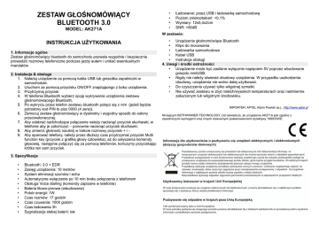 ZESTAW GŁOŚNOMÓWIĄCY BLUETOOTH 3.0 MODEL: AK271A • • • • Ładowanie: przez USB i ładowarkę samochodową Poziom zniekształceń: <0,1% Wymiary: 12x5,4x2cm SNR: >90dB W zestawie: INSTRUKCJA UŻYTKOWANIA 1. Informacje ogólne Zestaw głośnomówiący bluetooth do samochodu pozwala wygodnie i bezpiecznie prowadzić rozmowy telefoniczne podczas jazdy autem i unikać ewentualnych mandatów. 2. Instalacja & obsługa 1. Naładuj urządzenie za pomocą kabla USB lub gniazdka zapalniczki w samochodzie. 2. Uruchom za pomocą przycisku ON/OFF znajdującego z boku urządzenia. 3. Przytrzymaj przycisk 4. W telefonie Bluetooth wybierz opcję wykrywania urządzenia zestawu głośnomówiącego Bluetooth. 5. Po wykryciu przez telefon zestawu bluetooth połącz się z nim (jeżeli będzie potrzebny kod PIN to pisz 0000 (4 zera)). 6. Zamocuj zestaw głośnomówiący w dyskretny i wygodny sposób do osłony przeciwsłonecznej. 7. Aby odebrać nadchodzące połączenie należy nacisnąć przycisk słuchawki, w telefonie aby je zakończyć – ponownie nacisnąć przycisk słuchawki. 8. Aby zmienić głośność naciśnij w trakcie rozmowy przyciski + i -. 9. Aby sparować telefony, należy przez dłuższy czas przytrzymać przycisk Multi function key (przycisk z grafiką głowy człowieka), aż do usłyszenia komendy głosowej, następnie połączyć się za pomocą telefonów, kończymy przyciskając krótko ten sam przycisk. 3. Specyfikacja • • • • • • • • • • • Bluetooth: 3.0 + EDR Zasięg urządzenia: 10 metrów System eliminacji szumów i echa Automatyczne wyłączenie po 10 min braku połączenia z telefonem Obsługa Voice dialling (komendy zapisane w telefonie) Bateria litowo-jonowa (wbudowana) Pobór energii: 1W Czas rozmów: 17 godzin Czas czuwania: 1000 godzin Czas ładowania 3h Sygnalizacja słabej baterii: tak • Urządzenie głośnomówiące Bluetooth • Klips do mocowania • Ładowarka samochodowa • Kabel USB • Instrukcja obsługi 4. Uwagi i środki ostrożności • Urządzenie może być zasilane wyłącznie napięciem 5V poprzez wbudowane gniazdo miniUSB. • Nigdy nie należy otwierać obudowy urządzenia. W przypadku uszkodzenia obudowy, urządzenia nie wolno dalej użytkować. • Do czyszczenia używać tylko wilgotnej szmatki. • Nie używać zestawu w zbyt niskich/wysokich temperaturach oraz nadmiernie zakurzonym lub wilgotnym środowisku. IMPORTER: APTEL Adam Pawlak sp.j., http://www.aptel.pl Niniejszym BOTHWINNER TECHNOLOGY, Ltd oświadcza, że urządzenie AK271A jest zgodne z zasadniczymi wymogami oraz innymi stosownymi postanowieniami dyrektywy 1999/5/WE.