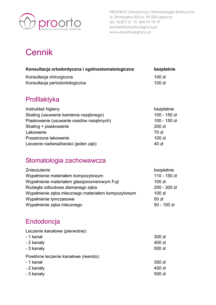 PROORTO Ortodoncja i Stomatologia Estetyczna ul. Złotoryjska 50/1a, 59-220 Legnica tel. 76 877 01 19, 504 79 19 19 [email protected] www.proorto.legnica.pl Cennik Konsultacja ortodontyczna i ogólnostomatologiczna bezpłatnie Konsultacja chirurgiczna Konsultacja periodontologiczna 100 zł 100 zł Profilaktyka Instruktaż higieny Skaling (usuwanie kamienia nazębnego) Piaskowanie (usuwanie osadów nazębnych) Skaling + piaskowanie Lakowanie Poszerzone lakowanie Leczenie nadwrażliwości (jeden ząb) bezpłatnie 100 - 150 zł 100 - 150 zł 200 zł 70 zł 100 zł 40 zł Stomatologia zachowawcza Znieczulenie Wypełnienie materiałem kompozytowym Wypełnienie materiałem glassjonomerowym Fuji Rozległa odbudowa złamanego zęba Wypełnienie zęba mlecznego materiałem kompozytowym Wypełnienie tymczasowe Wypełnienie zęba mlecznego bezpłatnie 110 - 150 zł 100 zł 200 - 300 zł 100 zł 50 zł 50 - 100 zł Endodoncja Leczenie kanałowe (pierwotne): - 1 kanał - 2 kanały - 3 kanały 300 zł 400 zł 500 zł Powtórne leczenie kanałowe (reendo): - 1 kanał - 2 kanały - 3 kanały 350 zł 450 zł 500 zł PROORTO Ortodoncja i Stomatologia Estetyczna ul. Złotoryjska 50/1a, 59-220 Legnica tel. 76 877 01 19, 504 79 19 19 [email protected] www.proorto.legnica.pl Każdy dodatkowy kanał (leczenie pierwotne i reendo) Cena leczenia kanałowego zawiera oraz opracowania i wypełnienia kanałów. koszt +100 zł znieczulenia, Odbudowa zęba do leczenia endodontycznego Wypełnienie po leczeniu endodontycznym w zębach przed-/ trzonowych Leczenie amputacyjne zęba mlecznego zdjęcia 50 - 100 zł 150 - 250 zł 150 zł Ortodoncja Diagnostyka ortodontyczna (wyciski, fotografie, analiza) Aparat stały metalowy (1 łuk) Aparat stały estetyczny (1 łuk) Mini implant ortodontyczny Aparat Herbsta (MALU) Aparat Hassa (RME) Aparat grubołukowy typu bi helix/quad helix 130 zł 1600 zł 2200 zł 400 zł 1000 zł 800 zł 400 zł Aparat wyjmowany: - jednoszczękowy - dwuszczękowy 600 zł 800 zł Retainer stały Wizyta kontrolna z aparatem stałym Wizytka kontrolna z aparatem wyjmowanym Kontrola retencji 250 zł 140 zł 100 zł bezpłatnie Protetyka Wkład koronowo - korzeniowy z włókna szklanego/metalowy Korona porcelanowa na metalu Korona pełnoceramiczna Procera Korona porcelanowa na cyrkonie Inlay/onlay kompozytowy Inlay/onlay porcelanowy Licówka porcelanowa Licówka kompozytowa (natychmiastowo w gabinecie) Proteza szkieletowa Proteza akrylowa częściowa Proteza akrylowa całkowita 250 - 300 zł 720 zł 900 zł 1280 zł 550 zł 1000 zł 1000 zł 250 zł 1550 zł 650 zł 1000 zł RTG PROORTO Ortodoncja i Stomatologia Estetyczna ul. Złotoryjska 50/1a, 59-220 Legnica tel. 76 877 01 19, 504 79 19 19 [email protected] www.proorto.legnica.pl Zatrzask, zasuwa (zamiast klamry) Szyna relaksacyjna Szyna relaksacyjna Michigan Most adhezyjny Proteza natychmiastowa Wax up 1 łuku zębowego Endokorona Analiza metodą Gerbera Ściągnięcie starej korony 600 zł 300 zł 900 zł 900 zł 600 zł 400 zł 750 zł 300 - 500 zł 50 zł Wybielanie Metoda nakładkowa (oba łuki) Wybielanie w gabinecie (oba łuki) Ząb martwy 800 zł 800 zł 150 zł Periodontologia Kiretaż (1/2 łuku) Płukanie kieszonki dziąsłowej wraz z aplikacją leku Szynowanie zębów (jeden ząb) 100 zł 50 zł 70 zł Chirurgia stomatologiczna Usunięcie zęba mlecznego Nacięcie ropnia/higiena zębodołu Podcięcie wędzidełka 60 - 100 zł 100 zł 150 - 200 zł Ekstrakcja (usunięcie) zęba: - siekacze, kły - przedtrzonowce - trzonowce (z separacją korzeni) 100 zł 150 zł 150 - 200 zł Ekstrakcja (usunięcie) ósemki Implant Korona na implancie 200 - 500 zł 2200 zł 1700 zł Szczegółowy cennik pozostałych zabiegów chirurgicznych dostępny w gabinecie (hemisekcja, resekcja korzeni, wyłuszczenie torbieli, inne zabiegi). PROORTO Ortodoncja i Stomatologia Estetyczna ul. Złotoryjska 50/1a, 59-220 Legnica tel. 76 877 01 19, 504 79 19 19 [email protected] www.proorto.legnica.pl Cennik nie stanowi oferty handlowej w rozumieniu art. 66 par. 1 Kodeksu Cywilnego i jest publikowany wyłącznie w celach informacyjnych.