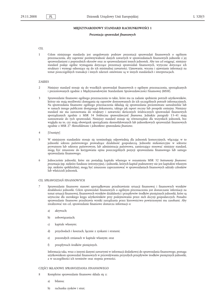 29.11.2008 Dziennik Urzędowy Unii Europejskiej PL MIĘDZYNARODOWY STANDARD RACHUNKOWOŚCI 1 Prezentacja sprawozdań finansowych CEL 1 Celem niniejszego standardu jest uregulowanie podstaw prezentacji sprawozdań finansowych o ogólnym przeznaczeniu, aby zapewnić porównywalność danych zawartych w sprawozdaniach finansowych jednostki z jej sprawozdaniami z poprzednich okresów oraz ze sprawozdaniami innych jednostek. Aby ten cel osiągnąć, niniejszy standard podaje ogólne wymagania dotyczące prezentacji sprawozdań finansowych, wytyczne dotyczące ich struktury i wymogi odnoszące się do ich minimalnej zawartości. Ujmowanie, wycena i ujawnianie informacji na temat poszczególnych transakcji i innych zdarzeń omówione są w innych standardach i interpretacjach. ZAKRES 2 Niniejszy standard stosuje się do wszelkich sprawozdań finansowych o ogólnym przeznaczeniu, sporządzanych i prezentowanych zgodnie z Międzynarodowymi Standardami Sprawozdawczości Finansowej (MSSF). 3 Sprawozdanie finansowe ogólnego przeznaczenia to takie, które ma za zadanie spełnienie potrzeb użytkowników, którzy nie mają możliwości domagania się raportów dostosowanych do ich szczególnych potrzeb informacyjnych. Na sprawozdania finansowe ogólnego przeznaczenia składają się sprawozdania prezentowane samodzielnie lub w ramach innego publicznie dostępnego dokumentu, takiego jak raport roczny lub prospekt emisyjny. Niniejszy standard nie ma zastosowania do struktury i zawartości skróconych śródrocznych sprawozdań finansowych sporządzanych zgodnie z MSR 34 Śródroczna sprawozdawczość finansowa. Jednakże paragrafy 13–41 mają zastosowanie do tych sprawozdań. Niniejszy standard stosuje się równorzędnie dla wszystkich jednostek, bez względu na to, czy mają obowiązek sporządzania skonsolidowanych lub jednostkowych sprawozdań finansowych zgodnie z MSR 27 Skonsolidowane i jednostkowe sprawozdania finansowe. 4 [Usunięty] 5 W niniejszym standardzie stosuje się terminologię odpowiednią dla jednostek komercyjnych, włączając w to jednostki sektora państwowego prowadzące działalność gospodarczą. Jednostki niekomercyjne w sektorze prywatnym lub sektorze państwowym, lub administracja państwowa, zamierzające stosować niniejszy standard, mogą być zmuszone do korygowania opisu poszczególnych pozycji sprawozdania finansowego lub samego sprawozdania finansowego. 6 Jednocześnie jednostki, które nie posiadają kapitału własnego w rozumieniu MSR 32 Instrumenty finansowe: prezentacja (np. niektóre fundusze inwestycyjne), i jednostki, których kapitał podstawowy nie jest kapitałem własnym (np. niektóre spółdzielnie), mogą być zmuszone zaprezentować w sprawozdaniach finansowych udziały członków lub właścicieli jednostek. CEL SPRAWOZDAŃ FINANSOWYCH 7 Sprawozdanie finansowe stanowi uporządkowane przedstawienie sytuacji finansowej i finansowych wyników działalności jednostki. Celem sprawozdań finansowych o ogólnym przeznaczeniu jest dostarczanie informacji na temat sytuacji finansowej, finansowych wyników działalności i przepływów środków pieniężnych jednostki, które są użyteczne dla szerokiego kręgu użytkowników przy podejmowaniu przez nich decyzji gospodarczych. Ponadto sprawozdanie finansowe przedstawia wyniki zarządzania przez kierownictwo powierzonymi mu zasobami. Aby zrealizować ten cel, sprawozdanie finansowe dostarcza informacji o: a) aktywach; b) zobowiązaniach; c) kapitale własnym; d) przychodach i kosztach, łącznie z zyskami i stratami; e) pozostałych zmianach w kapitale własnym; oraz f) przepływach środków pieniężnych. Informacja taka, wraz z innymi danymi zawartymi w informacji dodatkowej do sprawozdania finansowego, pomaga użytkownikom sprawozdań finansowych w przewidywaniu przyszłych przepływów środków pieniężnych jednostki, a w szczególności ich terminów oraz stopnia pewności. CZĘŚCI SKŁADOWE SPRAWOZDANIA FINANSOWEGO 8 Kompletne sprawozdanie finansowe składa się z: a) bilansu; b) rachunku zysków i strat; L 320/5 L 320/6 Dziennik Urzędowy Unii Europejskiej PL c) 9 10 zestawienia zmian w kapitale własnym, pokazującego: (i) wszystkie zmiany w kapitale własnym; lub (ii) zmiany w kapitale własnym inne niż wynikające z transakcji dokonywanych z właścicielami kapitału własnego, działającymi w ramach uprawnień przysługujących właścicielom kapitału własnego; d) rachunku przepływów pieniężnych; oraz e) informacji dodatkowych o przyjętych zasadach (polityce) rachunkowości oraz innych informacji objaśniających. Wiele jednostek prezentuje, poza sprawozdaniem finansowym, także analizę finansową sporządzoną przez kierownictwo, zawierającą opis oraz wyjaśnienie głównych składników finansowych wyników działalności uzyskanych przez jednostkę, jej sytuację finansową oraz najistotniejsze obszary niepewności, jakie dotyczą jednostki. Raport taki może zawierać omówienie: a) głównych czynników wpływających na wyniki działalności, w tym zmian w środowisku, w którym jednostka prowadzi działalność gospodarczą, reakcji jednostki na te zmiany i ich skutków, jak również polityki inwestycyjnej jednostki zmierzającej do utrzymania i dalszej poprawy wyników działalności, w tym polityki odnośnie do dywidend; b) źródeł finansowania jednostki, a także jej docelowy wskaźnik zobowiązań do kapitału własnego; oraz c) zasobów jednostki, których wartość nie została ujęta w bilansie sporządzonym zgodnie z MSSF. Wiele jednostek sporządza również oprócz sprawozdania finansowego raporty i sprawozdania, takie jak na przykład raporty o wpływie jednostki na środowisko naturalne oraz sprawozdanie o wytworzonej wartości dodanej, co dotyczy szczególnie tych sektorów przemysłu, gdzie czynniki związane ze środowiskiem naturalnym są znaczące, a pracownicy postrzegani są jako ważna grupa użytkowników. Raporty i sprawozdania prezentowane poza s