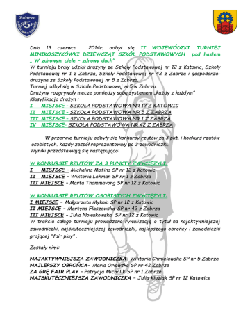 Dnia 13 czerwca 2014r. odbył się II WOJEWÓDZKI TURNIEJ MINIKOSZYKÓWKI DZIEWCZĄT SZKÓŁ PODSTAWOWYCH pod hasłem „ W zdrowym ciele – zdrowy duch” W turnieju brały udział drużyny ze Szkoły Podstawowej nr 12 z Katowic, Szkoły Podstawowej nr 1 z Zabrza, Szkoły Podstawowej nr 42 z Zabrza i gospodarzedrużyna ze Szkoły Podstawowej nr 5 z Zabrza. Turniej odbył się w Szkole Podstawowej nr5 w Zabrzu. Drużyny rozgrywały mecze pomiędzy sobą systemem „każdy z każdym” Klasyfikacja drużyn : I MIEJSCE – SZKOŁA PODSTAWOWA NR 12 Z KATOWIC II MIEJSCE – SZKOŁA PODSTAWOWA NR 5 Z ZABRZA III MIEJSCE – SZKOŁA PODSTAWOWA NR 1 Z ZABRZA IV MIEJSCE- SZKOŁA PODSTAWOWA NR 42 Z ZABRZA W przerwie turnieju odbyły się konkursy rzutów za 3 pkt. i konkurs rzutów osobistych. Każdy zespół reprezentowały po 3 zawodniczki. Wyniki przedstawiają się następująco: W KONKURSIE RZUTÓW ZA 3 PUNKTY ZWYCIĘŻYLI: I MIEJSCE – Michalina Mofina SP nr 12 z Katowic II MIEJSCE – Wiktoria Lehman SP nr 1 z Zabrza III MIEJSCE – Marta Thammavong SP nr 12 z Katowic W KONKURSIE RZUTÓW OSOBISTYCH ZWYCIĘŻYLI: I MIEJSCE – Małgorzata Mykała SP nr 12 z Katowic II MIEJSCE – Martyna Flaszewska SP nr 42 z Zabrza III MIEJSCE – Julia Nowakowska SP nr 12 z Katowic W trakcie całego turnieju prowadzono rywalizację o tytuł na najaktywniejszej zawodniczki, najskuteczniejszej zawodniczki, najlepszego obrońcy i zawodniczki grającej ”fair play” . Zostały nimi: NAJAKTYWNIEJSZA ZAWODNICZKA- Wiktoria Chmielewska SP nr 5 Zabrze NAJLEPSZY OBROŃCA- Maria Orłowska SP nr 42 Zabrze ZA GRĘ FAIR PLAY – Patrycja Michalik SP nr 1 Zabrze NAJSKUTECZNIEJSZA ZAWODNICZKA – Julia Kluziak SP nr 12 Katowice Drużyny zostały nagrodzone pucharami i pamiątkowymi medalami a wyróżniające się zawodniczki - pamiątkowymi statuetkami i nagrodami rzeczowymi. Organizatorem Turnieju był nauczyciel wf -u i trener drużyny SP nr 5 mgr Janusz Zieliński i nauczycielka wf-u SP nr 5 - mgr Jolanta Pisiewicz
