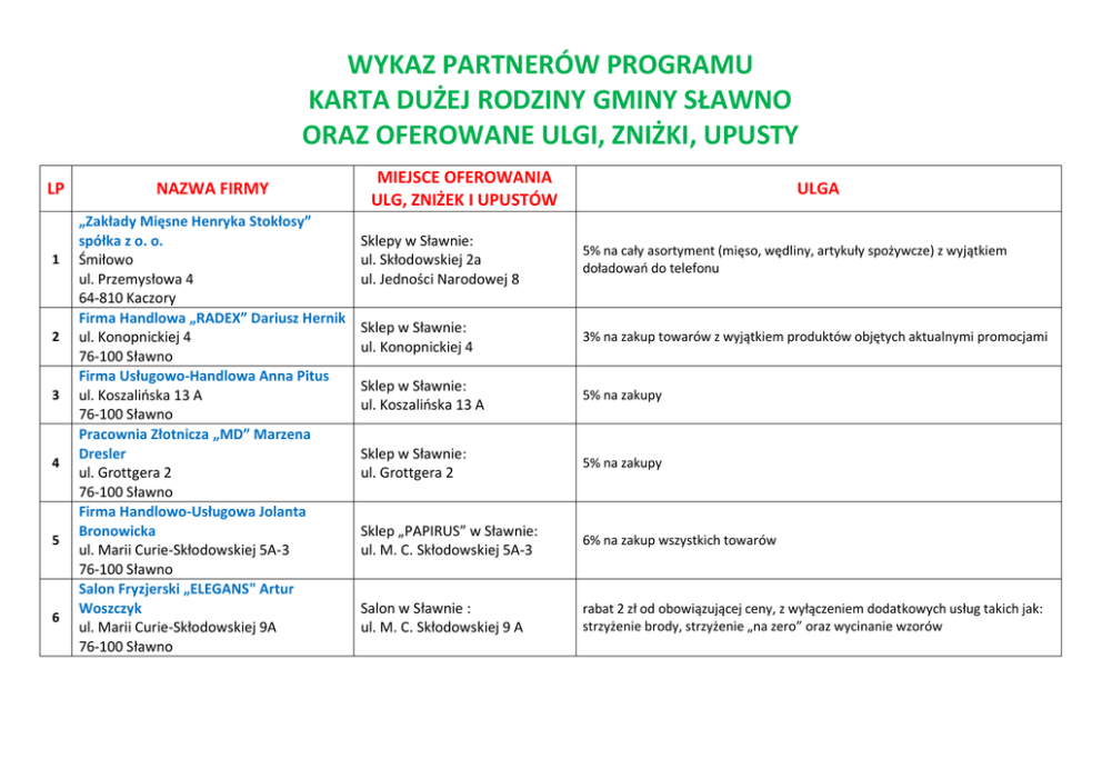 WYKAZ PARTNERÓW PROGRAMU KARTA DUŻEJ RODZINY GMINY SŁAWNO ORAZ OFEROWANE ULGI, ZNIŻKI, UPUSTY LP 1 2 3 4 5 6 NAZWA FIRMY „Zakłady Mięsne Henryka Stokłosy” spółka z o. o. Śmiłowo ul. Przemysłowa 4 64-810 Kaczory Firma Handlowa „RADEX” Dariusz Hernik ul. Konopnickiej 4 76-100 Sławno Firma Usługowo-Handlowa Anna Pitus ul. Koszalińska 13 A 76-100 Sławno Pracownia Złotnicza „MD” Marzena Dresler ul. Grottgera 2 76-100 Sławno Firma Handlowo-Usługowa Jolanta Bronowicka ul. Marii Curie-Skłodowskiej 5A-3 76-100 Sławno Salon Fryzjerski „ELEGANS" Artur Woszczyk ul. Marii Curie-Skłodowskiej 9A 76-100 Sławno MIEJSCE OFEROWANIA ULG, ZNIŻEK I UPUSTÓW ULGA Sklepy w Sławnie: ul. Skłodowskiej 2a ul. Jedności Narodowej 8 5% na cały asortyment (mięso, wędliny, artykuły spożywcze) z wyjątkiem doładowań do telefonu Sklep w Sławnie: ul. Konopnickiej 4 3% na zakup towarów z wyjątkiem produktów objętych aktualnymi promocjami Sklep w Sławnie: ul. Koszalińska 13 A 5% na zakupy Sklep w Sławnie: ul. Grottgera 2 5% na zakupy Sklep „PAPIRUS” w Sławnie: ul. M. C. Skłodowskiej 5A-3 6% na zakup wszystkich towarów Salon w Sławnie : ul. M. C. Skłodowskiej 9 A rabat 2 zł od obowiązującej ceny, z wyłączeniem dodatkowych usług takich jak: strzyżenie brody, strzyżenie „na zero” oraz wycinanie wzorów PPHU „AMPER” Hurtownia Artykułów Elektryczno-Przemysłowych Rafał 7 Żydowski ul. Kościelna 2 76-100 Sławno Zakład fryzjerski Stanisława Mikulska 8 ul. 1-go Pułku Ułanów 4 76-100 Sławno Ośrodek Nauki Jazdy Damian Miszke 9 Plac Sportowy 1 76-100 Sławno Zakład Optyczny Grażyna Cieślik 10 ul. Basztowa 3B 76-100 Sławno Z.U.H „FACHOWIEC” Waldemar Dubiał 11 Warszkowo 69 76-100 Sławno Zakątek Papierniczy, Księgarnia „POD SOWĄ” Jacek Gofryk, Mariusz Płotka 12 Plac Wyszyńskiego 6 76-100 Sławno Sklep w Sławnie: ul. Kościelna 2 10% rabatu na cały asortyment z wyłączeniem artykułów objętych promocją lub przecenionych Zakład w Sławnie: ul. 1-go Pułku Ułanów 4 rabat 1 zł od obowiązującej ceny, z wyłączeniem dodatkowych usług takich jak: strzyżenie brody, strzyżenie „na zero” oraz wycinanie wzorów Ośrodek w Sławnie: Plac Sportowy 1 5% na kurs prawa jazdy kat B (dotyczy szkolenia teoretycznego i praktycznego), rabat nie obejmuje kosztów badań lekarskich, kosztów egzaminów oraz innych opłat związanych z kursem Zakład w Sławnie: ul. Basztowa 3 B 5% na okulary Zakład w Warszkowie: Warszkowo 69 20% na usługi budowlane Sklep w Sławnie Plac Wyszyńskiego 6 5% na cały asortyment zakupiony w sklepie AKTUALIZACJA: 24 października 2016 roku