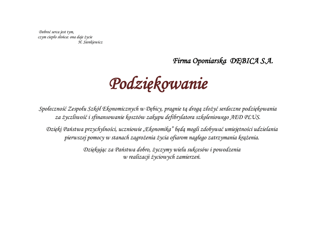 Dobroć serca jest tym, czym ciepło słońca: ona daje życie H. Sienkiewicz Firma Oponiarska DĘBICA S.A. Podziękowanie Społeczność Zespołu Szkół Ekonomicznych w Dębicy, pragnie tą drogą złożyć serdeczne podziękowania za życzliwość i sfinansowanie kosztów zakupu defibrylatora szkoleniowego AED PLUS. Dzięki Państwa przychylności, uczniowie „Ekonomika” będą mogli zdobywać umiejętności udzielania pierwszej pomocy w stanach zagrożenia życia ofiarom nagłego zatrzymania krążenia. Dziękując za Państwa dobro, życzymy wielu sukcesów i powodzenia w realizacji życiowych zamierzeń. Dobroć serca jest tym, czym ciepło słońca: ona daje życie H. Sienkiewicz Pani Monika Garduła Firma Oponiarska DĘBICA S.A. Podziękowanie Społeczność Zespołu Szkół Ekonomicznych w Dębicy, pragnie tą drogą złożyć serdeczne podziękowania za życzliwość i sfinansowanie kosztów zakupu defibrylatora szkoleniowego AED PLUS. Dzięki Pani zaangażowaniu i przychylności, uczniowie „Ekonomika” będą mogli zdobywać umiejętności udzielania pierwszej pomocy w stanach zagrożenia życia ofiarom nagłego zatrzymania krążenia. Dziękując za Pani dobro, życzymy wielu sukcesów i powodzenia w realizacji życiowych zamierzeń. Dobroć serca jest tym, czym ciepło słońca: ona daje życie H. Sienkiewicz Pan Stanisław Cieszkowski Prezes Zarządu Firmy Oponiarskiej DĘBICA S.A. Podziękowanie Społeczność Zespołu Szkół Ekonomicznych w Dębicy, pragnie tą drogą złożyć serdeczne podziękowania za życzliwość i sfinansowanie kosztów zakupu defibrylatora szkoleniowego AED PLUS. Dzięki Pana przychylności, uczniowie „Ekonomika” będą mogli zdobywać umiejętności udzielania pierwszej pomocy w stanach zagrożenia życia ofiarom nagłego zatrzymania krążenia. Dziękując za Pana dobro, życzymy wielu sukcesów i powodzenia w realizacji życiowych zamierzeń.