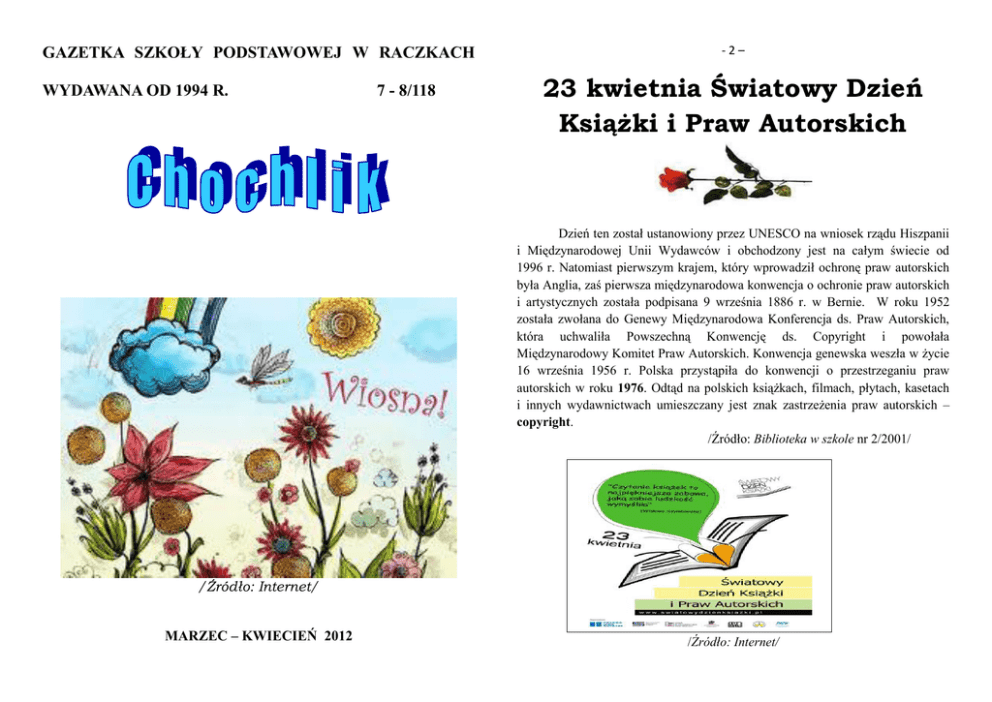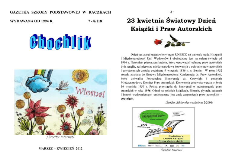 GAZETKA SZKOŁY PODSTAWOWEJ W RACZKACH WYDAWANA OD 1994 R. 7 - 8/118 -2– 23 kwietnia Światowy Dzień Książki i Praw Autorskich Dzień ten został ustanowiony przez UNESCO na wniosek rządu Hiszpanii i Międzynarodowej Unii Wydawców i obchodzony jest na całym świecie od 1996 r. Natomiast pierwszym krajem, który wprowadził ochronę praw autorskich była Anglia, zaś pierwsza międzynarodowa konwencja o ochronie praw autorskich i artystycznych została podpisana 9 września 1886 r. w Bernie. W roku 1952 została zwołana do Genewy Międzynarodowa Konferencja ds. Praw Autorskich, która uchwaliła Powszechną Konwencję ds. Copyright i powołała Międzynarodowy Komitet Praw Autorskich. Konwencja genewska weszła w życie 16 września 1956 r. Polska przystąpiła do konwencji o przestrzeganiu praw autorskich w roku 1976. Odtąd na polskich książkach, filmach, płytach, kasetach i innych wydawnictwach umieszczany jest znak zastrzeżenia praw autorskich – copyright. /Źródło: Biblioteka w szkole nr 2/2001/ /Źródło: Internet/ MARZEC – KWIECIEŃ 2012 /Źródło: Internet/ -4– -3- Z życia szkoły... 28 lutego 2012 r. nasze uczennice uczestniczyły w I Powiatowym Konkursie Recytatorskim im. Wacława Klejmonta pt. "Poeci Pogranicza Warmii, Mazur i Suwalszczyzny" w Bakałarzewie. Organizatorami konkursu były: Zespół Szkół w Bakałarzewie oraz Gminna Biblioteka Publiczna w Bakałarzewie. Wzięły w nim udział uczniowie szkół z Suwałk, Wiżajn, Raczek i Bakałarzewa. Komisji przewodniczyła p. Maria Kołodziejska - dyrektor Biblioteki im. Marii Konopnickiej w Suwałkach. Nasze uczennice zajęły: II miejsce - Dominika Łapińska z kl. VI a i III miejsce Paulina Haponik z kl. VI a. Awansowały również do międzypowiatowego przeglądu w Olecku. 29 lutego klasa VI b wyjeżdżała do kina 3D w Plazie w Suwałkach na film pt. „Podróż na tajemniczą wyspę”. Organizatorką wyjazdu była wychowawczyni klasy p. Maria Jabłońska – Maziewska. 2 marca odbył się konkurs matematyczny „Z szóstką na 6”, w którym wzięło udział 20 uczniów z klas IV – VI. 14 marca klasa V a i VI a wyjeżdżała do akwaparku w Suwałkach. Organizatorkami wyjazdu: p. Hanna Wasilewska i wychowawczynie: p. Halina Kopko i p. Małgorzata Szczypiń. 15 marca odbył się po raz czwarty w klasach szóstych próbny sprawdzian. 13 marca uczniowie z klasy V a na korytarzu szkolnym zaprezentowali mit „Demeter i Kora”, który został przedstawiony przez trzy grupy tak, by każdy uczeń nietylko wystąpił w określonej roli, ale mógł porównać swój występ z występem kolegów i koleżanek. 22 marca odbyły się w klasach IV – VI obchody Dnia Wiosny zorganizowane przez samorząd uczniowski pod kierunkiem opiekunki p. Barbary Bartoszewicz. W programie przewidziano pięć konkursów, w których uczestniczyły całe klasy lub ich przedstawiciele. Oto wyniki: 1. Konkurs na przebranie się za wiosnę, w którym każdą klasę reprezentowałjeden chłopak. Oto wyniki: I m. – kl. V c II m. – kl. V b III m. – kl. VI a -5– 4. Konkurs na I m. kl. V b II m. – kl. VI a III m. – kl. IV b 1. Konkurs na najładniejszą marzannę wykonaną z surowców wtórnych na czas przy aplauzie widowni. I m. – kl. VI b II m. - kl. V a III m. – kl. IV a 3. Rzut beretem, gdzie nagradzane oddzielnie były rzuty chłopaka i dziewczyny z poszczególnych klas oraz najlepszy wynik w klasie. dziewczęta chłopcy /indywidualne/ I m. – Kinga Kubrak, kl. V c I m. Piotr Kareło, V c II m. – Weronika Haponik, kl. IV b II m. – Paweł Galicki, kl. VI b III m. – Anna Stankiewicz, kl. V b III m. D. Skowroński, kl. VI a /klasowe/ I m. - kl. V c II m. – kl. VI b III m. – kl. V b -6– wiosenną sałatkę. Oto wyniki: / 5. Konkurs na ułożenie o tematyce wiosennej własnej piosenki. I m. – kl. VI a II m. – kl. V b III m. – kl. V a 28 marca odbyły się eliminacje szkolne konkursu recytatorskiego "Witaj wiosno" organizowanego przez Gminny Ośrodek Kultury w Raczkach. Oto wyniki konkursu: I miejsce i awans do II etapu konkursuw Gminnym Ośrodku Kultury w Raczkach: Patrycja Bożewicz, Patryk Kwiatkowski, Karolina Jaśko, Zuzanna Strękowska, Jan Naruszewicz, Katarzyna Kasprzyk, Natalia Kuprewicz, Wiktoria Zabłocka, Paulina Haponik, Oliwia Półtorak, Iwona Zakrzewska. -7- -8– 3 kwietnia obył się ogólnopolski sprawdzian klas szóstych. 17 kwietnia uczniowie kl. V b wraz z wychowawczynią p. Zofią Kopycińską udali się do Muzeum Marii Konopnickiej w Suwałkach. Obejrzeli galerię związaną z życiem i twórczością wybitnego malarza, suwalczanina, Alfreda Wierusza Kowalskiego, a także wystawę fotograficzną E. Kozłowskiej „Ludzie Wschodu”. Uczestniczyli również w zajęciach plastycznych na temat „Poezja w malarstwie, malarstwo w poezji” do utworów Marii Konopnickiej. II miejsce: Weronika Dziejkało, Magdalena Kłoczko, Magdalena Nalbach, Izabela Okrągła, Daniel Dziekoński, Natalia Zalewska, Karol Gołębicki, Natalia Nalbach. III miejsce: Weronika Haponik, Marlena Nideraus, Karol Ostaszewski, Julia Truszkowska, Anna Stankiewicz, Patrycja Jaśko, Joanna Sidor, Joanna Kowalska, Ewelina Baranowska. 2 kwietnia odbył się apel poświęcony kultywowanym tradycjom i zwyczajom świąt Wielkanocny zorganizowany przez klasę IV b pod opieką wychowawcy p. Cezarego Piłata. 27 kwietnia odbył się apel z okazji obchodów Dnia Ziemi i Święta Niezapominajki zorganizowany przez klasę VI b pod opieką p. Marii Jabłońskiej – Maziewskiej. Po apelu uczniowie klas IV – VI wyruszyli na sprzątanie terenu wokół szkoły i najbliższej okolicy. Dzięki tej akcji wiosna zachwyca nas zielenią i kwiatami, a nie przeraża leżącymi wokół odpadami. Organizatorką „sprzątania” tradycyjnie była p. Maria Jabłońska – Maziewska. -9– Z życia najmłodszych - 10 – * 4 kwietnia odbył się apel poświęcony tradycjom i zwyczajom Świąt Wielkanocny. Program artystyczny przygot