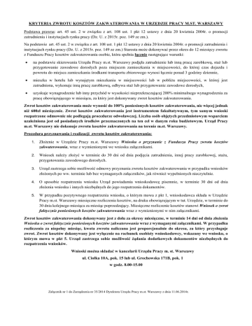 KRYTERIA ZWROTU KOSZTÓW ZAKWATEROWANIA W URZĘDZIE PRACY M.ST. WARSZAWY Podstawa prawna: art. 45 ust. 2 w związku z art. 108 ust. 1 pkt 12 ustawy z dnia 20 kwietnia 2004r. o promocji zatrudnienia i instytucjach rynku pracy (Dz. U. z 2015r. poz. 149 ze zm.). Na podstawie art. 45 ust. 2 w związku z art. 108 ust. 1 pkt 12 ustawy z dnia 20 kwietnia 2004r. o promocji zatrudnienia i instytucjach rynku pracy (Dz. U. z 2015r. poz. 149 ze zm.) Starosta może dokonywać przez okres do 12 miesięcy zwrotu z Funduszu Pracy kosztów zakwaterowania osobie, która spełnia łącznie następujące warunki: na podstawie skierowania Urzędu Pracy m.st. Warszawy podjęła zatrudnienie lub inną pracę zarobkową, staż lub przygotowanie zawodowe dorosłych poza miejscem zamieszkania w miejscowości, do której czas dojazdu i powrotu do miejsca zamieszkania środkami transportu zbiorowego wynosi łącznie ponad 3 godziny dziennie, mieszka w hotelu lub wynajętym mieszkaniu w miejscowości lub w pobliżu miejscowości, w której jest zatrudniona, wykonuje inną pracę zarobkową, odbywa staż lub przygotowanie zawodowe dorosłych, uzyskuje wynagrodzenie lub inny przychód w wysokości nieprzekraczającej 200% minimalnego wynagrodzenia za pracę obowiązującego w miesiącu, za który jest dokonywany zwrot kosztów zakwaterowania. Zwrot kosztów zakwaterowania może wynosić do 100% poniesionych kosztów zakwaterowania, nie więcej jednak niż 600zł miesięcznie. Zwrot kosztów zakwaterowania jest instrumentem fakultatywnym, tym samym wnioski rozpatrzone odmownie nie podlegają procedurze odwoławczej. Liczba osób objętych przedmiotowym wsparciem uzależniona jest od posiadanych środków przeznaczonych na ten cel w danym roku budżetowym. Urząd Pracy m.st. Warszawy nie dokonuje zwrotu kosztów zakwaterowania na terenie m.st. Warszawy. Procedura przyznawania i realizacji zwrotu kosztów zakwaterowania: 1. Złożenie w Urzędzie Pracy m.st. Warszawy Wniosku o przyznanie z Funduszu Pracy zwrotu kosztów zakwaterowania, wraz z wymienionymi we wniosku załącznikami. 2. Wniosek należy złożyć w terminie do 30 dni od dnia podjęcia zatrudnienia, innej pracy zarobkowej, stażu, przygotowania zawodowego dorosłych. 3. Urząd zastrzega sobie możliwość odmowy przyznania zwrotu kosztów zakwaterowania w przypadku wniosków złożonych po ww. terminie lub bez wymaganych załączników, jak również wypełnionych nieczytelnie. 4. O sposobie rozpatrzenia wniosku Urząd powiadamia wnioskodawcę pisemnie, w terminie 30 dni od dnia złożenia wniosku i innych niezbędnych do jego rozpatrzenia dokumentów. 5. W przypadku pozytywnego rozpatrzenia wniosku, o którym mowa z pkt 1, wnioskodawca składa w Urzędzie Pracy m.st. Warszawy miesięczne rozliczenia kosztów, na druku obowiązującym w tut. Urzędzie, w terminie do 30 dnia kolejnego miesiąca za miesiąc poprzedzający. Miesięczne rozliczenie kosztów stanowi Wniosek o zwrot faktycznie poniesionych kosztów zakwaterowania wraz z wymienionymi w nim załącznikami. Zwrot kosztów zakwaterowania dokonywany jest z dołu za okresy miesięczne, w terminie 14 dni od dnia złożenia Wniosku o zwrot faktycznie poniesionych kosztów zakwaterowania wraz z wymaganymi załącznikami. W przypadku rozliczenia za niepełny miesiąc, kwota zwrotu naliczana jest proporcjonalnie do okresu, za który przysługuje zwrot. Zwrot kosztów dokonywany jest wyłącznie na rachunek osobisty wnioskodawcy, wskazany we wniosku, o którym mowa w pkt 5. Urząd zastrzega sobie możliwość żądania dodatkowych dokumentów niezbędnych do rozpatrzenia wniosków. Wnioski można składać w kancelarii Urzędu Pracy m. st. Warszawy ul. Ciołka 10A, pok. 15 lub ul. Grochowska 171B, pok. 1 w godz. 8.00-15.00 Załącznik nr 1 do Zarządzenia nr 35/2014 Dyrektora Urzędu Pracy m.st. Warszawy z dnia 11.06.2014r.