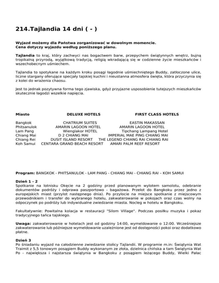 214.Tajlandia 14 dni ( - ) Wyjazd możemy dla Państwa zorganizować w dowolnym momencie. Cena dotyczy wyjazdu według poniższego planu. Tajlandia to kraj, który zachwyci nas bogactwem barw, przepychem świątynnych wnętrz, bujną tropikalną przyrodą, wyjątkową tradycją, religią wkradającą się w codzienne życie mieszkańców i wszechobecnym uśmiechem. Tajlandia to spotykane na każdym kroku posągi łagodnie uśmiechniętego Buddy, zatłoczone ulice, liczne stargany oferujące specjały tajskiej kuchni i nieustanna atmosfera święta, która przyczynia się z kolei do wrażenia chaosu. Jest to jednak pozytywna forma tego zjawiska, gdyż przyjazne usposobienie tutejszych mieszkańców skutecznie łagodzi wszelkie napięcia. Miasto Bangkok Phitsanulok Lam Pang Chiang Mai Chiang Rei Koh Samui DELUXE HOTELS FIRST CLASS HOTELS CHATRIUM SUITES EASTIN MAKASSAN AMARIN LAGOON HOTEL AMARIN LAGOON HOTEL Wienglakor HOTEL Tipchang Lampang Hotel D 2 CHIANG MAI IMPERIAL MAE PING CHIANG MAI DUSIT ISLAND RESORT THE LEGEND CHIANG RAI CHIANG RAI CENTARA GRAND BEACH RESORT AMARI PALM REEF RESORT Program: BANGKOK - PHITSANULOK - LAM PANG - CHIANG MAI - CHIANG RAI – KOH SAMUI Dzień 1 - 2 Spotkanie na lotnisku Okęcie na 2 godziny przed planowanym wylotem samolotu, odebranie dokumentów podróży i odprawa paszportowo - bagażowa. Przelot do Bangkoku przez jedno z europejskich miast (przylot następnego dnia). Po przylocie na miejsce spotkanie z miejscowym przewodnikiem i transfer do wybranego hotelu, zakwaterowanie w pokojach oraz czas wolny na odpoczynek po podróży lub indywidualne zwiedzanie miasta. Nocleg w hotelu w Bangkoku. Fakultatywnie: Powitalna kolacja w restauracji "Silom Village". Podczas posiłku muzyka i pokaz tradycyjnego tańca tajskiego. Uwaga: zakwaterowanie w hotelach jest od godziny 14:00, wymeldowanie o 12:00. Wcześniejsze zakwaterowanie lub późniejsze wymeldowanie uzależnione jest od dostępności pokoi oraz dodatkowo płatne. Dzień 3 Po śniadaniu wyjazd na całodzienne zwiedzanie stolicy Tajlandii. W programie m.in: Świątynia Wat Traimit z 5,5 tonowym posągiem Buddy wykonanym ze złota, dzielnica chińska a tam Świątynia Wat Po - największa i najstarsza świątynia w Bangkoku z posągiem leżącego Buddy, Wielki Pałac Królewski ze Świątynią Wat Phra Kaeo będącą najcenniejszym i najwybitniejszym osiągnięciem tajskiej sztuki sakralnej, w której znajduje się słynny posąg Szmaragdowego Buddy. Pałac Królewski jest kompleksem budynków, służących od XVIII do połowy XX wieku jako oficjalna rezydencja króla Tajlandii. Kompleks pałacowy znajduje się na wschodnim brzegu rzeki Menam, stanowiącej naturalną granicę kompleksu. Z pozostałych stron teren Wielkiego Pałacu ogrodzony jest murem obronnym o łącznej długości 1900 metrów. Teren kompleksu zajmuje powierzchnię 218.400m². Integralną częścią Pałacu jest najważniejszy obiekt sakralny w królestwie - świątynia Wat Phra Keo, znana również jako Świątynia Szmaragdowego Buddy. Została ona wybudowana w 1902 r. Budynek mieści mnóstwo posągów Buddy ze złota, srebra i kamienia, a nad wszystkim góruje właśnie Szmaragdowy Budda na złotym cokole z baldachimem o pięciu parasolach oraz drugi, naturalnej wielkości Budda z lanego złota, ważący 75 kg, rzeźbiony i zdobiony drogimi kamieniami. Posadzka świątyni pokryta jest w całości płytkami ze srebra, ściany zaś inkrustowane są malowidłami, przedstawiającymi oczywiście sceny z życia Buddy. Zarówno Wielki Pałac jak i Wat Phra Kaeo, zostały zbudowane w 1782 r. przez Króla Ramę I – pierwszego monarchę Dynastii Chakri. Po zwiedzaniu czas wolny na spacer: możliwość zobaczenia Sanam Luang - (“pole królów” lub “królewskie tereny”) to jeden z nielicznych w Bangkoku niezabudowanych obszarów – tradycyjne miejsce królewskich kremacji, dorocznego festiwalu puszczania latawców oraz Królewskiej Ceremonii Zasiewów. Jest to zarazem jeden z najprzyjemniejszych rejonów miasta, gdzie znajdują się sanktuarium Lak Muang oraz położony na granicy z Sanam Luang Bazar Amuletów. Sąsiednie ulice pełne są sprzedawców oferujących maści, mikstury i amulety mające zapewnić szczęście, powodzenie w miłości oraz chronić przed złymi duchami. Wróżbici przepowiadają przyszłość z ręki oraz z gwiazd. Do ważniejszych atrakcji turystycznych Sanam Luang należą Wat Mahathat, cieszący się największą w Tajlandii sławą ośrodek studiów buddyjskich, i Muzeum Narodowe. Powrót do hotelu i czas wolny do dyspozycji uczestników. Nocleg w Bangkoku. Dzień 4 Po śniadaniu wykwaterowanie z hotelu i wyjazd w kierunku Ayutthaya. Po drodze zobaczymy Bang Pa In - kompleks pałacowy używany jako letnia rezydencja królów. Położony jest nad brzegiem rzeki Chao Phraya około 60 km od Bangkoku. Składa się on z królewskiego pałacu w stylu chińskim, królewskiej siedziby oraz popularnego chińskiego pawilonu położonego w środku stawu. Po zwiedzaniu przejazd do dawnej stolicy Syjamu, która została wpisana na listę UNESCO. Ayutthaya leży na wyspie otoczonej wodami trzech rzek płynących na południe do Zatoki Syjamskiej. W latach 1350 – 1767 była to stolica kulturalna formującego się właśnie państwa tajskiego. Dzięki strategicznemu położeniu miasto bogaciło się na handlu drogą wodną, a także było niemal nie do zdobycia przez wiele dziesięcioleci. Upadło jednak w końcu w roku 1767 po dwuletnim oblężeniu przez wojska birmańskie i rodzina królewska musiała uciekać, aby ratować życie. To wtedy dotarli z resztką ocalałej armii do znajdującej się na brzegu Menamu wioski Bangkok, która z biegiem lat została przekształcona w wielomilionowe miasto, które widzimy dzisiaj. W programie zwiedzanie Parku Historycznego i najbardziej interesujących Świątyń - Wat Chaiwathanaram, Wat Phra Srisampetch. Przejazd do Lopburi - zwiedzanie ruin Światyń War Phra Sri Ratana ora