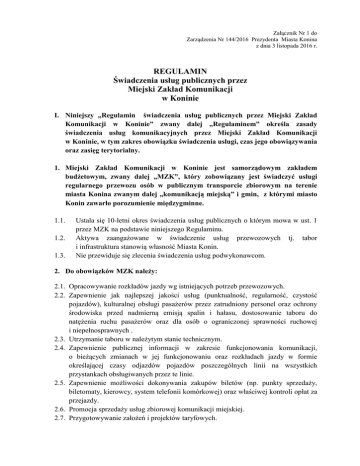 Załącznik Nr 1 do Zarządzenia Nr 144/2016 Prezydenta Miasta Konina z dnia 3 listopada 2016 r. REGULAMIN Świadczenia usług publicznych przez Miejski Zakład Komunikacji w Koninie I. Niniejszy „Regulamin świadczenia usług publicznych przez Miejski Zakład Komunikacji w Koninie” zwany dalej „Regulaminem” określa zasady świadczenia usług komunikacyjnych przez Miejski Zakład Komunikacji w Koninie, w tym zakres obowiązku świadczenia usługi, czas jego obowiązywania oraz zasięg terytorialny. 1. Miejski Zakład Komunikacji w Koninie jest samorządowym zakładem budżetowym, zwany dalej „MZK”, który zobowiązany jest świadczyć usługi regularnego przewozu osób w publicznym transporcie zbiorowym na terenie miasta Konina zwanym dalej „komunikacją miejską” i gmin, z którymi miasto Konin zawarło porozumienie międzygminne. 1.1. 1.2. 1.3. Ustala się 10-letni okres świadczenia usług publicznych o którym mowa w ust. 1 przez MZK na podstawie niniejszego Regulaminu. Aktywa zaangażowane w świadczenie usług przewozowych tj. tabor i infrastruktura stanowią własność Miasta Konin. Nie przewiduje się zlecenia świadczenia usług podwykonawcom. 2. Do obowiązków MZK należy: 2.1. Opracowywanie rozkładów jazdy wg istniejących potrzeb przewozowych. 2.2. Zapewnienie jak najlepszej jakości usług (punktualność, regularność, czystość pojazdów), kulturalnej obsługi pasażerów przez zatrudniony personel oraz ochrony środowiska przed nadmierną emisją spalin i hałasu, dostosowanie taboru do natężenia ruchu pasażerów oraz dla osób o ograniczonej sprawności ruchowej i niepełnosprawnych . 2.3. Utrzymanie taboru w należytym stanie technicznym. 2.4. Zapewnienie publicznej informacji w zakresie funkcjonowania komunikacji, o bieżących zmianach w jej funkcjonowaniu oraz rozkładach jazdy w formie określającej czasy odjazdów pojazdów poszczególnych linii na wszystkich przystankach obsługiwanych przez te linie. 2.5. Zapewnienie możliwości dokonywania zakupów biletów (np. punkty sprzedaży, biletomaty, kierowcy, system telefonii komórkowej) oraz właściwej kontroli opłat za przejazdy. 2.6. Promocja sprzedaży usług zbiorowej komunikacji miejskiej. 2.7. Przygotowywanie założeń i projektów taryfowych. 2.8. Uzgodnienie zasad korzystania z przystanków komunikacyjnych z ich właścicielem lub zarządzającym. 3. Usługi komunikacyjne. 3.1. Miarą wielkości usług jest liczba „wozokilometrów” (praca przewozowa) wynikająca z realizacji rozkładów jazdy. 3.2. Rozkład jazdy i plan pracy przewozowej obejmują dojazdy i zjazdy technologiczne. 3.3. Zmiany rozkładów jazdy, ich rozmiary oraz sposób i źródła ich finansowania winny być uzgodnione z Prezydentem Miasta Konina. 4. Zasady kontroli jakości usług świadczonych przez MZK określa załącznik nr 1 do niniejszego regulaminu. 5. Zasady naliczania kar za niewłaściwe wykonywanie usług przewozowych, określa załącznik nr 2 do niniejszego regulaminu. II. Zasady obliczania rekompensaty. 1. Prezydent Miasta Konina zobowiązany jest zgodnie z Rozporządzeniem (WE) nr 1370/2007 Parlamentu Europejskiego i Rady z dnia 23 października 2007 r. dotyczące usług publicznych w zakresie kolejowego i drogowego transportu pasażerskiego oraz uchylające rozporządzenia Rady (EWG) nr 1191/69 i (EWG) nr 1107/70 do rekompensaty kosztów świadczonych usług publicznych w zakresie publicznego transportu zbiorowego przez MZK w oparciu o poniższe zasady. Ilekroć w niniejszym Regulaminie mowa jest o: a) rekompensacie – należy przez to rozumieć rekompensatę w rozumieniu przepisów Rozporządzenia (WE) nr 1370/2007 Parlamentu Europejskiego i Rady z dnia 23 października 2007 r. dotyczącego usług publicznych w zakresie kolejowego i drogowego transportu pasażerskiego oraz uchylające rozporządzenia Rady (EWG) nr 1191/69 i (EWG) nr 1107/70 zawartego w Artykule 2 pkt. g, b) dotacji - należy przez to rozumieć dotacje w rozumieniu art. 126 ustawy z dnia 27 sierpnia 2009 r. o finansach publicznych (Dz. U. z 2013 r., poz. 885 ze zm.). 1.1.Wysokość rekompensaty przekazywana przez Miasto Konin dla MZK nie może przekroczyć kwoty koniecznej do pokrycia wyniku finansowego netto uzyskanego, jako różnica kosztów i przychodów, związanych z realizacją zobowiązań z tytułu świadczenia usług publicznych, przy uwzględnieniu związanych z tym pozostałych przychodów MZK (np. wpływów z reklamy). 1.2. Sposób obliczania wyniku finansowego netto (należnej rekompensaty) będzie wyglądał następująco: a) Planowane koszty działalności związane ze świadczeniem usług publicznych, w tym: − koszty operacyjne (wraz z amortyzacją) związane ze świadczeniem usług publicznych, − pozostałe koszty operacyjne związane ze świadczeniem usług publicznych, − koszty finansowe bezpośrednio związane ze świadczeniem usług publicznych, b) Planowane przychody, w tym: − przychody związane z realizacją usług publicznych (sprzedaż biletów i pozostałe), − pozostałe przychody operacyjne, − wartość korzyści z wszelkich innych przysporzeń, w tym otrzymane dofinansowanie z UE. c) Rozsądny zysk na poziomie 0 do 6% kapitału własnego 1.3. MZK określa, a Prezydent Miasta Konina zatwierdza planowane koszty w układzie rodzajowym. 1.4. Planowaną kwotę wpływów za przewozy pasażerów kalkuluje się na podstawie obowiązującej taryfy i zasad opłat oraz planowanej sprzedaży biletów. 1.5. Przychody z działalności określonej w Statucie Miejskiego Zakładu Komunikacji w Koninie z dodatkowych działań tj. sprzedaż paliw, wynajem autobusów, umieszczanie reklam, świadczenie innych usług oraz odszkodowań stanowią w całości przychód MZK. 1.6. Stawka bazowa za jeden wozokilometr (wkm) jest ilorazem należnej rekompensaty i planowanej do przejechania ilości wozokilometrów zgodnie z przedstawionym planem wielkości usługi na dany rok. 2. Przekazanie przez Miasto Konin re