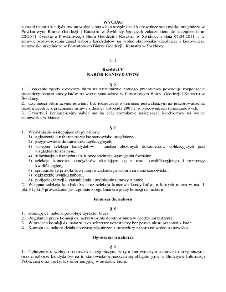 WYCIĄG z zasad naboru kandydatów na wolne stanowiska urzędnicze i kierownicze stanowiska urzędnicze w Powiatowym Biurze Geodezji i Katastru w Świdnicy będących załącznikiem do zarządzenia nr 20/2011 Dyrektora Powiatowego Biura Geodezji i Katastru w Świdnicy z dnia 07.04.2011 r. w sprawie wprowadzenia zasad naboru kandydatów na wolne stanowiska urzędnicze i kierownicze stanowiska urzędnicze w Powiatowym Biurze Geodezji i Katastru w Świdnicy. (...) Rozdział V NABÓR KANDYDATÓW §6 1. Uzyskanie zgody dyrektora biura na zatrudnienie nowego pracownika powoduje rozpoczęcie procedury naboru kandydatów na wolne stanowisko w Powiatowym Biurze Geodezji i Katastru w Świdnicy. 2. Czynności rekrutacyjne powinny być rozpoczęte w terminie pozwalającym na przeprowadzenie naboru zgodnie z przepisami ustawy z dnia 21 listopada 2008 r. o pracownikach samorządowych. 3. Otwarty i konkurencyjny nabór ma na celu pozyskanie najlepszych kandydatów na wolne stanowisko w biurze. §7 1. Wyróżnia się następujące etapy naboru: 1) ogłoszenie o naborze na wolne stanowisko urzędnicze, 2) przyjmowanie dokumentów aplikacyjnych, 3) wstępna selekcja kandydatów – analiza złożonych dokumentów aplikacyjnych pod względem formalnym, 4) informacja o kandydatach, którzy spełniają wymagania formalne, 5) selekcja końcowa kandydatów składająca się z testu kwalifikacyjnego i rozmowy kwalifikacyjnej, 6) sporządzenie protokołu z przeprowadzonego naboru na dane stanowisko, 7) ogłoszenie wyniku naboru, 8) podjęcie decyzji o zatrudnieniu i podpisanie umowy o pracę. 2. Wstępna selekcja kandydatów oraz selekcja końcowa kandydatów, o których mowa w ust. 1 pkt.3 i pkt.5 prowadzona jest zgodnie z regulaminem pracy komisji ds. naboru. Komisja ds. naboru 1. 2. 3. 4. §8 Komisję ds. naboru powołuje dyrektor biura. Regulamin pracy komisji ds. naboru ustala dyrektor biura w drodze zarządzenia. W pracach komisji ds. naboru jako sekretarz uczestniczy bez prawa głosu pracownik kadr. Komisja ds. naboru działa do czasu zakończenia procedury naboru na wolne stanowisko. Ogłoszenie o naborze §9 1. Ogłoszenie o wolnym stanowisku urzędniczym, w tym kierowniczym stanowisku urzędniczym, oraz o naborze kandydatów na to stanowisko umieszcza się obligatoryjnie w Biuletynie Informacji Publicznej oraz na tablicy informacyjnej w siedzibie biura. 2. Możliwe jest umieszczenie ogłoszeń dodatkowo w innych miejscach, m.in. prasie, biurach pośrednictwa pracy, urzędach pracy. § 10 1. Ogłoszenie o wolnym stanowisku pracownik kadr umieszcza zgodnie z zasadami określonymi w § 9. 2. Ogłoszenie o naborze na wolne stanowisko powinno zawierać: 1) nazwę i adres jednostki, 2) określenie stanowiska, w tym stanowiska, o które poza obywatelami polskimi mogą ubiegać się obywatele Unii Europejskiej oraz obywatele innych państw, którym na podstawie umów międzynarodowych lub przepisów prawa wspólnotowego przysługuje prawo do podjęcia zatrudnienia na terytorium Rzeczypospolitej Polskiej, 3) określenie wymagań związanych ze stanowiskiem urzędniczym, w tym kierowniczym stanowiskiem urzędniczym zgodnie z opisem danego stanowiska, ze wskazaniem, które z nich są niezbędne, a które dodatkowe, 4) wskazanie zakresu zadań wykonywanych na stanowisku, 5) wskazanie wymaganych dokumentów, 6) określenie terminu i miejsca składania dokumentów. 3. Termin do składania dokumentów, określony w ogłoszeniu o naborze, nie może być krótszy niż 10 dni od dnia opublikowania tego ogłoszenia w biuletynie. 4. Minimalny czas publikacji ogłoszenia o naborze nie może być krótszy niż 10 dni. (...) Przyjmowanie dokumentów aplikacyjnych § 11 1. W terminie określonym w ogłoszeniu o naborze, nie krótszym niż 10 dni od dnia opublikowania ogłoszenia, następuje przyjmowanie dokumentów aplikacyjnych od kandydatów zainteresowanych pracą na wolnym stanowisku w biurze. 2. Na dokumenty aplikacyjne mogą składać się: a) list motywacyjny, b) życiorys – curriculum vitae, c) kserokopia świadectw pracy, dokumenty potwierdzające prowadzenie działalności gospodarczej o charakterze zgodnym z wymaganiami na danym stanowisku (zaświadczenie z ewidencji działalności gospodarczej, Krajowego Rejestru Sądowego i inne), d) kserokopia świadectw (dyplomów) potwierdzających wykształcenie, kserokopia zaświadczeń o ukończonych kursach, szkoleniach, e) pisemne oświadczenie kandydata o posiadaniu pełnej zdolności do czynności prawnych oraz korzystania z pełni praw publicznych, f) pisemne oświadczenie kandydata, że nie był skazany prawomocnym wyrokiem sądu za umyślne przestępstwo ścigane z oskarżenia publicznego lub umyślne przestępstwo skarbowe, g) referencje, h) oryginał kwestionariusza osobowego dla osoby ubiegającej się o zatrudnienie. 3. Dokumenty aplikacyjne składane przez osoby ubiegające się o zatrudnienie w biurze mogą być przyjmowane tylko po umieszczeniu ogłoszenia o organizowanym naborze na wolne stanowisko w formie pisemnej. 4. Nie ma możliwości przyjmowania dokumentów aplikacyjnych drogą elektroniczną, z wyjątkiem dokumentów opatrzonych bezpiecznym podpisem elektronicznym weryfikowanym przy pomocy ważnego kwalifikowanego certyfikatu (zgodnie z ustawą z dnia 18 września 2001r. o podpisie elektronicznym – Dz.U. z 2001 r. Nr 130, poz.1450 z późn. zm.). 5. Nie ma możliwości przyjmowania dokumentów aplikacyjnych poza ogłoszeniem. Sposób postępowania z dokumentami aplikacyjnymi § 12 1. Dokumenty aplikacyjne kandydata, który zostanie wyłoniony w procesie naboru zostaną dołączone do jego akt osobowych. 2. Dokumenty aplikacyjne osób, które w procesie naboru zakwalifikowały się do dalszego etapu i zostały umieszczone w protokole, będą przechowywane zgodnie z instrukcją kancelaryjną, przez okres wynikający z oznaczenia kategorii archiwalnej, a następnie przekazywane do archiwum zakładowego. 3. Dokumenty aplikacyjne pozostałych osób bę