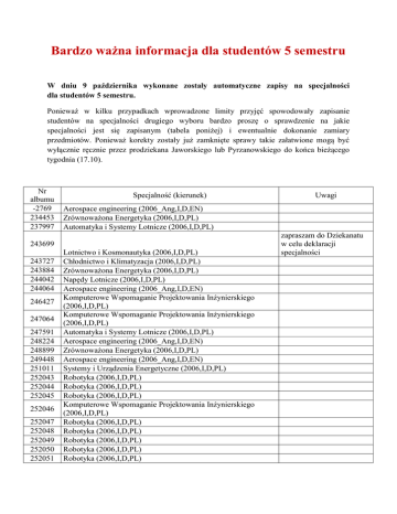 Bardzo ważna informacja dla studentów 5 semestru W dniu 9 października wykonane zostały automatyczne zapisy na specjalności dla studentów 5 semestru. Ponieważ w kilku przypadkach wprowadzone limity przyjęć spowodowały zapisanie studentów na specjalności drugiego wyboru bardzo proszę o sprawdzenie na jakie specjalności jest się zapisanym (tabela poniżej) i ewentualnie dokonanie zamiary przedmiotów. Ponieważ korekty zostały już zamknięte sprawy takie załatwione mogą być wyłącznie ręcznie przez prodziekana Jaworskiego lub Pyrzanowskiego do końca bieżącego tygodnia (17.10). Nr albumu -2769 234453 237997 Specjalność (kierunek) Aerospace engineering (2006_Ang,I,D,EN) Zrównoważona Energetyka (2006,I,D,PL) Automatyka i Systemy Lotnicze (2006,I,D,PL) 243699 243727 243884 244042 244064 246427 247064 247591 248224 248899 249448 251011 252043 252044 252045 252046 252047 252048 252049 252050 252051 Uwagi Lotnictwo i Kosmonautyka (2006,I,D,PL) Chłodnictwo i Klimatyzacja (2006,I,D,PL) Zrównoważona Energetyka (2006,I,D,PL) Napędy Lotnicze (2006,I,D,PL) Aerospace engineering (2006_Ang,I,D,EN) Komputerowe Wspomaganie Projektowania Inżynierskiego (2006,I,D,PL) Komputerowe Wspomaganie Projektowania Inżynierskiego (2006,I,D,PL) Automatyka i Systemy Lotnicze (2006,I,D,PL) Aerospace engineering (2006_Ang,I,D,EN) Zrównoważona Energetyka (2006,I,D,PL) Aerospace engineering (2006_Ang,I,D,EN) Systemy i Urządzenia Energetyczne (2006,I,D,PL) Robotyka (2006,I,D,PL) Robotyka (2006,I,D,PL) Robotyka (2006,I,D,PL) Komputerowe Wspomaganie Projektowania Inżynierskiego (2006,I,D,PL) Robotyka (2006,I,D,PL) Robotyka (2006,I,D,PL) Robotyka (2006,I,D,PL) Robotyka (2006,I,D,PL) Robotyka (2006,I,D,PL) zapraszam do Dziekanatu w celu deklaracji specjalności 252052 252053 252054 252055 252056 252057 252058 252059 252061 252062 252063 252064 252065 252066 252067 252068 252069 252071 252072 252073 252074 252075 252076 252077 252078 252079 252080 252082 252084 252085 252086 252087 252088 252089 252091 252092 252094 252095 252096 252097 252098 252099 252101 Robotyka (2006,I,D,PL) Robotyka (2006,I,D,PL) Robotyka (2006,I,D,PL) Robotyka (2006,I,D,PL) Robotyka (2006,I,D,PL) Robotyka (2006,I,D,PL) Robotyka (2006,I,D,PL) Robotyka (2006,I,D,PL) Robotyka (2006,I,D,PL) Robotyka (2006,I,D,PL) Robotyka (2006,I,D,PL) Robotyka (2006,I,D,PL) Robotyka (2006,I,D,PL) Robotyka (2006,I,D,PL) Robotyka (2006,I,D,PL) Robotyka (2006,I,D,PL) Robotyka (2006,I,D,PL) Robotyka (2006,I,D,PL) Robotyka (2006,I,D,PL) Robotyka (2006,I,D,PL) Robotyka (2006,I,D,PL) Robotyka (2006,I,D,PL) Robotyka (2006,I,D,PL) Zrównoważona Energetyka (2006,I,D,PL) Robotyka (2006,I,D,PL) Robotyka (2006,I,D,PL) Robotyka (2006,I,D,PL) Robotyka (2006,I,D,PL) Robotyka (2006,I,D,PL) Robotyka (2006,I,D,PL) Robotyka (2006,I,D,PL) Robotyka (2006,I,D,PL) Power engineering (2006_Ang,I,D,EN) Power engineering (2006_Ang,I,D,EN) Power engineering (2006_Ang,I,D,EN) Power engineering (2006_Ang,I,D,EN) Power engineering (2006_Ang,I,D,EN) Power engineering (2006_Ang,I,D,EN) Power engineering (2006_Ang,I,D,EN) Power engineering (2006_Ang,I,D,EN) Power engineering (2006_Ang,I,D,EN) Power engineering (2006_Ang,I,D,EN) Power engineering (2006_Ang,I,D,EN) 252103 252104 Lotnictwo i Kosmonautyka (2006,I,D,PL) Aerospace engineering (2006_Ang,I,D,EN) zapraszam do Dziekanatu w celu deklaracji specjalności 252105 252110 252112 252114 Aerospace engineering (2006_Ang,I,D,EN) Aerospace engineering (2006_Ang,I,D,EN) Napędy Lotnicze (2006,I,D,PL) Aerospace engineering (2006_Ang,I,D,EN) 252116 252117 252118 252121 252122 252123 252124 252126 252127 252129 252130 252131 Mechanika i Budowa Maszyn (2006,I,D,PL) Komputerowe Wspomaganie Projektowania Inżynierskiego (2006,I,D,PL) Komputerowe Wspomaganie Projektowania Inżynierskiego (2006,I,D,PL) Komputerowe Wspomaganie Projektowania Inżynierskiego (2006,I,D,PL) Komputerowe Wspomaganie Projektowania Inżynierskiego (2006,I,D,PL) Komputerowe Wspomaganie Projektowania Inżynierskiego (2006,I,D,PL) Komputerowe Wspomaganie Projektowania Inżynierskiego (2006,I,D,PL) Robotyka (2006,I,D,PL) Komputerowe Wspomaganie Projektowania Inżynierskiego (2006,I,D,PL) Komputerowe Wspomaganie Projektowania Inżynierskiego (2006,I,D,PL) Komputerowe Wspomaganie Projektowania Inżynierskiego (2006,I,D,PL) Komputerowe Wspomaganie Projektowania Inżynierskiego (2006,I,D,PL) 252132 252134 252135 252136 252137 252138 252139 252140 252141 252142 252143 252144 252145 252147 252148 Mechanika i Budowa Maszyn (2006,I,D,PL) Komputerowe Wspomaganie Projektowania Inżynierskiego (2006,I,D,PL) Komputerowe Wspomaganie Projektowania Inżynierskiego (2006,I,D,PL) Komputerowe Wspomaganie Projektowania Inżynierskiego (2006,I,D,PL) Statki Powietrzne (2006,I,D,PL) Statki Powietrzne (2006,I,D,PL) Automatyka i Systemy Lotnicze (2006,I,D,PL) Napędy Lotnicze (2006,I,D,PL) Statki Powietrzne (2006,I,D,PL) Napędy Lotnicze (2006,I,D,PL) Napędy Lotnicze (2006,I,D,PL) Statki Powietrzne (2006,I,D,PL) Statki Powietrzne (2006,I,D,PL) Automatyka i Systemy Lotnicze (2006,I,D,PL) Statki Powietrzne (2006,I,D,PL) zapraszam do Dziekanatu w celu deklaracji specjalności zapraszam do Dziekanatu w celu deklaracji specjalności 252149 252150 252151 252153 252154 252156 252157 252158 252159 252160 252161 252162 Napędy Lotnicze (2006,I,D,PL) Zrównoważona Energetyka (2006,I,D,PL) Automatyka i Systemy Lotnicze (2006,I,D,PL) Statki Powietrzne (2006,I,D,PL) Napędy Lotnicze (2006,I,D,PL) Automatyka i Systemy Lotnicze (2006,I,D,PL) Statki Powietrzne (2006,I,D,PL) Statki Powietrzne (2006,I,D,PL) Statki Powietrzne (2006,I,D,PL) Robotyka (2006,I,D,PL) Statki Powietrzne (2006,I,D,PL) Statki Powietrzne (2006,I,D,PL) 252163 252164 252166 252167 252168 Lotnictwo i Kosmonautyka (2006,I,D,PL) Automatyka i Systemy Lotnicze (2006,I,D,PL) Napędy Lotnicze (2006,I,D,PL) Napędy Lotnicze (2006,I,D,PL) Automatyka i Systemy Lotnicze (2006,I,D,PL) 252169 252170 252173 252174 252175 252176 252177 252178 2521
