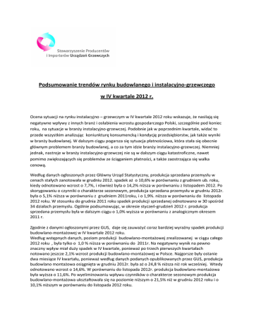 Podsumowanie trendów rynku budowlanego i instalacyjno-grzewczego w IV kwartale 2012 r. Ocena sytuacji na rynku instalacyjno – grzewczym w IV kwartale 2012 roku wskazuje, że nasilają się negatywne wpływy z innych branż i osłabienia wzrostu gospodarczego Polski, szczególnie pod koniec roku, na sytuacje w branży instalacyjno-grzewczej. Podobnie jak w poprzednim kwartale, widać to przede wszystkim analizując koniunkturę konsumencką i kondycję przedsiębiorstw, jak także wyniki w branży budowlanej. W dalszym ciągu pogarsza się sytuacja płatnościowa, która stała się obecnie głównym problemem branży budowlanej, a co za tym idzie branży instalacyjno-grzewczej. Niemniej jednak, nastroje w branży instalacyjno-grzewczej nie są w dalszym ciągu katastroficzne, nawet pomimo zwiększających się problemów ze ściąganiem płatności, a także zaostrzająca się walka cenową. Według danych ogłoszonych przez Główny Urząd Statystyczny, produkcja sprzedana przemysłu w cenach stałych zanotowała w grudniu 2012. spadek aż o 10,6% w porównaniu z grudniem ub. roku, kiedy odnotowano wzrost o 7,7%, i również była o 14,2% niższa w porównaniu z listopadem 2012. Po skorygowaniu o czynniki o charakterze sezonowym, produkcja sprzedana przemysłu w grudniu 2012r. była o 5,1% niższa w porównaniu z grudniem 2011roku, i o 1,9%. niższa w porównaniu do listopada 2012 roku. W stosunku do grudnia 2011 roku spadek produkcji sprzedanej odnotowano w 30 spośród 34 działach przemysłu. Ogólnie podsumowując, w okresie styczeń-grudzień 2012 r. produkcja sprzedana przemysłu była w dalszym ciągu o 1,0% wyższa w porównaniu z analogicznym okresem 2011 r. Zgodnie z danymi ogłoszonymi przez GUS, daje się zauważyć coraz bardziej wyraźny spadek produkcji budowlano-montażowej w IV kwartale 2012 roku. Według wstępnych danych, poziom produkcji budowlano-montażowej zrealizowanej w ciągu całego 2012 roku , była tylko o 1,0 % niższa w porównaniu do 2011r. Na negatywny wynik na pewno znaczny wpływ miał duży spadek w IV kwartale, ponieważ po trzech pierwszych kwartałach notowano jeszcze 2,1% wzrost produkcji budowlano-montażowej w Polsce. Najgorsze były ostanie dwa miesiące IV kwartału, ponieważ według danych podanych opublikowanych przez GUS, produkcja budowlano montażowa osiągnięta w grudniu 2012r. była aż o 24,8 % niższa niż rok wcześniej. Wtedy odnotowano wzrost o 14,6%. W porównaniu do listopada 2012r. produkcja budowlano-montażowa była wyższa o 11,6%. Po wyeliminowaniu wpływu czynników o charakterze sezonowym produkcja budowlano-montażowa ukształtowała się na poziomie niższym o 21,5% niż w grudniu 2012 roku i o 10,1% niższym w porównaniu do listopada 2012 roku. Jak podaje GUS, w stosunku do grudnia 2011roku roku spadek poziomu zrealizowanych robót odnotowano praktycznie już we wszystkich działach branży. Spadki w firmach zajmujących się wznoszeniem budynków osiągnęły 31,4%, w firmach zajmujących się robotami budowlanymi specjalistycznymi – w tej grupie jest także branża instalacyjno-grzewcza – spadek wyniósł 13,9%. oraz w jednostkach specjalizujących się w budowie obiektów inżynierii lądowej i wodnej aż o 21,5%, w przedsiębiorstwach wykonujących roboty budowlane specjalistyczne, w tym prace instalacyjnogrzewcze – o 19,7%. Porównując do listopada 2012 r. zaznaczył się wzrost produkcji w firmach wykonujących specjalistyczne prace budowlane który wyniósł 23,1% oraz w firmach ogólnobudowlanych zajmujących się wznoszeniem budynków – o 11,8%. Podane wyniki odzwierciedlają także opinie na temat rozwoju rynku instalacyjno-grzewczego, gdzie duża część respondentów podkreślała duży zastój i spadek właśnie w listopadzie. Ogólnie, 2012 rok zamknął się spadkiem o 1,0% produkcji budowlano-montażowej w odniesieniu do 2011 roku. W tym spadki dotyczyły firm związanych z pracami specjalistycznymi obejmującymi także firmy instalacyjno-grzewcze o 1,8%, oraz firm zajmujących się wznoszeniem budynków o 2,2%. Jak już było to sygnalizowane w poprzednich raportach, zjazd w branży budowlanej zaczął sie już w połowie roku, po stosunkowo niezłym pierwszym półroczu 2012. To dowodzi, że w branży budowlanej, po zakończeniu projektów związanych z EURO, nastąpiło pewne załamanie. Jak kształtowała się dynamika produkcji budowlano-montażowej w porównaniu do przeciętnego miesięcznego poziomu w 2005 roku, pokazuje wykres: Źródło: GUS Do tego w drugiej połowie roku doszedł stały spadek nastrojów konsumenckich. Należy pamiętać, że obecnie przynajmniej połowa obrotu w branży, jak nie więcej, to właśnie rynek wymian i modernizacji. Jeżeli w wypadku rynku nowych budów można mówiąc o inwestycjach, to wypadku modernizacji mamy do czynienia z rynkiem konsumenckim. Nie spodziewano się tak silnego osłabienia konsumpcji. W IV kw. Polacy po raz pierwszy, odkąd GUS publikuje statystyki, wydali mniej niż rok wcześniej – jak podają szacunki, konsumpcja spadła o ok. 1 proc., a cały rok przyniósł wyhamowanie jej wzrostu do 0,5 proc. z 2,5 proc. w 2011 r. W ubiegłym roku gospodarkę trzymał na powierzchni eksport netto, czyli dodatnie saldo wymiany handlowej z zagranicą. Pozytywnym aspektem w osiągniętych na konec roku wynikach, był mniejszy, niż można było się spodziewać, spadek inwestycji w ostatnich miesiącach roku. Ekonomiści szacują, że mógł wyhamować do -0,5 proc. z -1,5 proc. w III kw. Zdaniem eksperta z Rady Gospodarczej przy Premierze, mógł to być efekt przyspieszenia na rynku kredytów mieszkaniowych pod koniec roku, przed wygaśnięciem rządowego programu „Rodzina na swoim". Pokazują to wyniki osiągnięte przez deweloperów, którzy sprzedali mieszkania, które mieli w zapasach. W ciągu 2012 roku inwestycje wzrosły tylko o 0,6 %. wobec 9 % wzrostu, który miał miejsce w 2011 r. Ekonomiści spodziewają się, że w 2013 r