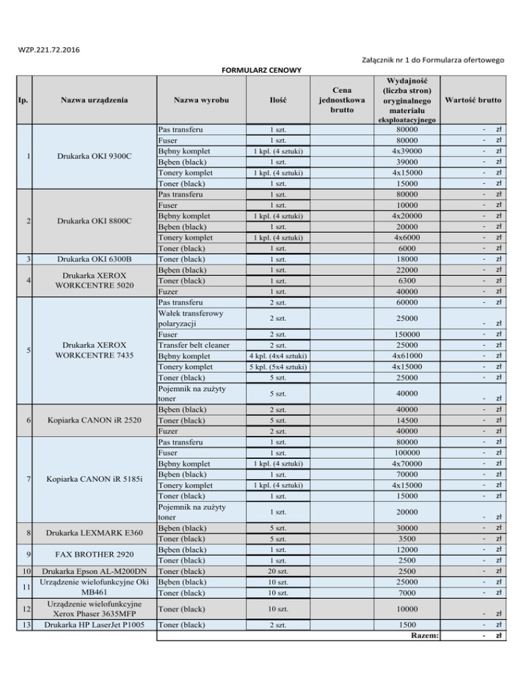 WZP.221.72.2016 Załącznik nr 1 do Formularza ofertowego FORMULARZ CENOWY Ip. Nazwa urządzenia Nazwa wyrobu Ilość Pas transferu Fuser Bębny komplet Bęben (black) Tonery komplet Toner (black) Pas transferu Fuser Bębny komplet Bęben (black) Tonery komplet Toner (black) Toner (black) Bęben (black) Toner (black) Fuzer Pas transferu Wałek transferowy polaryzacji Fuser Transfer belt cleaner Bębny komplet Tonery komplet Toner (black) Pojemnik na zużyty toner Bęben (black) Toner (black) Fuzer Pas transferu Fuser Bębny komplet Bęben (black) Tonery komplet Toner (black) Pojemnik na zużyty toner Bęben (black) Toner (black) Bęben (black) Toner (black) Toner (black) Bęben (black) Toner (black) 1 szt. Cena jednostkowa brutto Wydajność (liczba stron) oryginalnego materiału Wartość brutto eksploatacyjnego 1 2 Drukarka OKI 9300C Drukarka OKI 8800C 3 Drukarka OKI 6300B 4 Drukarka XEROX WORKCENTRE 5020 5 6 7 Drukarka XEROX WORKCENTRE 7435 Kopiarka CANON iR 2520 Kopiarka CANON iR 5185i 8 Drukarka LEXMARK E360 9 FAX BROTHER 2920 10 Drukarka Epson AL-M200DN Urządzenie wielofunkcyjne Oki MB461 11 12 13 Urządzenie wielofunkcyjne Xerox Phaser 3635MFP Drukarka HP LaserJet P1005 2 szt. 80000 80000 4x39000 39000 4x15000 15000 80000 10000 4x20000 20000 4x6000 6000 18000 22000 6300 40000 60000 2 szt. 25000 2 szt. 5 szt. 150000 25000 4x61000 4x15000 25000 5 szt. 40000 2 szt. 1 szt. 40000 14500 40000 80000 100000 4x70000 70000 4x15000 15000 1 szt. 20000 5 szt. 10 szt. 30000 3500 12000 2500 2500 25000 7000 Toner (black) 10 szt. 10000 Toner (black) 2 szt. 1 szt. 1 kpl. (4 sztuki) 1 szt. 1 kpl. (4 sztuki) 1 szt. 1 szt. 1 szt. 1 kpl. (4 sztuki) 1 szt. 1 kpl. (4 sztuki) 1 szt. 1 szt. 1 szt. 1 szt. 1 szt. 2 szt. 4 kpl. (4x4 sztuki) 5 kpl. (5x4 sztuki) 5 szt. 2 szt. 1 szt. 1 szt. 1 kpl. (4 sztuki) 1 szt. 1 kpl. (4 sztuki) 5 szt. 1 szt. 1 szt. 20 szt. 10 szt. 1500 Razem: - zł zł zł zł zł zł zł zł zł zł zł zł zł zł zł zł zł - zł zł zł zł zł zł - zł zł zł zł zł zł zł zł zł zł - zł zł zł zł zł zł zł zł - zł zł zł