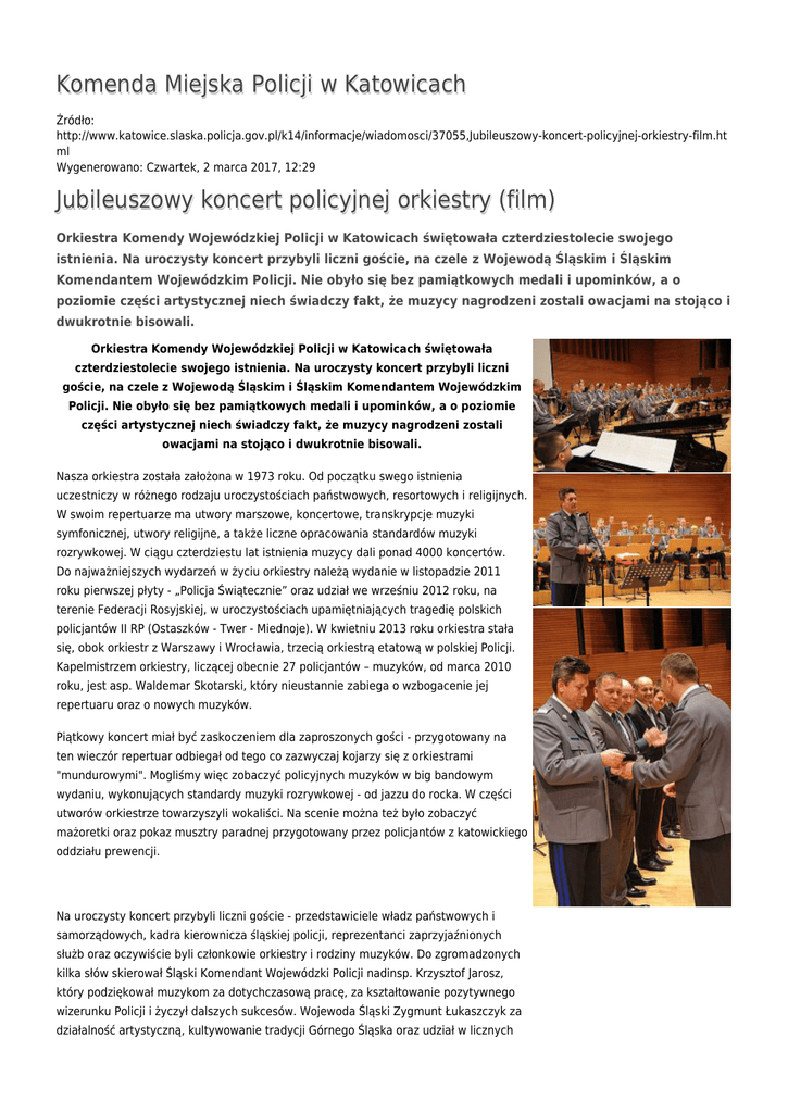 Komenda Miejska Policji w Katowicach Źródło: http://www.katowice.slaska.policja.gov.pl/k14/informacje/wiadomosci/37055,Jubileuszowy-koncert-policyjnej-orkiestry-film.ht ml Wygenerowano: Czwartek, 2 marca 2017, 12:29 Jubileuszowy koncert policyjnej orkiestry (film) Orkiestra Komendy Wojewódzkiej Policji w Katowicach świętowała czterdziestolecie swojego istnienia. Na uroczysty koncert przybyli liczni goście, na czele z Wojewodą Śląskim i Śląskim Komendantem Wojewódzkim Policji. Nie obyło się bez pamiątkowych medali i upominków, a o poziomie części artystycznej niech świadczy fakt, że muzycy nagrodzeni zostali owacjami na stojąco i dwukrotnie bisowali. Orkiestra Komendy Wojewódzkiej Policji w Katowicach świętowała czterdziestolecie swojego istnienia. Na uroczysty koncert przybyli liczni goście, na czele z Wojewodą Śląskim i Śląskim Komendantem Wojewódzkim Policji. Nie obyło się bez pamiątkowych medali i upominków, a o poziomie części artystycznej niech świadczy fakt, że muzycy nagrodzeni zostali owacjami na stojąco i dwukrotnie bisowali. Nasza orkiestra została założona w 1973 roku. Od początku swego istnienia uczestniczy w różnego rodzaju uroczystościach państwowych, resortowych i religijnych. W swoim repertuarze ma utwory marszowe, koncertowe, transkrypcje muzyki symfonicznej, utwory religijne, a także liczne opracowania standardów muzyki rozrywkowej. W ciągu czterdziestu lat istnienia muzycy dali ponad 4000 koncertów. Do najważniejszych wydarzeń w życiu orkiestry należą wydanie w listopadzie 2011 roku pierwszej płyty - „Policja Świątecznie” oraz udział we wrześniu 2012 roku, na terenie Federacji Rosyjskiej, w uroczystościach upamiętniających tragedię polskich policjantów II RP (Ostaszków - Twer - Miednoje). W kwietniu 2013 roku orkiestra stała się, obok orkiestr z Warszawy i Wrocławia, trzecią orkiestrą etatową w polskiej Policji. Kapelmistrzem orkiestry, liczącej obecnie 27 policjantów – muzyków, od marca 2010 roku, jest asp. Waldemar Skotarski, który nieustannie zabiega o wzbogacenie jej repertuaru oraz o nowych muzyków. Piątkowy koncert miał być zaskoczeniem dla zaproszonych gości - przygotowany na ten wieczór repertuar odbiegał od tego co zazwyczaj kojarzy się z orkiestrami "mundurowymi". Mogliśmy więc zobaczyć policyjnych muzyków w big bandowym wydaniu, wykonujących standardy muzyki rozrywkowej - od jazzu do rocka. W części utworów orkiestrze towarzyszyli wokaliści. Na scenie można też było zobaczyć mażoretki oraz pokaz musztry paradnej przygotowany przez policjantów z katowickiego oddziału prewencji. Na uroczysty koncert przybyli liczni goście - przedstawiciele władz państwowych i samorządowych, kadra kierownicza śląskiej policji, reprezentanci zaprzyjaźnionych służb oraz oczywiście byli członkowie orkiestry i rodziny muzyków. Do zgromadzonych kilka słów skierował Śląski Komendant Wojewódzki Policji nadinsp. Krzysztof Jarosz, który podziękował muzykom za dotychczasową pracę, za kształtowanie pozytywnego wizerunku Policji i życzył dalszych sukcesów. Wojewoda Śląski Zygmunt Łukaszczyk za działalność artystyczną, kultywowanie tradycji Górnego Śląska oraz udział w licznych przedsięwzięciach, organizowanych w naszym regionie, wyróżnił orkiestrę Złotą Odznaką Honorową ZA ZASŁUGI DLA WOJEWÓDZTWA ŚLĄSKIEGO. Pod batutą Wojewody orkiestra odegrała uroczysty tusz. Komendant Główny Policji w uznaniu zasług śląskich muzyków, przekazał na ich ręce pamiątkową trąbkę. Z kolei orkiestra odwdzięczyła się osobom, które wspierają jej działalność pamiątkowymi medalami. Jak powiedział do zaproszonych gości kapelmistrz asp. Waldemar Skotarski - "Jeśli nadal włodarze będą tacy i warunki pracy orkiestry takie, jak teraz, już dziś zapraszam na pięćdziesięciolecie orkiestry za dziesięć lat". Takiego właśnie kolejnego jubileuszu życzymy naszym policyjnym muzykom! Ocena: 0/5 (0) Tweetnij
