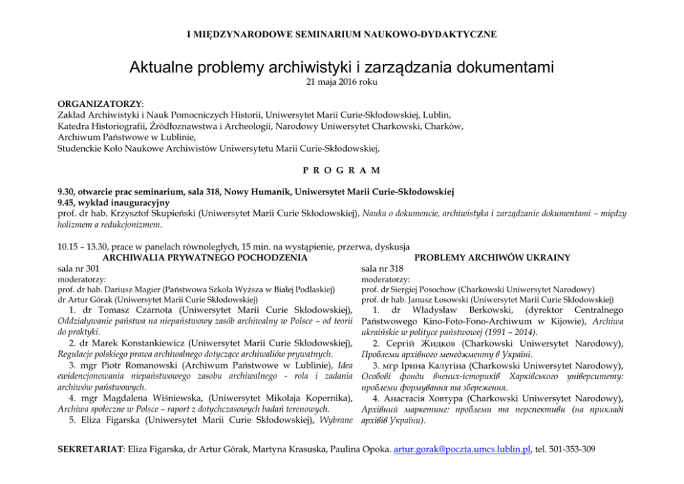 I MIĘDZYNARODOWE SEMINARIUM NAUKOWO-DYDAKTYCZNE Aktualne problemy archiwistyki i zarządzania dokumentami 21 maja 2016 roku ORGANIZATORZY: Zakład Archiwistyki i Nauk Pomocniczych Historii, Uniwersytet Marii Curie-Skłodowskiej, Lublin, Katedra Historiografii, Źródłoznawstwa i Archeologii, Narodowy Uniwersytet Charkowski, Charków, Archiwum Państwowe w Lublinie, Studenckie Koło Naukowe Archiwistów Uniwersytetu Marii Curie-Skłodowskiej, P R O G R A M 9.30, otwarcie prac seminarium, sala 318, Nowy Humanik, Uniwersytet Marii Curie-Skłodowskiej 9.45, wykład inauguracyjny prof. dr hab. Krzysztof Skupieński (Uniwersytet Marii Curie Skłodowskiej), Nauka o dokumencie, archiwistyka i zarządzanie dokumentami – między holizmem a redukcjonizmem. 10.15 – 13.30, prace w panelach równoległych, 15 min. na wystąpienie, przerwa, dyskusja ARCHIWALIA PRYWATNEGO POCHODZENIA PROBLEMY ARCHIWÓW UKRAINY sala nr 301 sala nr 318 moderatorzy: prof. dr hab. Dariusz Magier (Państwowa Szkoła Wyższa w Białej Podlaskiej) dr Artur Górak (Uniwersytet Marii Curie Skłodowskiej) moderatorzy: prof. dr Siergiej Posochow (Charkowski Uniwersytet Narodowy) prof. dr hab. Janusz Łosowski (Uniwersytet Marii Curie Skłodowskiej) 1. dr Tomasz Czarnota (Uniwersytet Marii Curie Skłodowskiej), Oddziaływanie państwa na niepaństwowy zasób archiwalny w Polsce – od teorii do praktyki. 2. dr Marek Konstankiewicz (Uniwersytet Marii Curie Skłodowskiej), Regulacje polskiego prawa archiwalnego dotyczące archiwaliów prywatnych. 3. mgr Piotr Romanowski (Archiwum Państwowe w Lublinie), Idea ewidencjonowania niepaństwowego zasobu archiwalnego - rola i zadania archiwów państwowych. 4. mgr Magdalena Wiśniewska, (Uniwersytet Mikołaja Kopernika), Archiwa społeczne w Polsce – raport z dotychczasowych badań terenowych. 5. Eliza Figarska (Uniwersytet Marii Curie Skłodowskiej), Wybrane 1. dr Władysław Berkowski, (dyrektor Centralnego Państwowego Kino-Foto-Fono-Archiwum w Kijowie), Archiwa ukraińskie w polityce państwowej (1991 – 2014). 2. Сергій Жидков (Charkowski Uniwersytet Narodowy), Проблеми архівного менеджменту в Україні. 3. мгр Ірина Калугіна (Charkowski Uniwersytet Narodowy), Особові фонди вчених-істориків Харківського університету: проблеми формування та збереження. 4. Анастасія Ховтура (Charkowski Uniwersytet Narodowy), Архівний маркетинг: проблеми та перспективи (на прикладі архівів України). SEKRETARIAT: Eliza Figarska, dr Artur Górak, Martyna Krasuska, Paulina Opoka. [email protected], tel. 501-353-309 I MIĘDZYNARODOWE SEMINARIUM NAUKOWO-DYDAKTYCZNE problemy metodyki archiwalnej w archiwach społecznych. 6. Paulina Opoka (Uniwersytet Marii Curie Skłodowskiej), Problemy kształtowania zasobu archiwalnego dokumentującego ważne wydarzenia sportowe na przykładzie Olimpiady w Berlinie. 7. mgr Bogumiła Kowal (Uniwersytet Marii Curie Skłodowskiej), Materiały po rodzinie Podlaszeckich i ich przydatność do badań duchowieństwa greckokatolickiego z przełomu XIX i XX wieku. 8. mgr Ołena Cykwas (Narodowy Uniwersytet we Lwowie), Pozwy przemyskiego biskupa unickiego Hieronima Ustryckiego ze zbioru Archiwum Państwowego w Przemyślu. 9. dr Artur Górak (Uniwersytet Marii Curie Skłodowskiej), Akta rosyjskich parafii katolickich w XIX wieku. 13.30-14.30, przerwa na obiad 5. Павло Болдєнков (Charkowski Uniwersytet Narodowy), Архіви та вищі навчальні заклади: канали комунікації (на прикладі України). 6. Анастасія Кальцова (Charkowski Uniwersytet Narodowy), Сайти архівів України, як засіб комунікації. 7. Сергій Зайцев (Charkowski Uniwersytet Narodowy), Архіви України в медіа-просторі. 8. Микита Єжков (Charkowski Uniwersytet Narodowy), Архіви України та засоби масової інформації. 9. Оксана Гела (Charkowski Uniwersytet Narodowy), Усноісторичні колекції в архівах і музеях України. 15.30 – 17.00, panel plenarny w Archiwum Państwowym w Lublinie ZARZĄDZANIE DOKUMENTMI I ARCHIWALIAMI moderatorzy: prof. dr hab. Krzysztof Skupieński (Uniwersytet Marii Curie Skłodowskiej) prof. dr Ludmiła Posochowa (Charkowski Uniwersytet Narodowy) 1. dr Tomasz Matuszak (Archiwum Państwowe w Piotrkowie Trybunalskim), Zarządzanie dokumentacją w jednostkach samorządu terytorialnego po 2011 roku – wybrane problemy. 2. dr Małgorzata Szabaciuk (Uniwersytet Marii Curie Skłodowskiej), Aktualne problemy Elektronicznego Zarządzania Dokumentacją w Polsce. 3. dr Robert Stępień (Uniwersytet Marii Curie Skłodowskiej), Elementy uniwersalne doświadczeń archiwów brytyjskich w dziedzinie zarządzania dokumentacją elektroniczną podmiotów publicznych. 4. Martyna Krasuska (Uniwersytet Marii Curie Skłodowskiej), Problematyka archiwizacji danych i tworzenia kopii zapasowych w systemach klasy Enterprise Content Management. 5. dr hab. Dariusz Magier prof. PSW, (Archiwum Państwowe w Lublinie), Problematyka rozpoznania przynależności zespołowej i zespołów rozbitych w opracowaniu akt sądów powszechnych Rzeczypospolitej Polskiej okresu międzywojennego z terenu byłego Królestwa Polskiego. 17.00, podsumowanie i zamknięcie obrad. SEKRETARIAT: Eliza Figarska, dr Artur Górak, Martyna Krasuska, Paulina Opoka. [email protected], tel. 501-353-309