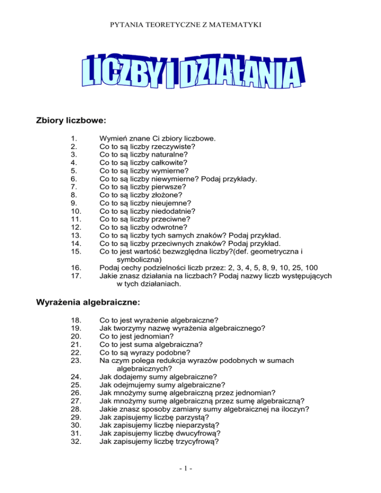PYTANIA TEORETYCZNE Z MATEMATYKI Zbiory liczbowe: 1. 2. 3. 4. 5. 6. 7. 8. 9. 10. 11. 12. 13. 14. 15. 16. 17. Wymień znane Ci zbiory liczbowe. Co to są liczby rzeczywiste? Co to są liczby naturalne? Co to są liczby całkowite? Co to są liczby wymierne? Co to są liczby niewymierne? Podaj przykłady. Co to są liczby pierwsze? Co to są liczby złożone? Co to są liczby nieujemne? Co to są liczby niedodatnie? Co to są liczby przeciwne? Co to są liczby odwrotne? Co to są liczby tych samych znaków? Podaj przykład. Co to są liczby przeciwnych znaków? Podaj przykład. Co to jest wartość bezwzględna liczby?(def. geometryczna i symboliczna) Podaj cechy podzielności liczb przez: 2, 3, 4, 5, 8, 9, 10, 25, 100 Jakie znasz działania na liczbach? Podaj nazwy liczb występujących w tych działaniach. Wyrażenia algebraiczne: 18. 19. 20. 21. 22. 23. 24. 25. 26. 27. 28. 29. 30. 31. 32. Co to jest wyrażenie algebraiczne? Jak tworzymy nazwę wyrażenia algebraicznego? Co to jest jednomian? Co to jest suma algebraiczna? Co to są wyrazy podobne? Na czym polega redukcja wyrazów podobnych w sumach algebraicznych? Jak dodajemy sumy algebraiczne? Jak odejmujemy sumy algebraiczne? Jak mnożymy sumę algebraiczną przez jednomian? Jak mnożymy sumę algebraiczną przez sumę algebraiczną? Jakie znasz sposoby zamiany sumy algebraicznej na iloczyn? Jak zapisujemy liczbę parzystą? Jak zapisujemy liczbę nieparzystą? Jak zapisujemy liczbę dwucyfrową? Jak zapisujemy liczbę trzycyfrową? -1- PYTANIA TEORETYCZNE Z MATEMATYKI Wzory skróconego mnożenia: 33. 34. 35. 36. Podaj znane Ci wzory skróconego mnożenia. Czemu jest równy kwadrat sumy dwóch wyrażeń? Czemu jest równy kwadrat różnicy dwóch wyrażeń? Czemu jest równa różnica kwadratów dwóch wyrażeń? Proporcja: 37. 38. 39. 40. 41. 42. Co to jest proporcja? Wymień własności proporcji. Kiedy zmienne x i y są wprost proporcjonalne? Kiedy zmienne x i y są odwrotnie proporcjonalne? Co to jest średnia arytmetyczna? Co to jest mediana? 43. 44. 45. 46. 47. 48. 49. 50. 51. 52. Jakie znasz ułamki? Co to są ułamki dziesiętne? Co to są ułamki zwykłe? Co to są liczby mieszane? Co to są ułamki właściwe i niewłaściwe? Jak mnożymy ułamki dziesiętne? Jak mnożymy ułamki zwykłe? Jak dzielimy ułamki dziesiętne? Jak dzielimy ułamki zwykłe? Na czym polega dzielenie i mnożenie ułamków dziesiętnych przez 10 lub potęgi 10? Czy każdy ułamek zwykły można zamienić na dziesiętny? Wymień sposoby zamiany ułamka zwykłego na dziesiętny. Jakie mogą być rozwinięcia dziesiętne ułamka zwykłego? Kiedy ułamek zwykły ma rozwinięcia dziesiętne skończone? Podaj zasadę zaokrągleń 53. 54. 55. 56. 57. -2- PYTANIA TEORETYCZNE Z MATEMATYKI Potęgi: 58. 59. 60. 61. 62. 63. 64. 65. 66. 67. Co to jest potęga o podstawie a i wykładniku naturalnym n? Jaka wartość przyjmuje potęga, kiedy wykładnik potęgi jest równy 1? Jaka wartość przyjmuje potęga, kiedy wykładnik potęgi jest równy 0? Podaj wzory działań na potęgach o wykładniku naturalnym. Czemu jest równy iloczyn potęg o tych samych wykładnikach? Czemu jest równy iloraz potęg o tych samych wykładnikach? Czemu jest równa potęga potęgi? Czemu jest równy iloczyn potęg o tych samych podstawach? Czemu jest równy iloraz potęg o tych samych podstawach? Ile wynosi a-n, nN? 68. Ile wynosi a m , n, mN; m0? n Pierwiastki: 69. 70. 71. Podaj definicję pierwiastka kwadratowego z liczby nieujemnej a? Podaj definicję pierwiastka trzeciego stopnia z liczby a? Podaj własności pierwiastków. Odcinki: 72. Co to jest symetralna odcinka? Jaką ma własność? Trójkąty: 73. 74. 75. 76. Jak dzielimy trójkąty ze względu na miary katów? Jak dzielimy trójkąty ze względu na długości boków? Ile wynosi suma miar kątów w trójkącie? Podaj warunek istnienia trójkąta. -3- PYTANIA TEORETYCZNE Z MATEMATYKI 77. 78. 79. 80. 81. 82. 83. 84. 85. 86. 87. 88. 89. 90. 91. 92. 93. Co to jest wysokość trójkąta? Jak nazywa się punkt przecięcia wysokości trójkąta (lub ich przedłużeń )? Co to jest środkowa trójkąta? Jak przecinają się środkowe w trójkącie? Jak nazywa się punkt przecięcia środkowych trójkąta? Jaki jest wzór na pole powierzchni trójkąta? Jaki jest wzór na wysokość trójkąta równobocznego? Jaki jest wzór na pole trójkąta równobocznego? Jaki jest wzór na promień okręgu opisanego na trójkącie równobocznym? Jaki jest wzór na promień okręgu wpisanego w trójkąt równoboczny? Gdzie leży środek koła opisanego na trójkącie? Omów jego położenie w zależności od rodzaju trójkąta. Gdzie leży środek koła wpisanego w trójkąt? Jak brzmi twierdzenie Pitagorasa? Jak brzmi twierdzenie odwrotne do twierdzenia Pitagorasa? Wymień cechy przystawania trójkątów i podaj ich treść. Co to jest trójkąt ,,złoty”? Podaj jaka jest zależność między jego bokami. Podaj zależność między bokami w trójkącie prostokątnym równoramiennym. Czworokąty: 94. 95. 96. 97. 98. 99. 100. 101. 102. 103. 104. 105. 106. 107. 108. 109. 110. 111. 112. 113. 114. 115. Ile wynosi suma miar kątów wewnętrznych czworokąta? Co to jest trapez? Wymień rodzaje trapezów (czym się charakteryzują). Jaki jest wzór na pole powierzchni trapezu? Co to jest równoległobok? Wymień własności przekątnych w równoległoboku. Podaj wzór na pole równoległoboku. Co to jest romb? Wymień własności przekątnych rombu. Podaj wzór na pole rombu. Co to jest prostokąt? Wymień własności przekątnych prostokąta. Podaj wzór na pole prostokąta. Co to jest kwadrat? Wymień własności przekątnych kwadratu. Jaki jest wzór na przekątną kwadratu o boku a? Podaj wzory na pole kwadratu. Co to jest deltoid? Podaj wzór na pole deltoidu. Wymień własności przekątnych deltoidu. Kiedy na czworokącie można opisać okrąg? Kiedy w czworokąt można wpisać okrąg? -4- PYTANIA TEORETYCZNE Z MATEMATYKI Wielokąty: 116. 117.