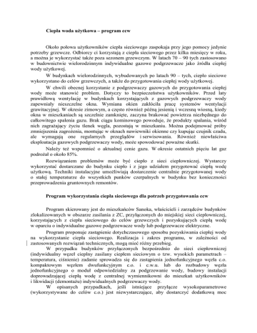 Ciepła woda użytkowa – program ccw Około połowa użytkowników ciepła sieciowego zaspokaja przy jego pomocy jedynie potrzeby grzewcze. Odbiorcy ci korzystają z ciepła sieciowego przez kilka miesięcy w roku, a można je wykorzystać także poza sezonem grzewczym. W latach 70 – 90 tych zastosowano w budownictwie wielorodzinnym indywidualne gazowe podgrzewacze jako źródła ciepłej wody użytkowej. W budynkach wielorodzinnych, wybudowanych po latach 90 – tych, ciepło sieciowe wykorzystano do celów grzewczych, a także do przygotowania ciepłej wody użytkowej. W chwili obecnej korzystanie z podgrzewaczy gazowych do przygotowania ciepłej wody może stanowić problem. Dotyczy to bezpieczeństwa użytkowników. Przed laty prawidłową wentylację w budynkach korzystających z gazowych podgrzewaczy wody zapewniały nieszczelne okna. Wymiana okien zakłóciła pracę systemów wentylacji grawitacyjnej. W okresie zimowym, a często również późną jesienią i wczesną wiosną, kiedy okna w mieszkaniach są szczelnie zamknięte, zaczyna brakować powietrza niezbędnego do całkowitego spalenia gazu. Brak ciągu kominowego powoduje, że produkty spalania, wśród nich zagrażający życiu tlenek węgla, pozostają w mieszkaniu. Można podejmować próby zmniejszenia zagrożenia, montując w oknach nawiewniki okienne czy kupując czujnik czadu, ale wymagają one regularnych przeglądów i serwisowania. Również niewłaściwa eksploatacja gazowych podgrzewaczy wody, może spowodować poważne skutki. Należy też wspomnieć o aktualnej cenie gazu. W okresie ostatnich pięciu lat gaz podrożał o około 85%. Rozwiązaniem problemów może być ciepło z sieci ciepłowniczej. Wystarczy wykorzystać dostarczane do budynku ciepło i z jego udziałem przygotować ciepłą wodę użytkową. Techniki instalacyjne umożliwiają dostarczenie centralnie przygotowanej wody o stałej temperaturze do wszystkich punków czerpalnych w budynku bez konieczności przeprowadzenia gruntownych remontów. Program wykorzystania ciepła sieciowego dla potrzeb przygotowania ccw Program skierowany jest do mieszkańców Sanoka, właścicieli i zarządców budynków zlokalizowanych w obszarze zasilania z ZC, przyłączonych do miejskiej sieci ciepłowniczej, korzystających z ciepła sieciowego do celów grzewczych i pozyskujących ciepłą wodę w oparciu o indywidualne gazowe podgrzewacze wody lub podgrzewacze elektryczne. Program proponuje zastąpienie dotychczasowego sposobu pozyskiwania ciepłej wody na wykorzystanie ciepła sieciowego. Realizacja i zakres programu, w zależności od zastosowanych rozwiązań technicznych, mogą mieć różny przebieg. W przypadku budynków przyłączonych bezpośrednio do sieci ciepłowniczej (indywidualny węzeł cieplny zasilany ciepłem sieciowym o tzw. wysokich parametrach – temperatura, ciśnienie) zadanie sprowadza się do zastąpienia jednofunkcyjnego węzła c.o. kompaktowym węzłem dwufunkcyjnym c.o. i c.w.u. lub do rozbudowy węzła jednofunkcyjnego o moduł odpowiedzialny za podgrzewanie wody, budowy instalacji doprowadzającej ciepłą wodę z centralnej wymiennikowni do mieszkań użytkowników i likwidacji (demontażu) indywidualnych podgrzewaczy wody. W opisanych przypadkach, jeśli istniejące przyłącze wysokoparametrowe (wykorzystywane do celów c.o.) jest niewystarczające, aby dostarczyć dodatkową moc cieplną (przypadki sporadyczne) niezbędną do podgrzania wody, konieczna jest jego przebudowa. Bardziej złożone są projekty, w których konieczne jest doprowadzenie do budynku ciepła sieciowego o wysokich parametrach. Dotyczy to budynków zasilanych w ciepło z niskich parametrów z węzłów grupowych. W takim przypadku koniecznym staje się budowa zasilania budynków, przyłącza do sieci ciepłowniczej wysokich parametrów oraz węzła cieplnego co i ccw (indywidualnego) w budynku, w każdym przypadku niezbędne jest również wykonanie instalacji ccw w budynku Program ccw 1. Przebieg projektu Uczestnikami projektu są: Odbiorca – spółdzielnia, wspólnota mieszkaniowa lub inny właściciel budynku, SPGK Sp. z o. o. Zakład Ciepłowniczy. Do głównych zadań Odbiorcy należą: • wykonanie dokumentacji projektowej instalacji wewnętrznej budynku • uzyskanie niezbędnych pozwoleń na jej wykonanie • wykonanie prac montażowych w budynku • wykonanie prac instalacyjnych w budynku w tym demontaż podgrzewaczy gazowych lub innych. Sanockie Przedsiębiorstwo Gospodarki Komunalnej Sp. z o. o. w Sanoku dostarcza i montuje węzeł ciepłowniczy (moduł węzła ciepłowniczego) oraz zapewnia dostawę ciepła sieciowego o parametrach niezbędnych do podgrzania wody wodociągowej do wymaganej temperatury. W przypadku konieczności budowy przyłącza wysokoparametrowego – finansuje go Przedsiębiorstwo. SPGK Sp. z o. o. prowadzi akcję informacyjną dotyczącą Programu, przedstawia koncepcje typowych wewnętrznych instalacji ciepłej wody użytkowej, pomaga oszacować koszty projektu oraz określić moc cieplną niezbędną dla właściwego funkcjonowania systemu centralnej ciepłej wody użytkowej. 2. Etapy realizacji projektu Projekt rozpoczyna się z inicjatywy właścicieli lokali, mieszkańców, zarządców nieruchomości lub statutowych organów spółdzielni chcących zmodernizować swoje budynki. Inicjatywa ta uruchamia procedury poszukiwania najlepszych rozwiązań, projektowania i wykonawstwa inwestycji. Szczegółowy harmonogram realizacji zadania zależy od specyfiki przedsięwzięcia. Do zadań Odbiorcy należy montaż instalacji rozprowadzenia i cyrkulacji ciepłej wody. SPGK Sp. z o. o. rozbudowuje węzeł o moduł ccw lub montuje nowy (węzeł w przypadku konieczności wykonania nowego przyłącza z sieci wysokoparametrowej). Następnie wszystkie urządzenia i instalacje spinane są w jeden system, który w ciągu jednego dnia połączony zostaje z instalacją ciepłej wody użytkowej w mieszkaniu Odbiorcy. Bezpośred