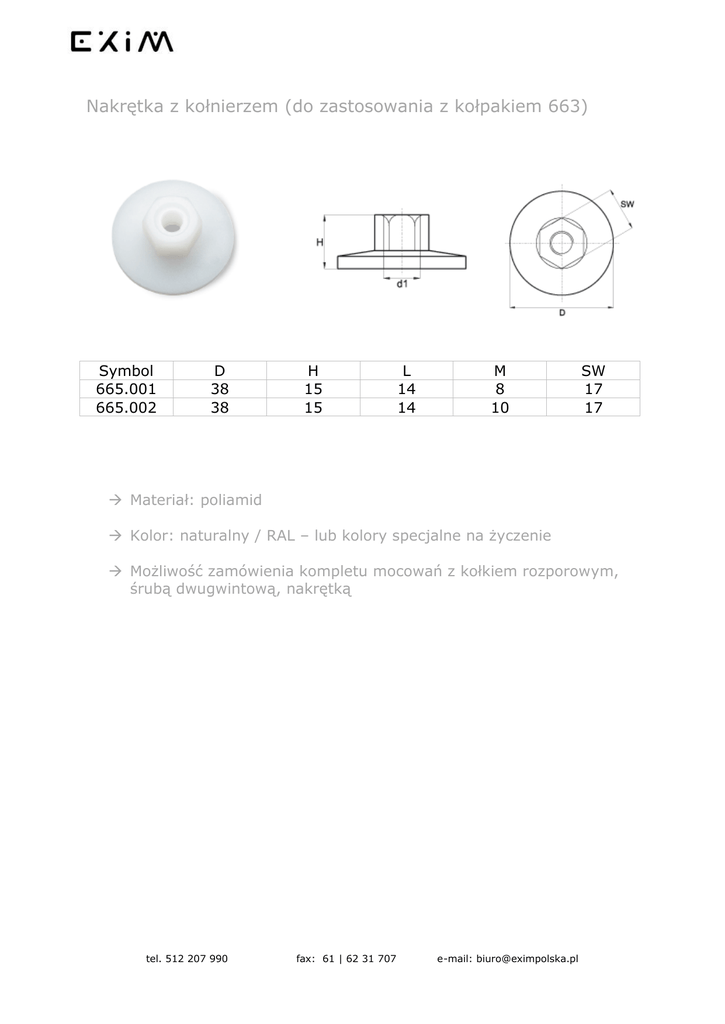 Nakrętka z kołnierzem (do zastosowania z kołpakiem 663) Symbol 665.001 665.002 D 38 38 H 15 15 L 14 14 M 8 10 SW 17 17 Materiał: poliamid Kolor: naturalny / RAL – lub kolory specjalne na życzenie Możliwość zamówienia kompletu mocowań z kołkiem rozporowym, śrubą dwugwintową, nakrętką tel. 512 207 990 fax: 61 | 62 31 707 e-mail: [email protected]