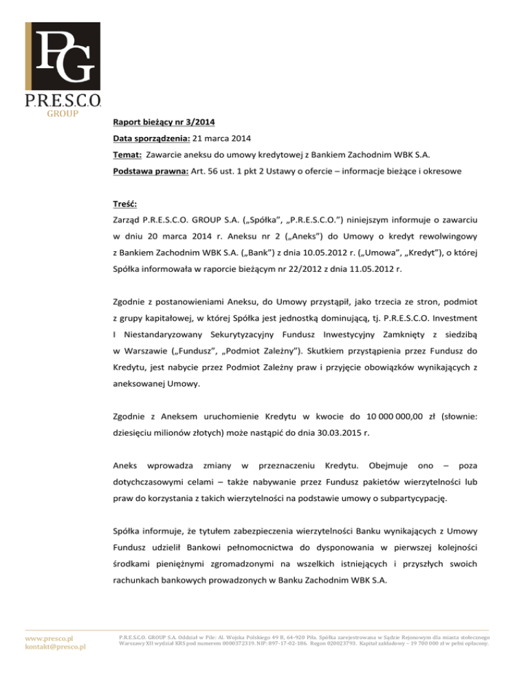 Raport bieżący nr 3/2014 Data sporządzenia: 21 marca 2014 Temat: Zawarcie aneksu do umowy kredytowej z Bankiem Zachodnim WBK S.A. Podstawa prawna: Art. 56 ust. 1 pkt 2 Ustawy o ofercie – informacje bieżące i okresowe Treść: Zarząd P.R.E.S.C.O. GROUP S.A. („Spółka”, „P.R.E.S.C.O.”) niniejszym informuje o zawarciu w dniu 20 marca 2014 r. Aneksu nr 2 („Aneks”) do Umowy o kredyt rewolwingowy z Bankiem Zachodnim WBK S.A. („Bank”) z dnia 10.05.2012 r. („Umowa”, „Kredyt”), o której Spółka informowała w raporcie bieżącym nr 22/2012 z dnia 11.05.2012 r. Zgodnie z postanowieniami Aneksu, do Umowy przystąpił, jako trzecia ze stron, podmiot z grupy kapitałowej, w której Spółka jest jednostką dominującą, tj. P.R.E.S.C.O. Investment I Niestandaryzowany Sekurytyzacyjny Fundusz Inwestycyjny Zamknięty z siedzibą w Warszawie („Fundusz”, „Podmiot Zależny”). Skutkiem przystąpienia przez Fundusz do Kredytu, jest nabycie przez Podmiot Zależny praw i przyjęcie obowiązków wynikających z aneksowanej Umowy. Zgodnie z Aneksem uruchomienie Kredytu w kwocie do 10 000 000,00 zł (słownie: dziesięciu milionów złotych) może nastąpić do dnia 30.03.2015 r. Aneks wprowadza zmiany w przeznaczeniu Kredytu. Obejmuje ono – poza dotychczasowymi celami – także nabywanie przez Fundusz pakietów wierzytelności lub praw do korzystania z takich wierzytelności na podstawie umowy o subpartycypację. Spółka informuje, że tytułem zabezpieczenia wierzytelności Banku wynikających z Umowy Fundusz udzielił Bankowi pełnomocnictwa do dysponowania w pierwszej kolejności środkami pieniężnymi zgromadzonymi na wszelkich istniejących i przyszłych swoich rachunkach bankowych prowadzonych w Banku Zachodnim WBK S.A. www.presco.pl [email protected] P.R.E.S.C.O. GROUP S.A. Oddział w Pile: Al. Wojska Polskiego 49 B, 64-920 Piła. Spółka zarejestrowana w Sądzie Rejonowym dla miasta stołecznego Warszawy XII wydział KRS pod numerem 0000372319. NIP: 897-17-02-186. Regon 020023793. Kapitał zakładowy – 19 700 000 zł w pełni opłacony. Ponadto, w celu zabezpieczenia wykonania zobowiązań określonych w Umowie Fundusz złożył oświadczenie o poddaniu się egzekucji bankowej oraz upoważnił Bank do wystawienia bankowego tytułu egzekucyjnego do kwoty 20 000 000,00 zł (słownie: dwudziestu milionów złotych) na wypadek niewywiązania się z zobowiązań wynikających z tytułu czynności bankowych wykonywanych w ramach Umowy oraz do wystąpienia do sądu z wnioskiem o nadanie temu tytułowi klauzuli wykonalności najpóźniej do dnia 30.03.2018 r. Pozostałe istotne postanowienia Umowy nie uległy zmianie. -2-
