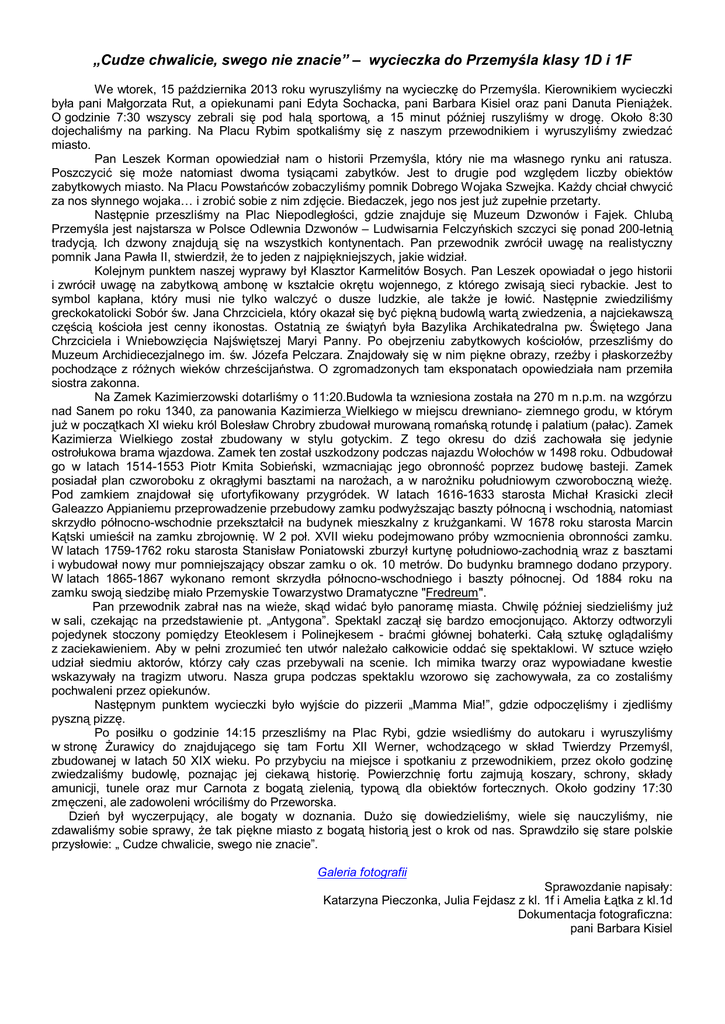 „Cudze chwalicie, swego nie znacie” – wycieczka do Przemyśla klasy 1D i 1F We wtorek, 15 października 2013 roku wyruszyliśmy na wycieczkę do Przemyśla. Kierownikiem wycieczki była pani Małgorzata Rut, a opiekunami pani Edyta Sochacka, pani Barbara Kisiel oraz pani Danuta Pieniążek. O godzinie 7:30 wszyscy zebrali się pod halą sportową, a 15 minut później ruszyliśmy w drogę. Około 8:30 dojechaliśmy na parking. Na Placu Rybim spotkaliśmy się z naszym przewodnikiem i wyruszyliśmy zwiedzać miasto. Pan Leszek Korman opowiedział nam o historii Przemyśla, który nie ma własnego rynku ani ratusza. Poszczycić się może natomiast dwoma tysiącami zabytków. Jest to drugie pod względem liczby obiektów zabytkowych miasto. Na Placu Powstańców zobaczyliśmy pomnik Dobrego Wojaka Szwejka. Każdy chciał chwycić za nos słynnego wojaka… i zrobić sobie z nim zdjęcie. Biedaczek, jego nos jest już zupełnie przetarty. Następnie przeszliśmy na Plac Niepodległości, gdzie znajduje się Muzeum Dzwonów i Fajek. Chlubą Przemyśla jest najstarsza w Polsce Odlewnia Dzwonów – Ludwisarnia Felczyńskich szczyci się ponad 200-letnią tradycją. Ich dzwony znajdują się na wszystkich kontynentach. Pan przewodnik zwrócił uwagę na realistyczny pomnik Jana Pawła II, stwierdził, że to jeden z najpiękniejszych, jakie widział. Kolejnym punktem naszej wyprawy był Klasztor Karmelitów Bosych. Pan Leszek opowiadał o jego historii i zwrócił uwagę na zabytkową ambonę w kształcie okrętu wojennego, z którego zwisają sieci rybackie. Jest to symbol kapłana, który musi nie tylko walczyć o dusze ludzkie, ale także je łowić. Następnie zwiedziliśmy greckokatolicki Sobór św. Jana Chrzciciela, który okazał się być piękną budowlą wartą zwiedzenia, a najciekawszą częścią kościoła jest cenny ikonostas. Ostatnią ze świątyń była Bazylika Archikatedralna pw. Świętego Jana Chrzciciela i Wniebowzięcia Najświętszej Maryi Panny. Po obejrzeniu zabytkowych kościołów, przeszliśmy do Muzeum Archidiecezjalnego im. św. Józefa Pelczara. Znajdowały się w nim piękne obrazy, rzeźby i płaskorzeźby pochodzące z różnych wieków chrześcijaństwa. O zgromadzonych tam eksponatach opowiedziała nam przemiła siostra zakonna. Na Zamek Kazimierzowski dotarliśmy o 11:20.Budowla ta wzniesiona została na 270 m n.p.m. na wzgórzu nad Sanem po roku 1340, za panowania Kazimierza Wielkiego w miejscu drewniano- ziemnego grodu, w którym już w początkach XI wieku król Bolesław Chrobry zbudował murowaną romańską rotundę i palatium (pałac). Zamek Kazimierza Wielkiego został zbudowany w stylu gotyckim. Z tego okresu do dziś zachowała się jedynie ostrołukowa brama wjazdowa. Zamek ten został uszkodzony podczas najazdu Wołochów w 1498 roku. Odbudował go w latach 1514-1553 Piotr Kmita Sobieński, wzmacniając jego obronność poprzez budowę basteji. Zamek posiadał plan czworoboku z okrągłymi basztami na narożach, a w narożniku południowym czworoboczną wieżę. Pod zamkiem znajdował się ufortyfikowany przygródek. W latach 1616-1633 starosta Michał Krasicki zlecił Galeazzo Appianiemu przeprowadzenie przebudowy zamku podwyższając baszty północną i wschodnią, natomiast skrzydło północno-wschodnie przekształcił na budynek mieszkalny z krużgankami. W 1678 roku starosta Marcin Kątski umieścił na zamku zbrojownię. W 2 poł. XVII wieku podejmowano próby wzmocnienia obronności zamku. W latach 1759-1762 roku starosta Stanisław Poniatowski zburzył kurtynę południowo-zachodnią wraz z basztami i wybudował nowy mur pomniejszający obszar zamku o ok. 10 metrów. Do budynku bramnego dodano przypory. W latach 1865-1867 wykonano remont skrzydła północno-wschodniego i baszty północnej. Od 1884 roku na zamku swoją siedzibę miało Przemyskie Towarzystwo Dramatyczne "Fredreum". Pan przewodnik zabrał nas na wieże, skąd widać było panoramę miasta. Chwilę później siedzieliśmy już w sali, czekając na przedstawienie pt. „Antygona”. Spektakl zaczął się bardzo emocjonująco. Aktorzy odtworzyli pojedynek stoczony pomiędzy Eteoklesem i Polinejkesem - braćmi głównej bohaterki. Całą sztukę oglądaliśmy z zaciekawieniem. Aby w pełni zrozumieć ten utwór należało całkowicie oddać się spektaklowi. W sztuce wzięło udział siedmiu aktorów, którzy cały czas przebywali na scenie. Ich mimika twarzy oraz wypowiadane kwestie wskazywały na tragizm utworu. Nasza grupa podczas spektaklu wzorowo się zachowywała, za co zostaliśmy pochwaleni przez opiekunów. Następnym punktem wycieczki było wyjście do pizzerii „Mamma Mia!”, gdzie odpoczęliśmy i zjedliśmy pyszną pizzę. Po posiłku o godzinie 14:15 przeszliśmy na Plac Rybi, gdzie wsiedliśmy do autokaru i wyruszyliśmy w stronę Żurawicy do znajdującego się tam Fortu XII Werner, wchodzącego w skład Twierdzy Przemyśl, zbudowanej w latach 50 XIX wieku. Po przybyciu na miejsce i spotkaniu z przewodnikiem, przez około godzinę zwiedzaliśmy budowlę, poznając jej ciekawą historię. Powierzchnię fortu zajmują koszary, schrony, składy amunicji, tunele oraz mur Carnota z bogatą zielenią, typową dla obiektów fortecznych. Około godziny 17:30 zmęczeni, ale zadowoleni wróciliśmy do Przeworska. Dzień był wyczerpujący, ale bogaty w doznania. Dużo się dowiedzieliśmy, wiele się nauczyliśmy, nie zdawaliśmy sobie sprawy, że tak piękne miasto z bogatą historią jest o krok od nas. Sprawdziło się stare polskie przysłowie: „ Cudze chwalicie, swego nie znacie”. Galeria fotografii Sprawozdanie napisały: Katarzyna Pieczonka, Julia Fejdasz z kl. 1f i Amelia Łątka z kl.1d Dokumentacja fotograficzna: pani Barbara Kisiel
