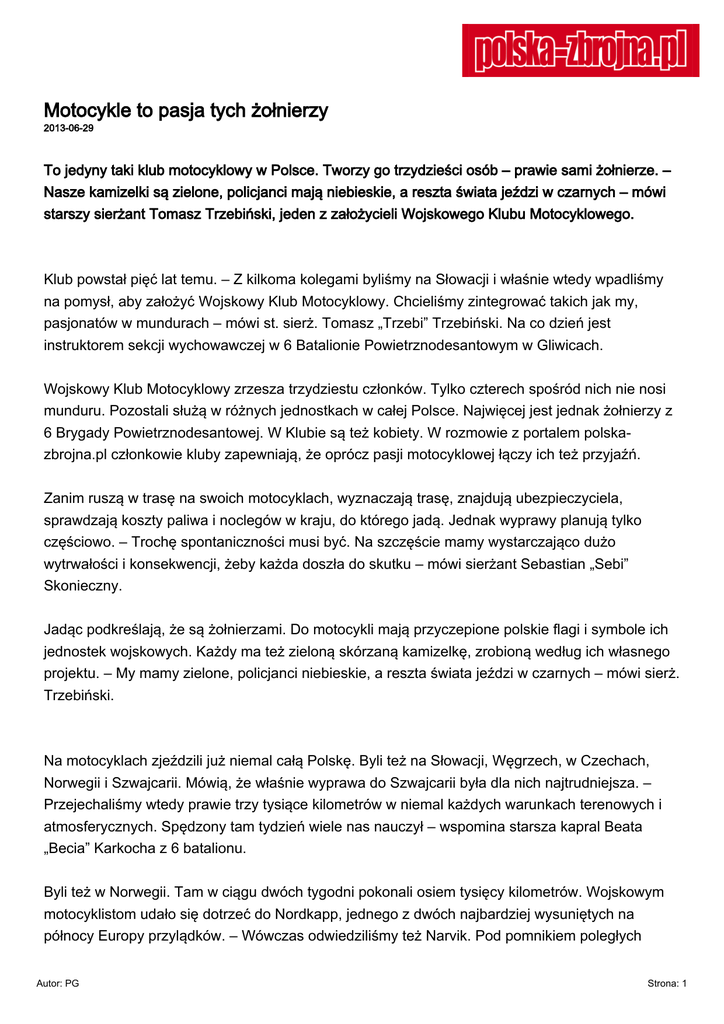 Motocykle to pasja tych żołnierzy 2013-06-29 To jedyny taki klub motocyklowy w Polsce. Tworzy go trzydzieści osób – prawie sami żołnierze. – Nasze kamizelki są zielone, policjanci mają niebieskie, a reszta świata jeździ w czarnych – mówi starszy sierżant Tomasz Trzebiński, jeden z założycieli Wojskowego Klubu Motocyklowego. Klub powstał pięć lat temu. – Z kilkoma kolegami byliśmy na Słowacji i właśnie wtedy wpadliśmy na pomysł, aby założyć Wojskowy Klub Motocyklowy. Chcieliśmy zintegrować takich jak my, pasjonatów w mundurach – mówi st. sierż. Tomasz „Trzebi” Trzebiński. Na co dzień jest instruktorem sekcji wychowawczej w 6 Batalionie Powietrznodesantowym w Gliwicach. Wojskowy Klub Motocyklowy zrzesza trzydziestu członków. Tylko czterech spośród nich nie nosi munduru. Pozostali służą w różnych jednostkach w całej Polsce. Najwięcej jest jednak żołnierzy z 6 Brygady Powietrznodesantowej. W Klubie są też kobiety. W rozmowie z portalem polskazbrojna.pl członkowie kluby zapewniają, że oprócz pasji motocyklowej łączy ich też przyjaźń. Zanim ruszą w trasę na swoich motocyklach, wyznaczają trasę, znajdują ubezpieczyciela, sprawdzają koszty paliwa i noclegów w kraju, do którego jadą. Jednak wyprawy planują tylko częściowo. – Trochę spontaniczności musi być. Na szczęście mamy wystarczająco dużo wytrwałości i konsekwencji, żeby każda doszła do skutku – mówi sierżant Sebastian „Sebi” Skonieczny. Jadąc podkreślają, że są żołnierzami. Do motocykli mają przyczepione polskie flagi i symbole ich jednostek wojskowych. Każdy ma też zieloną skórzaną kamizelkę, zrobioną według ich własnego projektu. – My mamy zielone, policjanci niebieskie, a reszta świata jeździ w czarnych – mówi sierż. Trzebiński. Na motocyklach zjeździli już niemal całą Polskę. Byli też na Słowacji, Węgrzech, w Czechach, Norwegii i Szwajcarii. Mówią, że właśnie wyprawa do Szwajcarii była dla nich najtrudniejsza. – Przejechaliśmy wtedy prawie trzy tysiące kilometrów w niemal każdych warunkach terenowych i atmosferycznych. Spędzony tam tydzień wiele nas nauczył – wspomina starsza kapral Beata „Becia” Karkocha z 6 batalionu. Byli też w Norwegii. Tam w ciągu dwóch tygodni pokonali osiem tysięcy kilometrów. Wojskowym motocyklistom udało się dotrzeć do Nordkapp, jednego z dwóch najbardziej wysuniętych na północy Europy przylądków. – Wówczas odwiedziliśmy też Narvik. Pod pomnikiem poległych Autor: PG Strona: 1 polskich marynarzy ORP „Grom” złożyliśmy kwiaty. Spotkaliśmy się z ogromnym szacunkiem okolicznych mieszkańców. Byli wzruszeni tym, że jesteśmy żołnierzami i że przejechaliśmy taki kawał drogi, by oddać hołd swoim rodakom –opowiada sierż. Michał „Misiek” Karkocha (mąż Beci). – Teraz po „zimnych” podróżach, chcemy się jeszcze w tym roku trochę pogrzać w słońcu. Dlatego już na początku sierpnia wybieramy się na Sycylię – mówi sierż. Trzebiński. Do pokonania żołnierze będą mieli ok. 4 tysiące kilometrów. Tym razem będąc we Włoszech planują oddać hołd polskim żołnierzom spoczywającym na cmentarzu pod Monte Cassino. Gdy mundurowi motocykliści nie są na wyprawi, promują w kraju bezpieczną jazdę i starają się poprawiać wizerunek motocyklistów w społeczeństwie. – Większości Polaków motocyklista kojarzy się z kimś, kto bez rozsądku i wyobraźni szaleje po drogach. My próbujemy walczyć z tym stereotypem. Własnym przykładem staramy się pokazać, że można jeździć bezpiecznie i z głową – podkreśla sierż. Trzebiński Członkowie Wojskowego Klubu Motocyklowego współpracują m. in. z władzami samorządowymi Gliwic, szkołami, policją, klubami innych służb mundurowych oraz ratownikami medycznymi. Angażują się w rozmaite akcje społeczne, mundurowe pikniki, pokazy ratownictwa. Edukują też najmłodszych. – Organizujemy spotkania w szkołach, a dla dzieci z domów dziecka w Gliwicach i Zabrzu zorganizowaliśmy ratowniczy poligon w Pewli Ślemieńskiej –wymienia sierż. Trzebiński. Wojskowi motocykliści współorganizują też integracyjne spotkania „MundurowiNiepełnosprawnym”. Biorą też udział w Wielkiej Orkiestrze Świątecznej Pomocy i na stałe współpracują z fundacjami „Mam marzenie” oraz „Pomocy Potrzebującym”. „Nie jeździj szybciej, niż potrafisz myśleć” to jedno z dziesięciu przykazań wojskowych motocyklistów. Tylko ktoś, kto będzie go przestrzegał może zostać członkiem Klubu. – Mieć motocykl, a być motocyklistą to dwie zupełnie różne sprawy – podkreśla sierż. Trzebiński. Sam mimo ogromnej, zaszczepionej przez rodziców miłości do jednośladów, prawo jazdy na motocykl zrobił dopiero wtedy, gdy uznał, że wyszalał się na tyle, by podczas jazdy nie zrobić sobie krzywdy. Autor: PG Strona: 2