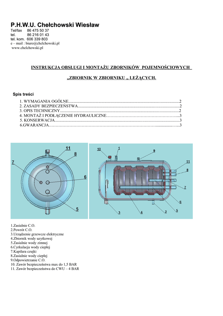 P.H.W.U. Chełchowski Wiesław Tel/fax 86 475 50 37 tel. 86 216 01 43 tel. kom. 606 339 803 e – mail : [email protected] www.chelchowski.pl INSTRUKCJA OBSŁUGI I MONTAŻU ZBORNIKÓW POJEMNOŚCIOWYCH „ZBIORNIK W ZBIORNIKU „ LEŻĄCYCH. Spis treści 1. WYMAGANIA OGÓLNE...........................................................................................................2 2. ZASADY BEZPIECZEŃSTWA..................................................................................................2 3. OPIS TECHNICZNY...................................................................................................................2 4. MONTAŻ I PODŁĄCZENIE HYDRAULICZNE……………………………………………...3 5. KONSERWACJA........................................................................................................................3 6.GWARANCJA……………………………………………………………………................…...3 1.Zasialnie C.O. 2.Powrót C.O. 3.Urządzenie grzewcze elektryczne 4.Zbiornik wody uzytkowej 5.Zasialnie wody zimnej 6.Cyrkulacja wody ciepłej 7.Kapilara czujki 8.Zasialnie wody ciepłej 9.Odpowietrzanie C.O. 10. Zawór bezpieczeństwa max do 1,5 BAR 11. Zawór bezpieczeństwa do CWU – 4 BAR 1.WYMAGANIA OGÓLNE: Niniejsza instrukcja montażu i eksploatacji : jest nieodłączną częścią urządzenia i musi być zawsze przechowywana w miejscu jego użytkowania, skierowana jest jedynie do wykwalifikowanego personelu specjalistycznego, zawiera najważniejsze wskazówki w zakresie bezpiecznego montażu, rozruchu i konserwacji urządzenia, musi być przestrzegana przez wszystkie osoby prowadzące prace przy urządzeniu. 2. ZASADY BEZPIECZEŃSTWA - wszelkie prace przy urządzeniu może wykonywać jedynie wykwalifikowany personel. - wykwalifikowany personel stanowią osoby, które są zaznajomione z montażem, uruchamianiem i konserwacją urządzeń zbiornikowych ciśnieniowych oraz posiadają kwalifikacje wymagane do wykonywania tych czynności, jak np.: wykształcenie, przeszkolenie . Do wnętrza zbiornika nie wolna wkręcać elementów hydraulicznych wykonanych z miedzi ( tuleje pomiarowe, grzałki elektryczne miedziane itp. ) 3. OPIS TECHNICZNY Zbiornik ciśnieniowy nierdzewny płaszczowy jest przeznaczony do grzania wody za pośrednictwem : - opcjonalnej grzałki elektrycznej – Króciec F - wody grzewczej lub płynu kolektora słonecznego jako medium po stronie pierwotnej – króćce płaszcza grzewczego C i D Pojemność Średnica bez Średnica z zbiornika izolacji izolacją (L) (mm) (mm) 100 x 80 420 500 150 x 130 420 500 200 x 100 520 600 260 x 150 520 600 300 x 150 520 600 400 x 250 620 740 Wysokość Moc płaszcza Wydajność ciepłej całkowita zbiornika wewnętrzn. wody 52oC o (mm) przy temp. 70 C (L/h) 890 12 300 1320 20 530 1110 33 700 1350 41 780 1580 50 1110 1530 60 1340 Zbiorniki wykonane są ze stali nierdzewnej produkowanej przez Thyssen Krupp Niemcy i nie wymagają żadnego zabezpieczenia antykorozyjnego. Izolację termiczną płaszcza stanowi pianka poliuretanowa średnio spieniona o grubości 6 cm. Jako wykończenie zastosowano płaszcz z tkaniny SKAY, zasuwany zamkiem błyskawicznym. 4. MONTAŻ I PODŁĄCZENIE HYDRAULICZNE : Ustawienia i uruchomienia może dokonywać tylko specjalistyczna firma instalacyjna. Podgrzewacz należy ustawić w miejscu, gdzie temperatura nie spada poniżej 0ºC. Podgrzewacze są nierdzewne i przeznaczone do normalnej wody pitnej. Dopuszczalna jest instalacja przyłączeniowa dowolna. Podłączenia należy wykonać według wymagań normy EN 806-1 i DIN 4753/1. Wszystkie niewykorzystywane przyłączenia należy zaślepić. Ciśnienia robocze podane na tabliczce znamionowej nie mogą być przekroczone. W razie konieczności należy zainstalować reduktor ciśnienia wody sieciowej. Grzałki elektryczne mogą być instalowane jedynie przez uprawnionych instalatorów. Bezwzględnie należy przestrzegać wymagań IEC 60364 i SEP. Zainstalowana grzałka musi być przeznaczona do zbiornika nierdzewnego. W celu uniknięcia skoków ciśnienia, zminimalizowania uderzeń hydraulicznych w instalacji, oraz otwierania się zaworu bezpieczeństwa, zaleca się montaż odpowiedniego naczynia wzbiorczego z armaturą przepływową, które należy dobrać według odpowiednich norm. Bezwzględnie musi być zamontowany sprężynowy przeponowy zawór bezpieczeństwa. Zawór bezpieczeństwa nie może być zamykany od strony podgrzewacza wody. Ponadto zawór taki musi zadziałać najpóźniej przy dopuszczalnym ciśnieniu roboczym podgrzewacza wody. Minimalna średnica przyłącza zaworu bezpieczeństwa to DN 20. Zawór bezpieczeństwa musi być łatwo dostępny, a jego strona wylotowa skierowana w bezpieczną stronę. Zawór powinien stać pionowo, a wylot nie może być narażony na zamarznięcie. Jeżeli ciśnienie wewnątrz przewodu doprowadzającego zimną wodę do zbiornika przewyższa ciśnienie robocze instalacji, to należy je zmniejszyć co najmniej do wysokości ciśnienia roboczego instalacji poprzez zabudowanie reduktora ciśnienia. NALEŻY BEZWZGLĘDNIE ZACHOWAĆ KOLEJNOŚĆ NAPEŁNIANIA: W PIERWSZEJ KOLEJNOŚCI NAPEŁNIA SIĘ ZBIORNIK ŚRODKOWY , A PÓŹNIEJ ZBIORNIK ZEWNĘTRZNY WODY GRZEWCZEJ !!! Pojemnościowe zbiorniki wody są urządzeniami zaprojektowanymi i wytwarzanymi zgodnie z uznaną praktyką inżynierską i spełniają wymogi Dyrektywy Urządzeń Ciśnieniowych 97/23/WE. Zgodnie z art.3, pkt.3 ( na podstawie tab.4 załącznika II) powyższej Dyrektywy, urządzeniom tego typu nie nadaje się znaku CE. 5. KONSERWACJA : Konserwacja zbiorników wykonanych ze stali nierdzewnej ogranicza się do okresowej kontroli : - zaworu bezpieczeństwa – raz na pół roku - sprawdzeniu stanu naczynia przeponowego - raz na pół roku - w razie potrzeby zbiornik powinien zostać poddany przepłukaniu 6. GWARANCJA : 1. Gwarancja na sprawne działanie zbiornika, udzielana jest przez produc