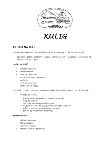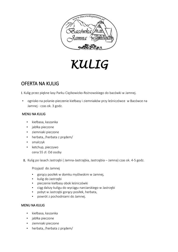 KULIG OFERTA NA KULIG I. Kulig przez piękne lasy Parku Ciężkowicko-Rożnowskiego do bacówki w Jamnej. • ognisko na polanie-pieczenie kiełbasy i ziemniaków przy leśniczówce w Bacówce na Jamnej - czas ok. 3 godz. MENU NA KULIG • • • • • • kiełbasa, kaszanka jabłka pieczone ziemniaki pieczone herbata, /herbata z prądem/ smalczyk ketchup, pieczywo cena 55 zł. Od osoby II. Kulig po lasach Jastrzębi ( Jamna-Jastrzębia, Jastrzębia – Jamna) czas ok. 4-5 godz. Przyjazd do Jamnej • • • • • • gorący posiłek w domku myśliwskim w Jamnej, kulig do Jastrzębi pieczenie kiełbasy obok leśniczówki ciąg dalszy kuligu do wyciągu narciarskiego w Jastrzębi pobyt w Jastrzębi gorący posiłek, herbata, powrót z pochodniami do Jamnej. MENU NA KULIG • • • • kiełbasa, kaszanka jabłka pieczone ziemniaki pieczone herbata, /herbata z prądem/ • • smalczyk ketchup, pieczywo Cena od osoby 75 zł. III. Kulig przez piękne lasy Parku Ciężkowicko-Rożnowskiego do Bacówki w Jamnej. • ognisko na polanie-pieczenie kiełbasy i ziemniaków przy leśniczówce w Bacówce na Jamnej. - czas ok. 3 godz., • biesiada (posiłek gorący), wieczorek przy muzyce mechanicznej MENU NA KULIG • kiełbasa, kaszanka • jabłka pieczone • ziemniaki pieczone • herbata, /herbata z prądem/ • smalczyk • ketchup, pieczywo Cena 130 zł od osoby (w cenie jest nocleg, oraz biesiada). cena od osoby 75 zł. z noclegiem. Korzystając z pięknej polskiej zimy chcielibyśmy zaprosić Państwa do skorzystania z aktywnego wypoczynku na świeżym powietrzu na stoku narciarskim w Jastrzębi gm. Ciężkowice. W zależności od liczby osób proponuję spotkanie w celu ustalenia szczegółów związanych z kuligiem, wyżywieniem. Zainteresowane osoby prosimy o kontakt: tel. 501 455 306 SERDECZNIE ZAPRASZAMY - NA SPĘDZENIE CZASU W BACÓWCE JAMNA, W NIESAMOWITYM KLIMACIE GÓRSKIM!