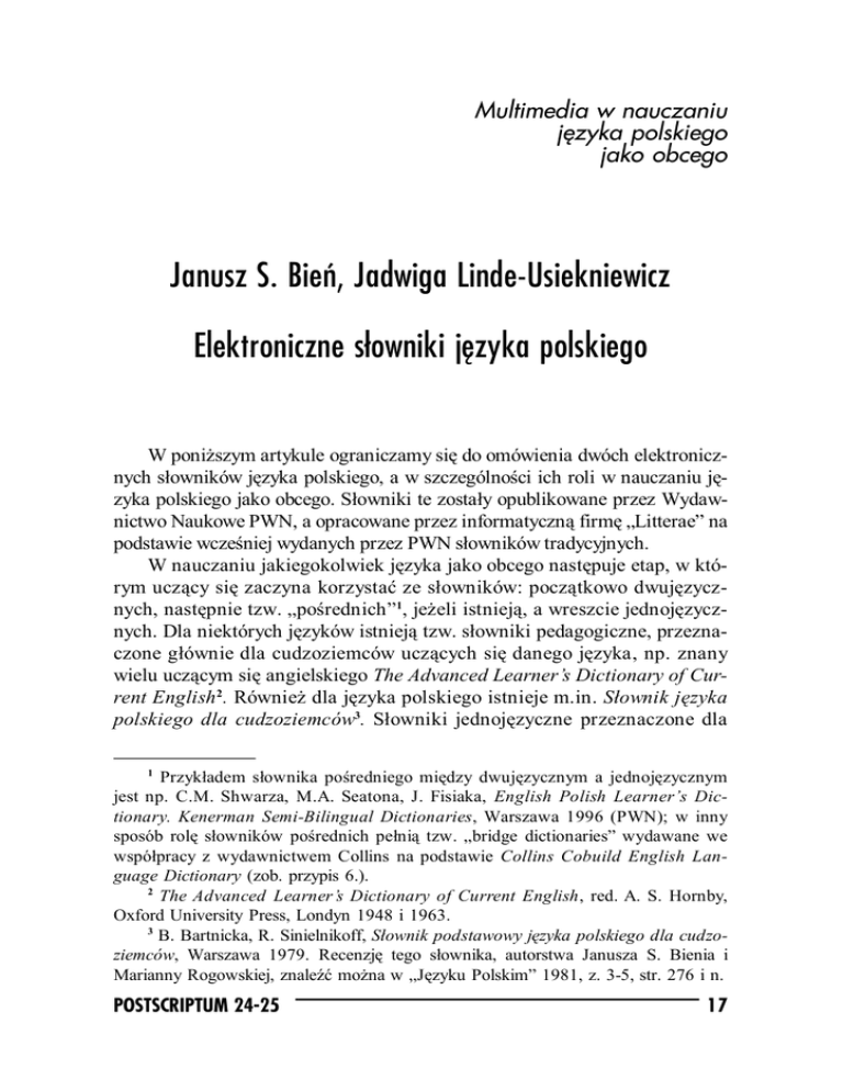 Multimedia w nauczaniu jêzyka polskiego jako obcego Janusz S. Bieñ, Jadwiga Linde-Usiekniewicz Elektroniczne s³owniki jêzyka polskiego W poniższym artykule ograniczamy się do omówienia dwóch elektronicznych słowników języka polskiego, a w szczególności ich roli w nauczaniu języka polskiego jako obcego. Słowniki te zostały opublikowane przez Wydawnictwo Naukowe PWN, a opracowane przez informatyczną firmę „Litterae” na podstawie wcześniej wydanych przez PWN słowników tradycyjnych. W nauczaniu jakiegokolwiek języka jako obcego następuje etap, w którym uczący się zaczyna korzystać ze słowników: początkowo dwujęzycznych, następnie tzw. „pośrednich”1, jeżeli istnieją, a wreszcie jednojęzycznych. Dla niektórych języków istnieją tzw. słowniki pedagogiczne, przeznaczone głównie dla cudzoziemców uczących się danego języka, np. znany wielu uczącym się angielskiego The Advanced Learner’s Dictionary of Current English2. Również dla języka polskiego istnieje m.in. Słownik języka polskiego dla cudzoziemców3. Słowniki jednojęzyczne przeznaczone dla 1 Przykładem słownika pośredniego między dwujęzycznym a jednojęzycznym jest np. C.M. Shwarza, M.A. Seatona, J. Fisiaka, English Polish Learner’s Dictionary. Kenerman Semi-Bilingual Dictionaries, Warszawa 1996 (PWN); w inny sposób rolę słowników pośrednich pełnią tzw. „bridge dictionaries” wydawane we współpracy z wydawnictwem Collins na podstawie Collins Cobuild English Language Dictionary (zob. przypis 6.). 2 The Advanced Learner’s Dictionary of Current English, red. A. S. Hornby, Oxford University Press, Londyn 1948 i 1963. 3 B. Bartnicka, R. Sinielnikoff, Słownik podstawowy języka polskiego dla cudzoziemców, Warszawa 1979. Recenzję tego słownika, autorstwa Janusza S. Bienia i Marianny Rogowskiej, znaleźć można w „Języku Polskim” 1981, z. 3-5, str. 276 i n. POSTSCRIPTUM 24-25 17 uczących się danego języka jako obcego mogą różnić się od ogólnych wyłącznie doborem prezentowanego słownictwa (np. obejmować wyłącznie słownictwo współczesne, niespecjalistyczne, należące do wspólnego zasobu polszczyzny4, a także o dużej frekwencji tekstowej – innymi słowy takie, z którym uczący spotyka się najczęściej i którego znajomość jest najbardziej potrzebna dla sprawnej komunikacji). Istnieją jednak słowniki jednojęzyczne, w których sposób formułowania definicji jest specjalnie przystosowany do potrzeb uczących się, np. przez zawężenie listy słów pojawiających się w definicjach do najbardziej podstawowych 5 bądź budowanie definicji odwołujących się do najbardziej oczywistych doświadczeń czytelnika 6. Jest oczywiste, że w początkowych etapach nauczania zaleca się korzystanie ze słowników dwujęzycznych tak długo, dopóki znajomość języka obcego pozostaje niewystarczająca, by zrozumieć definicje słownikowe w języku obcym7. Niezależnie jednak od trudności ze zrozumieniem definicji słownikowych, warunkiem możliwości korzystania ze słownika jest umiejętność znalezienia danego słowa w słowniku, czyli ustalenia postaci wyrazu hasłowego i jego pisowni8, a następnie znalezienia właściwego miejsca alfabetycznego9. 4 A. Markowski, Leksyka wspólna różnym odmianom polszczyzny, Wrocław 1992. Longman Dictionary of Contemporary English, red. P. Procter, Longman 1978. 6 Przykładem jest tu Collins Cobuild English Language Dictionary pod red. J. Sinclaira (1987), którego sposób prezentacji artykułów hasłowych chwalą sobie również nierodzimi użytkownicy języka angielskiego. 7 Zaletą wymienionych w przypisach 5. i 6. słowników jest to, że uczący się może z nich korzystać stosunkowo wcześnie. Niemniej wszelkie osoby korzystające z jednojęzycznego słownika języka obcego prędzej czy później znajdą się w takiej sytuacji, że znaleziona definicja słownikowa nie jest dla nich zrozumiała. Normalną metodą postępowania w takich wypadkach jest wyszukiwanie w tym samym słowniku objaśnień nieznanych słów występujących w definicji. Metoda ta jest zwykle skuteczna, aczkolwiek czasochłonna. 8 W językach o trudnej pisowni, takich jak angielski, kłopoty miewają również słabo wykształceni rodzimi użytkownicy tego języka. W wypadku polskiego jest to znacznie łatwiejsze, gdyż możliwości ortograficznego zapisu dźwięków w odpowiednich kontekstach są dość ograniczone: problem stwarza pisownia ch : h, ó : u, rz : ż, bardzo rzadko u : ł oraz asymilacja co do dźwięczności. 9 Pomija się zwykle problem różnic między językami w zakresie miejsca alfabetycznego związanego z literami ze znakami diakrytycznymi oraz z dwuznakami. Tak na przykład w języku polskim dwuznaki (ch, sz, rz) pojawiają się w miejscu wynikającym z ich składu literowego; z kolei w czeskim dwuznak ch jest traktowany jako osobna litera, następująca po h. Więcej na ten temat np. w: A. Ziabicki, Dwustopniowe porządkowanie haseł leksykograficznych w różnych językach, Raport IPPT PAN, Warszawa 1990 i tegoż autora The Theory of Ordering 5 18 POSTSCRIPTUM 24-25 Ustalenie pisowni wyrazu jest oczywiście najtrudniejsze w wypadku tekstów mówionych, z tym, że problem ich rozpoznawania pojawia się w nauczaniu języka obcego dość późno – dopiero wtedy, kiedy to uczącym zaleca się słuchanie tekstów w obcym języku samodzielnie i bez przygotowania, np. z telewizji lub radia. Natomiast problem rozpoznawania postaci hasłowej wyrazu pojawia się przy pierwszym kontakcie z tekstem pisanym. W językach o stosunkowo prostej morfologii powierzchniowej, zwłaszcza takich, w której ma ona charakter aglutynacyjny, trudności są niewielkie: słowoformy poszczególnych leksemów mają tak dużą wspólną część początkową, że na podstawie zapisu dowolnej słowoformy można znaleźć szukany wyraz w słowniku10. W polskim, w przeciwieństwie do języków zachodnioeuropejskich morfologia p