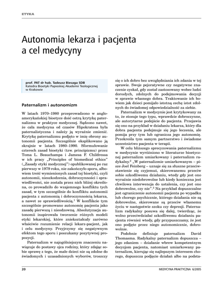 ETYKA Autonomia lekarza i pacjenta a cel medycyny prof. PAT dr hab. Tadeusz Biesaga SDB Katedra Bioetyki Papieskiej Akademii Teologicznej w Krakowie Paternalizm i autonomizm W latach 1970–1980 przeprowadzono w angloamerykańskiej bioetyce dość ostrą krytykę paternalizmu w praktyce medycznej. Sądzono nawet, że cała medycyna od czasów Hipokratesa była paternalistyczna i należy ją wyraźnie zmienić. Krytykę paternalizmu podjęto w imię obrony autonomii pacjenta. Szczególnie eksplikowano ją skrajnie w latach 1980–1990. Sformułowanie czterech zasad bioetyki (tzw. principizmu) przez Toma L. Beauchampa i Jamesa F. Childressa w ich pracy „Principles of biomedical ethics” („Zasady etyki medycznej”) opublikowanej po raz pierwszy w 1979 roku, nie zakończyło sporu, albowiem treść wymienionych zasad tej bioetyki, czyli autonomii, nieszkodzenia, dobroczynności i sprawiedliwości, nie została przez nich bliżej określona, co prowadziło do wzajemnego konfliktu tych zasad, w tym szczególnie do konfliktu autonomii pacjenta z autonomią i dobroczynnością lekarza, a nawet ze sprawiedliwością.1 W konflikcie tym szczególnie promowano autonomię pacjenta jako zasadę pierwszą i nieodzowną. Absolutyzacja autonomii inspirowała tworzenie różnych modeli etyki lekarskiej, które zniekształcały zarówno właściwie rozumienie relacji lekarz-pacjent, jak i celu medycyny. Przyjrzymy się negatywnym efektom tego sporu i poszukamy pozytywnej propozycji. Paternalizm w najogólniejszym znaczeniu nawiązuje do postawy ojca rodziny, który zdając sobie sprawę z tego, że małe dzieci nie są zdolne do świadomych i uzasadnionych wyborów, troszczy 20 się o ich dobro bez uwzględniania ich zdania w tej sprawie. Swoje pejoratywne czy negatywne znaczenie zyskał, gdy został zastosowany wobec ludzi dorosłych, zdolnych do podejmowania decyzji w sprawie własnego dobra. Traktowanie ich bowiem jak dzieci pomijało istotną cechę istot zdolnych do świadomej odpowiedzialność za siebie. Paternalizm w medycynie jest krytykowany za to, że stosuje tego typu, wprawdzie dobroczynne, ale autorytarne podejście do pacjenta. Przejawia się ono na przykład w działaniu lekarza, który dla dobra pacjenta podejmuje się jego leczenia, ale pomija przy tym lub ogranicza jego autonomię. Przekreśla tym samym partnerstwo i świadome uczestnictwo pacjenta w terapii. W celu bliższego sprecyzowania paternalizmu w medycynie wyróżniono w literaturze bioetycznej paternalizm umiarkowany i paternalizm radykalny.2 „W paternalizmie umiarkowanym – pisze Joel Feinberg – uznaje się za słuszne przeciwstawienie się czyjemuś, skierowanemu przeciw sobie szkodliwemu działaniu, wtedy gdy jest ono wyraźnie niedobrowolne lub kiedy konieczna jest chwilowa interwencja do ustalenia, czy jest ono dobrowolne, czy nie”.3 Na przykład dopuszczalne jest ograniczenie autonomii pacjenta po wypadku lub chorego psychicznie, którego działania nie są dobrowolne, skierowane są przeciw własnemu życiu w następstwie szoku czy depresji. Paternalizm radykalny posuwa się dalej, twierdząc, że wolno przeciwdziałać szkodliwemu działaniu pacjenta również wtedy, gdy przypuszczamy, że jest ono podjęte przez niego autonomicznie, dobrowolnie. Podobnie definiuje paternalizm David Thomasma. Radykalny paternalizm dopuszcza – jego zdaniem – działanie wbrew kompetentnym decyzjom pacjenta, natomiast umiarkowany paternalizm, kierując się najlepszym interesem chorego, dopuszcza podjęcie działań albo na podstaMEDYCYNA PRAKTYCZNA 6/2005 ETYKA wie domniemanej zgody pacjenta, albo na podstawie usprawiedliwionego braku zgody, w przypadku jego małoletniości czy ciężkiej choroby.4 Chociaż krytyka pewnych przejawów autorytaryzmu w praktyce medycznej słusznie uwypukliła rolę pacjenta, jego godność i wolność, to jednak absolutyzacja autonomii u podstaw etyki medycznej przyniosła też wiele szkód. Działo się tak dlatego, że po pierwsze: pojęcie autonomii czerpano z nurtów sceptycznych, podważających zdolność rozumu do rozpoznania obiektywnego celu medycyny, prawdziwego dobra osoby, pacjenta, a po drugie: pojęcie autonomii związane było z dualistyczną antropologią odziedziczoną po Kartezjuszu czy Kancie, w której czystą wolność przeciwstawiono wszystkiemu, co cielesne, jako względem niej zewnętrzne i jej zagrażające. W konsekwencji uznanie zdrowia za dobro, dobro ciała pacjenta, a nawet dobro jego psychiki, zostało uzależnione od jego decyzji, a więc przestało być obiektywnym dobrem człowieka jako takiego. Poza tym rozumienie relacji międzyludzkich zaczerpnięto z naturalistycznych interpretacji naszych zachowań, inspirowanych teorią walki egoistów Tomasza Hobbesa czy teorią walki o byt Karola Darwina, lub nawet walki klas Karola Marksa. W tym kontekście spór paternalizm-autonomizm okazał się sporem dwóch form tego samego indywidualizmu, sporem egoistycznej wolności pacjenta i egoistycznej wolności lekarza.5 Zabrakło w nim odwołania się do obiektywnego celu medycyny, obiektywnego dobra pacjenta i wyznaczenia na tej postawie zasad dobroczynnego działania. To właśnie sama indywidualna decyzja, niezależnie od tego jaki czyn wyzwala, stała się źródłem dobra. Takie rozumienie autonomii prezentują choćby Robert Veatch czy Hugo Engelhardt. Dla pierwszego autonomia nadaje każdemu czynowi „znamię słuszności niezależnie od tego, czy czyn jest dobry, czy zły. (...) Respektowanie takiej autonomii jest moralnym obowiązkiem, nawet wtedy gdy nie prowadzi ona do jakiegokolwiek dobra”.6 W ten sposób autonomia postawiona jest przed i ponad dobrem pacjenta. Podważa ona obiektywny świat wartości. Odtąd w pluralistycznym świecie można będzie mówić o pluralizmie przeróżnych wartości, uznanych za takie aktem decyzji. Wartości te nie mają więc żadnego transcendentnego uzasadnienia poza Autonomia lekarza i pacjenta a cel medycyny własną w