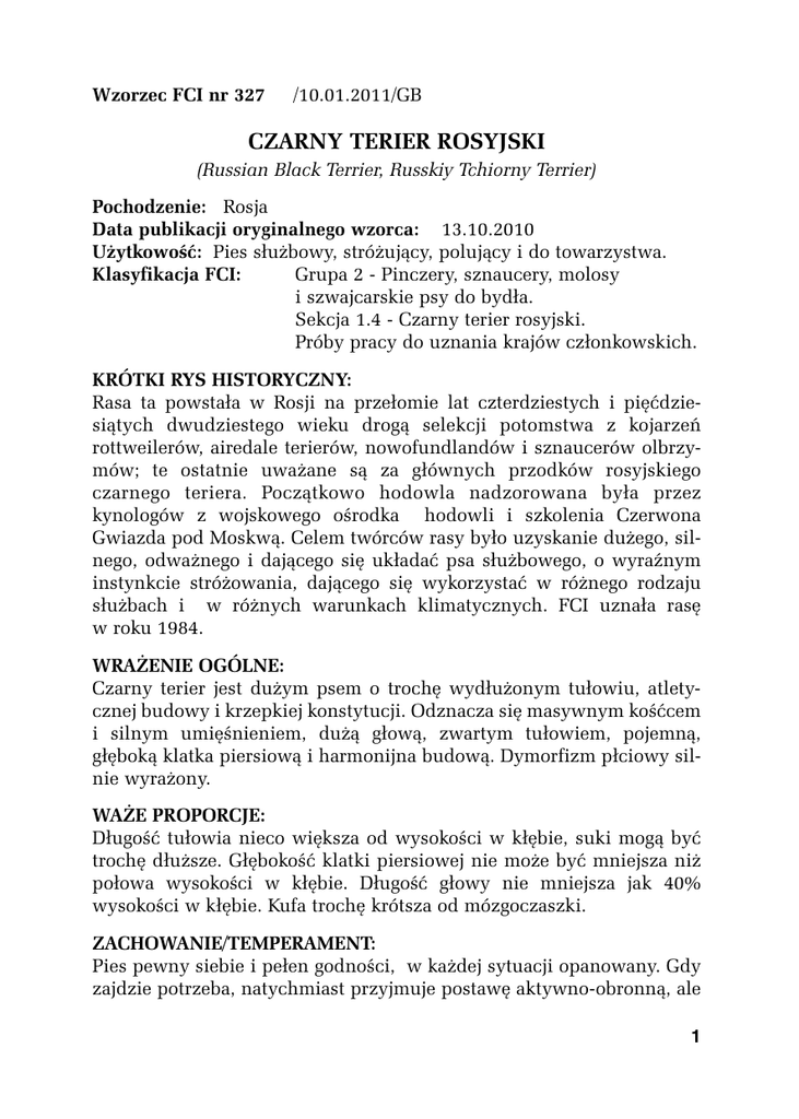 Wzorzec FCI nr 327 /10.01.2011/GB CZARNY TERIER ROSYJSKI (Russian Black Terrier, Russkiy Tchiorny Terrier) Pochodzenie: Rosja Data publikacji oryginalnego wzorca: 13.10.2010 Użytkowość: Pies służbowy, stróżujący, polujący i do towarzystwa. Klasyfikacja FCI: Grupa 2 - Pinczery, sznaucery, molosy i szwajcarskie psy do bydła. Sekcja 1.4 - Czarny terier rosyjski. Próby pracy do uznania krajów członkowskich. KRÓTKI RYS HISTORYCZNY: Rasa ta powstała w Rosji na przełomie lat czterdziestych i pięćdziesiątych dwudziestego wieku drogą selekcji potomstwa z kojarzeń rottweilerów, airedale terierów, nowofundlandów i sznaucerów olbrzymów; te ostatnie uważane są za głównych przodków rosyjskiego czarnego teriera. Początkowo hodowla nadzorowana była przez kynologów z wojskowego ośrodka hodowli i szkolenia Czerwona Gwiazda pod Moskwą. Celem twórców rasy było uzyskanie dużego, silnego, odważnego i dającego się układać psa służbowego, o wyraźnym instynkcie stróżowania, dającego się wykorzystać w różnego rodzaju służbach i w różnych warunkach klimatycznych. FCI uznała rasę w roku 1984. WRAŻENIE OGÓLNE: Czarny terier jest dużym psem o trochę wydłużonym tułowiu, atletycznej budowy i krzepkiej konstytucji. Odznacza się masywnym kośćcem i silnym umięśnieniem, dużą głową, zwartym tułowiem, pojemną, głęboką klatka piersiową i harmonijna budową. Dymorfizm płciowy silnie wyrażony. WAŻE PROPORCJE: Długość tułowia nieco większa od wysokości w kłębie, suki mogą być trochę dłuższe. Głębokość klatki piersiowej nie może być mniejsza niż połowa wysokości w kłębie. Długość głowy nie mniejsza jak 40% wysokości w kłębie. Kufa trochę krótsza od mózgoczaszki. ZACHOWANIE/TEMPERAMENT: Pies pewny siebie i pełen godności, w każdej sytuacji opanowany. Gdy zajdzie potrzeba, natychmiast przyjmuje postawę aktywno-obronną, ale 1 szybko uspokaja się, gdy zagrożenie mija. Oprócz ładnego wyglądu czarny terier odznacza się przyjaznym nastawieniem i wielką wytrzymałością. Dobrze reaguje na szkolenie, przystosowuje się do każdego klimatu, jest chętny do pracy i godny zaufania. GŁOWA: Mózgoczaszka: Głowa powinna być proporcjonalna do tułowia, ale duża, masywna i długa. Czaszka: Średniej szerokości, czoło płaskie. Linie profilu równoległe. Łuki brwiowe i guz potyliczny średnio rozwinięte. Stop: Widoczny, ale nie bardzo mocno zaznaczony. Trzewioczaszka: Nos: Duży i czarny. Kufa: Mocna, szeroka, trochę krótsza od czaszki, szeroka u nasady i lekko zwężająca sie ku nosowi. Wąsy i broda podkreślają siłę kufy i nadają jej kanciasty, tępy kształt. Wargi: Grube, dobrze pigmentowane i przylegające. Krawędzie warg ciemne. Uzębienie: Zęby duże, białe, bez odstępów; dolne siekacze ustawione w jednej linii. Uzębienie kompletne (42 zęby), zgryz nożycowy. Policzki: Suche, zaokrąglone, ale niezbyt wyraźne. Oczy: Średniej wielkości, owalne, osadzone szeroko i frontalnie, ciemne. Powieki przylegające, czarne. Uszy: Wiszące, osadzone wysoko i symetrycznie, średniej wielkości, trójkątnego kształtu, przednimi krawędziami przylegające do policzków. Małżowina gruba, bez fałd. SZYJA: Mocna, sucha i dobrze umięśniona. Jej długość jest mniej więcej równa długości głowy. Noszona pod kątem 45 – 50o względem poziomu. Kark mocny, wyraźny. TUŁÓW: Solidny, głęboki i pojemny, wyważony. Linia górna: Lekko opadająca od kłębu do nasady ogona. Kłąb: Wysoki, rozbudowany, u samców bardziej wyraźny, niż u suk. Grzbiet: Mocny, prosty, umięśniony. Długość samego grzbietu wynosi połowę długości tułowia od kłębu do nasady ogona. Lędźwie: Szerokie, krótkie, umięśnione i lekko wysklepione. Ich długość wynosi połowę długości grzbietu, Zad: Szeroki, umięśniony, lekko opadający, średniej długości. 2 Klatka piersiowa: Głęboka, szeroka i długa, o lekko wysklepionych żebrach, na przekroju owalna. Mostek długi, przedpiersie wystaje nieznacznie przed staw barkowy i jest dobrze umięśnione. Linia dolna i brzuch: Na wysokości łokcia lub nieco niżej. Brzuch umiarkowanie podciągnięty, słabizna mało wyraźna. OGON: Gruby u nasady, wysoko osadzony. W ruchu wesoło noszony, ale jego nasada nie powinna być nachylona nad grzbietem (ogon wiewiórczy). W kraju pochodzenia ogon jest tradycyjnie cięty; kształt i długość ogona nieciętego nie wpływa na ocenę psa. Pożądany kształt sierpowaty lub szablasty. KOŃCZYNY: Kończyny przednie: Wygląd ogólny: Oglądane z przodu proste i równolegle. Odległość od podłoża do łokcia stanowi 50-52% wysokości w kłębie. Łopatka: Długa, szeroka, i wyraźnie skośnie ułożona. Kąt w stawie barkowym zbliżony do 100o. Ramię: Umięśnione, nie krótsze od łopatki. Łokcie: Przylegające do tułowia. Przedramię: Proste, o mocnych, okrągłych na przekroju kościach. Oglądane z przodu i z boku – pionowe. Śródstopie: Krótkie, masywne, oglądane z boku trochę nachylone do podłoża. Łapy: Duże, zwarte, okrągłe. Pazury i opuszki czarne. Kończyny tylne: Wygląd ogólny: Oglądane z tyłu proste i równolegle, ustawione szerzej, niż przednie. Oglądane z boku ustawione trochę za psem. Udo: Średniej długości, lekko nachylone, szerokie, o dobrze rozwiniętych mięśniach. Kolano: Dobrze kątowane. Podudzie: Nie krótsze od uda. Śródstopie: Mocne, krótkie, pionowe. Bez wilczych pazurów. Łapy: Troche mniejsze od przednich, i bardziej owalne. Pazury i opuszki czarne. CHODY: Swobodne, harmonijne, ze swobodną akcją stawów. Typowym ruchem jest energiczny kłus o długim kroku, na który pozwala mocna akcja tyłu, ze znacznym wykrokiem. Grzbiet w ruchu równy. 3 SKÓRA: Napięta, przylegająca, nie luźna, bez fałd, elastyczna i równomiernie pigmentowana. SZATA: Sierść: Gęsta, szorstka, dwuwarstwowa, składa się z twardej, gęstej, lekko pofalowanej okrywy, okrywającej ca