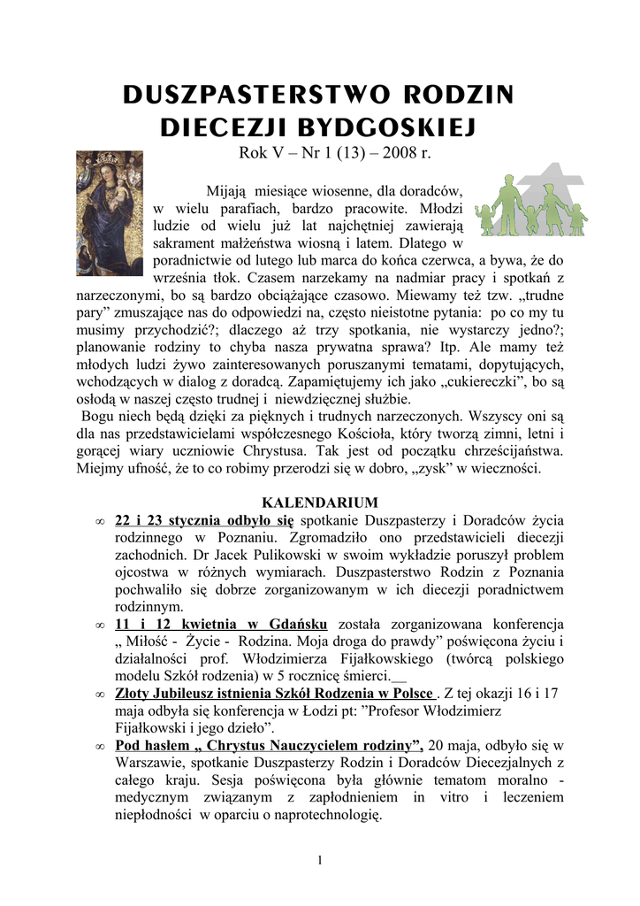 DUSZPASTERSTWO RODZIN DIECEZJI BYDGOSKIEJ Rok V – Nr 1 (13) – 2008 r. Mijają miesiące wiosenne, dla doradców, w wielu parafiach, bardzo pracowite. Młodzi ludzie od wielu już lat najchętniej zawierają sakrament małżeństwa wiosną i latem. Dlatego w poradnictwie od lutego lub marca do końca czerwca, a bywa, że do września tłok. Czasem narzekamy na nadmiar pracy i spotkań z narzeczonymi, bo są bardzo obciążające czasowo. Miewamy też tzw. „trudne pary” zmuszające nas do odpowiedzi na, często nieistotne pytania: po co my tu musimy przychodzić?; dlaczego aż trzy spotkania, nie wystarczy jedno?; planowanie rodziny to chyba nasza prywatna sprawa? Itp. Ale mamy też młodych ludzi żywo zainteresowanych poruszanymi tematami, dopytujących, wchodzących w dialog z doradcą. Zapamiętujemy ich jako „cukiereczki”, bo są osłodą w naszej często trudnej i niewdzięcznej służbie. Bogu niech będą dzięki za pięknych i trudnych narzeczonych. Wszyscy oni są dla nas przedstawicielami współczesnego Kościoła, który tworzą zimni, letni i gorącej wiary uczniowie Chrystusa. Tak jest od początku chrześcijaństwa. Miejmy ufność, że to co robimy przerodzi się w dobro, „zysk” w wieczności. • • • • KALENDARIUM 22 i 23 stycznia odbyło się spotkanie Duszpasterzy i Doradców życia rodzinnego w Poznaniu. Zgromadziło ono przedstawicieli diecezji zachodnich. Dr Jacek Pulikowski w swoim wykładzie poruszył problem ojcostwa w różnych wymiarach. Duszpasterstwo Rodzin z Poznania pochwaliło się dobrze zorganizowanym w ich diecezji poradnictwem rodzinnym. 11 i 12 kwietnia w Gdańsku została zorganizowana konferencja „ Miłość - Życie - Rodzina. Moja droga do prawdy” poświęcona życiu i działalności prof. Włodzimierza Fijałkowskiego (twórcą polskiego modelu Szkół rodzenia) w 5 rocznicę śmierci. Złoty Jubileusz istnienia Szkół Rodzenia w Polsce . Z tej okazji 16 i 17 maja odbyła się konferencja w Łodzi pt: ”Profesor Włodzimierz Fijałkowski i jego dzieło”. Pod hasłem „ Chrystus Nauczycielem rodziny”, 20 maja, odbyło się w Warszawie, spotkanie Duszpasterzy Rodzin i Doradców Diecezjalnych z całego kraju. Sesja poświęcona była głównie tematom moralno medycznym związanym z zapłodnieniem in vitro i leczeniem niepłodności w oparciu o naprotechnologię. 1 • 25 maja po raz kolejny ulicami Warszawy przejdzie Marsz dla życia. Marsz rozpocznie się o godzinie 12.00 na ulicy Nowy Świat. Z życia Katolickiego Poradnictwa Rodzinnego • Do parafii dotarły książeczki pt.: „Rodzina a ludzka prokreacja” • • • • • • wydane przez Papieską Radę ds. Rodziny. Pytajmy proboszczów o nie, bo jest to nasza lektura obowiązkowa (jeżeli ktoś chciałby sobie kupić to proszę dzwonić na 510 069 028). Wysłaliśmy też w kwietniu najnowszy numer „Spraw Rodziny”. W dniach 5 stycznia w Górce Klasztornej i 13 stycznia w WSD w Bydgoszczy odbyły się spotkania opłatkowe dla doradców życia rodzinnego. Po Eucharystii podzieliliśmy się opłatkiem, rozradowaliśmy się śpiewem kolęd i wzajemnym poznawaniem. Trwają wiosenne skupienia w dekanatach. Rozpoczęły się w lutym w Dekanacie I, a zakończą w Górce Klasztornej 31 maja o godz. 11.00. Zapraszamy tych doradców, którym nie było dane być w „swoim” dekanacie. Jest piękna pogoda. Warto z rodziną wybrać się do sanktuarium w Górce i w pełni uczestniczyć w skupieniu doradców. Od lutego grupa doradców w Bazylice (4 kursy), u MB Częstochowskiej, w Zmartwychwstaniu Pańskim, u Św. Marka, u Św. Mateusza prowadzi kursy dla narzeczonych. Serdeczne Bóg zapłać za wszelki trud, zaangażowanie, poświęcony czas i dzielenie się wiedzą. Grupa doradców prowadziła spotkania dla młodzieży podczas rekolekcji wielkopostnych. Księża proboszczowie zaprosili doradców w kilku parafiach do poprowadzenia katechez dla młodzieży ponadgimnazjalnej. Wszystkim tym Doradcom Bóg Zapłać Od 27 do 29 czerwca odbędą się rekolekcje dla Doradców Życia Rodzinnego, tradycyjnie w Domu Rekolekcyjnym na Piaskach (od 9:00). Zapraszamy wszystkich doradców. Rekolekcje to czas „ładowania akumulatorów”, czas duchowego wzrostu, spotkania się w szerszym gronie doradców, wymiany doświadczeń i nabywania wiedzy: „Pogłębianie duchowości oraz nieustanne dokształcanie stanowią istotny obowiązek każdego doradcy rodzinnego” (z nowej misji kanonicznej). Koniecznie zabierzmy ze sobą misje kanoniczne. Są wśród nas doradcy bez Misji Diecezji Bydgoskiej, a więc tacy którzy od dłuższego czasu nie uczestniczą w skupieniach w czasie roku pracy oraz w rekolekcjach. Zastanówmy się jaki jest sens takiej posługi, skoro nie mamy czasu na podstawową formację. Już przyjmuję zgłoszenia na rekolekcje (kontakt na ostatniej stronie). Proszę o zgłoszenie doradców, którzy chcą zrezygnować z pracy w KPR 2 Naprotechnologia w służbie życiu Z dr. Philem Boylem, dyrektorem NaPro Technology Europe z kliniki w Galway (Irlandia) specjalizującej się w leczeniu metodą naprotechnologii, rozmawia Anna Wiejak Panie Doktorze, może się Pan poszczycić znakomitymi osiągnięciami w leczeniu niepłodności. Czemu zawdzięcza Pan te sukcesy? - Terapię stosowaną w klinice Galway opieramy na szczegółowym badaniu organizmu kobiety. Obserwujemy szczegółowo wiele funkcji organizmu, zwłaszcza cykl owulacyjny, menstruację, długość cyklu miesiączkowego, długość i jakość fazy śluzu itd. W ten sposób staramy się zidentyfikować problem i powód bezpłodności. Wykorzystujemy także modele płodności Creightona. Po raz pierwszy model Creightona został w pełni opisany w 1980 roku. Polega ona na znormalizowanych obserwacjach, odtworzeniu cyklu menstruacyjnego i sporządzaniu biologicznych markerów, które są niezbędne dla zdrowia i płodności kobiety. Owe "biomarkery" informują o dniach płodnych i niepłodnych, pozwalając na wykor