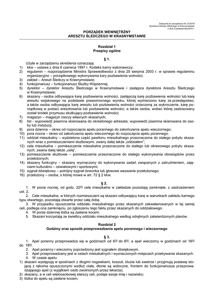 Załącznik do zarządzenia Nr 21/2016 Dyrektora Aresztu Śledczego w Krasnymstawie z dnia 5 października2016 r. PORZĄDEK WEWNĘTRZNY ARESZTU ŚLEDCZEGO W KRASNYMSTAWIE Rozdział 1 Przepisy ogólne 1) 2) 3) 4) 5) 6) 7) 8) 9) 10) 11) 12) 13) 14) 15) 16) § 1. Użyte w zarządzeniu określenia oznaczają: kkw – ustawa z dnia 6 czerwca 1997 r. Kodeks karny wykonawczy; regulamin – rozporządzenie Ministra Sprawiedliwości z dnia 25 sierpnia 2003 r. w sprawie regulaminu organizacyjno – porządkowego wykonywania kary pozbawienia wolności; zakład – Areszt Śledczy w Krasnymstawie; funkcjonariusz – funkcjonariusz Służby Więziennej; dyrektor – dyrektor Aresztu Śledczego w Krasnymstawie i zastępca dyrektora Aresztu Śledczego w Krasnymstawie; skazany - osoba odbywająca karę pozbawienia wolności, zastępczą karę pozbawienia wolności lub karę aresztu wojskowego na podstawie prawomocnego wyroku, której wymierzono karę za przestępstwo, a także osoba odbywająca karę aresztu lub pozbawienia wolności orzeczoną za wykroczenie, karę porządkową w postaci aresztowania lub pozbawienia wolności, a także osoba, wobec której zastosowany został środek przymusu skutkujący pozbawienie wolności; magazyn – magazyn rzeczy własnych skazanych; list - wypowiedź pisemna skierowana do określonego adresata; wypowiedź pisemna skierowana do osoby lub instytucji; pora dzienna – okres od rozpoczęcia apelu porannego do zakończenia apelu wieczornego; pora nocna – okres od zakończenia apelu wieczornego do rozpoczęcia apelu porannego; oddział mieszkalny – wydzielona część pawilonu mieszkalnego przeznaczona do stałego pobytu skazanych wraz z pomieszczeniami służbowymi, zwany dalej także „oddziałem”; cela mieszkalna – pomieszczenie mieszkalne przeznaczone do stałego lub okresowego pobytu skazanych, zwana dalej także „celą”, pomieszczenie służbowe – pomieszczenie przeznaczone do stałego wykonywania obowiązków przez przełożonych; skazany funkcyjny – skazany wyznaczony do wykonywania zadań związanych z zatrudnieniem, zajęciami kulturalno – oświatowymi i sportowymi; sygnał dźwiękowy – potrójny sygnał dzwonka lub głosowe wezwanie przełożonego; przełożony – osoba, o której mowa w art. 72 § 2 kkw. § 2. 1. W porze nocnej, od godz. 2200 cele mieszkalne w zakładzie pozostają zamknięte, z zastrzeżeniem ust. 2. 2. Cele mieszkalne, w których rozmieszczeni są skazani odbywający karę w warunkach zakładu karnego typu otwartego, pozostają otwarte przez całą dobę. 3. W przypadku opuszczenia oddziału mieszkalnego przez skazanych zakwaterowanych w tej samej celi, podlega ona zamknięciu, po zgłoszeniu tego faktu przez skazanych do oddziałowego. 4. W porze dziennej łóżka są zasłane kocem. 5. Skazani korzystają ze świetlicy oddziału mieszkalnego według odrębnych zatwierdzonych planów. Rozdział 2 Godziny oraz sposób przeprowadzania apelu porannego i wieczornego do 1) 2) 3) § 3. 1. Apel poranny przeprowadza się w godzinach od 630 do 650, a apel wieczorny w godzinach od 1830 1850. 2. Apel poranny i wieczorny poprzedzony jest sygnałem dźwiękowym. 3. Apel przeprowadzany jest w celach mieszkalnych i wyznaczonych miejscach przebywania skazanych. 4. W czasie apelu: skazani występują w spodniach z długimi nogawkami, koszuli, bluzie lub swetrze i przyjmują postawę stojącą z rękoma opuszczonymi wzdłuż ciała, dłonie są widoczne, frontem do funkcjonariusza przeprowadzającego apel (z wyjątkiem osób zwolnionych przez lekarza); skazany, a w celi wieloosobowej starszy celi, podaje swoje imię i nazwisko; łóżka do apelu są zasłane kocem; 4) w trakcie apelu sprzęt RTV, głośnik radiowęzłowy i inne urządzenia elektryczne znajdujące się w celach pozostają wyłączone. 5. Dyrektor, a także inna osoba upoważniona do zastępowania dyrektora podczas jego nieobecności może zarządzić przeprowadzenie dodatkowych apeli w każdym czasie. Rozdział 3 Godziny przeznaczone na sen, pracę, naukę, zajęcia kulturalno-oświatowe i sportowe oraz zajęcia własne skazanych § 4. Tabela 1. Ogół skazanych z odstępstwem określonym w tabeli 2, 3 i 4 CZYNNOŚCI GODZINY Uwagi Poprzedzona sygnałem dźwiękowym Pobudka 615 Higiena i porządki 615 - 630 Apel poranny 630 - 650 § 6 ust. 4 stosuje się Śniadanie 650 - 730 § 6 ust. 4 stosuje się Nauka, spacer, zajęcia kulturalno - oświatowe, zajęcia rekreacyjne oraz zajęcia własne w celach, kąpiele 730 - 1230 Grupy, czas, miejsca, kolejność i formy określa się w odrębnie sporządzonych planach, zatwierdzonych przez dyrektora Obiad 1230 - 1345 § 6 ust. 4 stosuje się Obiad dla pracujących 1500 - 1530 § 6 ust. 4 stosuje się Nauka, spacer, zajęcia kulturalno - oświatowe, zajęcia rekreacyjne oraz zajęcia własne w celach, kąpiele 1345 - 1715 Grupy, czas, miejsca, kolejność i formy określa się w odrębnie sporządzonych planach, zatwierdzonych przez dyrektora Kolacja 1715 - 1800 § 6 ust. 4 stosuje się Zajęcia własne 1800 - 1830 w celach mieszkalnych Apel wieczorny 1830 - 1850 § 6 ust. 4 stosuje się Nauka, zajęcia kulturalno - oświatowe i sportowe 1850 - 2100 w obrębie oddziału mieszkalnego Higiena i porządki, zajęcia własne 2100 - 2200 Godziny przeznaczone na sen 2200 - 615 § 6 ust. 4 stosuje się Tabela 2. Skazani wykonujący pracę w Serwis Plus Sp. z o. o. z siedzibą w Lublinie CZYNNOŚCI GODZINY Uwagi 415 Pobudka Higiena i porządki 415 - 420 Śniadanie 420 - 440 Obiad 420 - 440 Kolacja 1715 - 1800 Godziny przeznaczone na sen 2015 - 415 Tabela 3. Skazani wykonujący pracę na pierwszą zamianę CZYNNOŚCI GODZINY Uwagi 430 Pobudka Higiena i porządki 430 - 440 Śniadanie 440 - 500 Obiad 1500 - 1530 Kolacja 1715 - 1800 Godziny przeznaczone na sen 2030 - 430 Tabela 4. Skazani wykonujący pracę na drugą zmianę CZYNNOŚCI Pobudka GODZINY 630 Higiena i porządki 630– 650 Śniadanie 650 – 730 Obiad 1230 - 1345 Kolacja 1230 