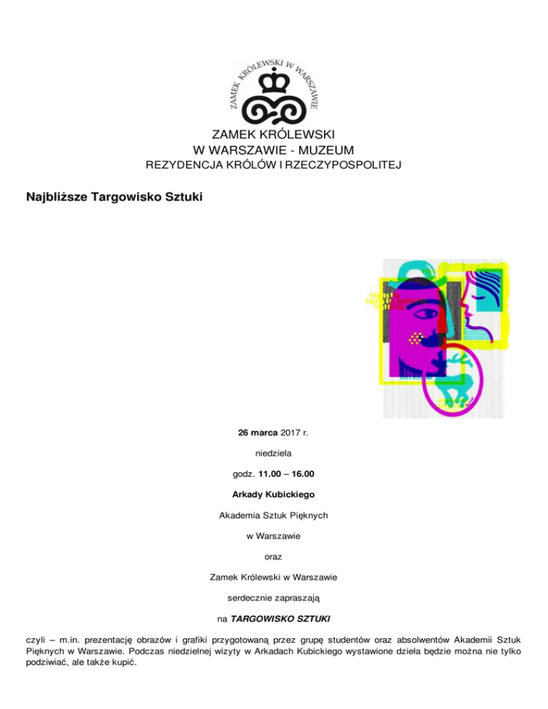 ZAMEK KRÓLEWSKI W WARSZAWIE - MUZEUM REZYDENCJA KRÓLÓW I RZECZYPOSPOLITEJ Najbliższe Targowisko Sztuki 26 marca 2017 r. niedziela godz. 11.00 – 16.00 Arkady Kubickiego Akademia Sztuk Pięknych w Warszawie oraz Zamek Królewski w Warszawie serdecznie zapraszają na TARGOWISKO SZTUKI czyli – m.in. prezentację obrazów i grafiki przygotowaną przez grupę studentów oraz absolwentów Akademii Sztuk Pięknych w Warszawie. Podczas niedzielnej wizyty w Arkadach Kubickiego wystawione dzieła będzie można nie tylko podziwiać, ale także kupić. Wejście na Targowisko Sztuki – bezpłatne. Spotkajmy się w Arkadach Zamek Królewski w Warszawie - Muzeum. Rezydencja Królów i Rzeczypospolitej www.zamek-krolewski.pl
