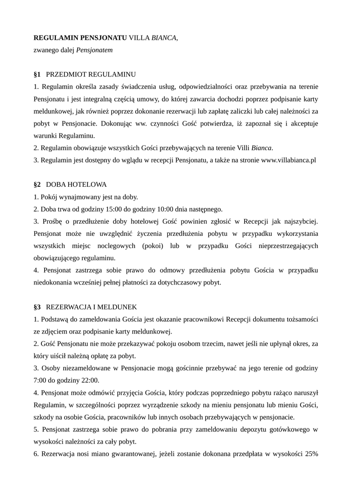 REGULAMIN PENSJONATU VILLA BIANCA, zwanego dalej Pensjonatem §1 PRZEDMIOT REGULAMINU 1. Regulamin określa zasady świadczenia usług, odpowiedzialności oraz przebywania na terenie Pensjonatu i jest integralną częścią umowy, do której zawarcia dochodzi poprzez podpisanie karty meldunkowej, jak również poprzez dokonanie rezerwacji lub zapłatę zaliczki lub całej należności za pobyt w Pensjonacie. Dokonując ww. czynności Gość potwierdza, iż zapoznał się i akceptuje warunki Regulaminu. 2. Regulamin obowiązuje wszystkich Gości przebywających na terenie Villi Bianca. 3. Regulamin jest dostępny do wglądu w recepcji Pensjonatu, a także na stronie www.villabianca.pl §2 DOBA HOTELOWA 1. Pokój wynajmowany jest na doby. 2. Doba trwa od godziny 15:00 do godziny 10:00 dnia następnego. 3. Prośbę o przedłużenie doby hotelowej Gość powinien zgłosić w Recepcji jak najszybciej. Pensjonat może nie uwzględnić życzenia przedłużenia pobytu w przypadku wykorzystania wszystkich miejsc noclegowych (pokoi) lub w przypadku Gości nieprzestrzegających obowiązującego regulaminu. 4. Pensjonat zastrzega sobie prawo do odmowy przedłużenia pobytu Gościa w przypadku niedokonania wcześniej pełnej płatności za dotychczasowy pobyt. §3 REZERWACJA I MELDUNEK 1. Podstawą do zameldowania Gościa jest okazanie pracownikowi Recepcji dokumentu tożsamości ze zdjęciem oraz podpisanie karty meldunkowej. 2. Gość Pensjonatu nie może przekazywać pokoju osobom trzecim, nawet jeśli nie upłynął okres, za który uiścił należną opłatę za pobyt. 3. Osoby niezameldowane w Pensjonacie mogą gościnnie przebywać na jego terenie od godziny 7:00 do godziny 22:00. 4. Pensjonat może odmówić przyjęcia Gościa, który podczas poprzedniego pobytu rażąco naruszył Regulamin, w szczególności poprzez wyrządzenie szkody na mieniu pensjonatu lub mieniu Gości, szkody na osobie Gościa, pracowników lub innych osobach przebywających w pensjonacie. 5. Pensjonat zastrzega sobie prawo do pobrania przy zameldowaniu depozytu gotówkowego w wysokości należności za cały pobyt. 6. Rezerwacja nosi miano gwarantowanej, jeżeli zostanie dokonana przedpłata w wysokości 25% wartości w terminie 2 dni od dnia złożenia rezerwacji telefonicznej. Brak zaliczki może skutkować anulowaniem rezerwacji. 7. W przypadku nieodwołania rezerwacji pokoju na 7 dni przed przyjazdem lub w przypadku nieobecności Gościa w zaplanowanym terminie, zaliczka nie zostaje zwrócona. 8. W przypadku rezygnacji Gościa z pobytu w trakcie trwania doby, Pensjonat nie zwraca opłaty za daną dobę hotelową. §4 ODZPOWIEDZIALNOŚĆ GOŚCI 1. Dzieci poniżej 12. roku życia powinny znajdować się na terenie Pensjonatu pod stałym nadzorem opiekunów prawnych. Opiekunowie prawni ponoszą odpowiedzialność materialną za wszelkie szkody powstałe w wyniku działania dzieci. 2. Gość Pensjonatu ponosi pełną odpowiedzialność materialną za wszelkiego rodzaju uszkodzenia lub zniszczenia wyposażenia i urządzeń technicznych Pensjonatu, powstałe z jego winy lub z winy odwiedzających go osób. Pensjonat zastrzega sobie możliwość obciążenia za wyrządzone szkody karty kredytowej Gościa również po jego wyjeździe. 3. Po przyjeździe Gość otrzymuje klucz z brelokiem magnetycznym do pokoju. Za ich zgubienie, zostanie obciążony kwotą 250 zł. 4. W przypadku naruszenia postanowień Regulaminu, Pensjonat może odmówić świadczenia usług osobie, która je narusza. Osoba taka jest zobowiązana do niezwłocznego zastosowania się do żądań Personelu, uregulowania należności za dotychczasowe świadczenia, zapłaty za ewentualne zniszczenia oraz do opuszczenia pensjonatu. 5. Każdorazowo Gość opuszczający pokój powinien ze względów bezpieczeństwa wyłączyć telewizor, zgasić światło, zakręcić krany oraz zamknąć drzwi na klucz. 6. Pensjonatowi przysługuje ustawowe prawo zastawu na rzeczach wniesionych przez Gościa na teren obiektu w przypadku opóźnienia z uregulowaniem płatności za pobyt lub nieuregulowania należności za świadczone usługi. §5 ODPOWIEDZIALNOŚĆ PENSJONATU VILLA BIANCA 1. Pensjonat ponosi odpowiedzialność za utratę lub uszkodzenie rzeczy wniesionych przez osoby korzystające z jego usług w zakresie określonym przepisami kodeksu cywilnego. 2. Gość powinien zawiadomić Recepcję o wystąpieniu szkody niezwłocznie po jej stwierdzeniu. 3. Pensjonat nie ponosi odpowiedzialności za uszkodzenia i utratę samochodu lub innego pojazdu należącego do Gościa, przedmiotów w nim pozostawionych oraz żywych zwierząt, niezależnie od tego, czy pojazdy te zostały zaparkowane na parkingu pensjonatowym, czy poza jego terenem. §6 ZWROT RZECZY POZOSTAWIONYCH 1. Przedmioty osobistego użytku, pozostawione w pokoju pensjonatowym przez wyjeżdżającego Gościa będą odesłane pod wskazany przez Gościa adres na jego koszt. 2. W przypadku braku dyspozycji od Gościa w sprawie odesłania pozostawionych rzeczy Pensjonat przechowa powyższe przedmioty na koszt właściciela przez okres trzech miesięcy, a po upływie tego okresu przedmioty te przejdą na własność Pensjonatu. Artykuły spożywcze nie będą przechowywane. §7 CISZA NOCNA 1. W Pensjonacie obowiązuje cisza nocna od godziny 22:00 do godziny 8:00 rano. §8 REKLAMACJE 1. Goście mają prawo do składania reklamacji w przypadku zauważenia uchybień w jakości świadczonych usług. 2. Wszelkie reklamacje przyjmuje Recepcja. 3. Reklamacja powinna być złożona niezwłocznie po zauważeniu uchybień w standardzie świadczonych usług. §9 POSTANOWIENIA DODATKOWE 1. Pensjonat nie akceptuje obecności zwierząt. 2. W Pensjonacie i jego bezpośrednim otoczeniu obowiązuje całkowity zakaz palenia tytoniu poza wyznaczonymi miejscami, przeznaczonymi do tego celu. 3. W pokojach nie można przechowywać ładunków niebezpiecznych – broni i amunicji, materiałów łatwopalnych, wybuchowych i iluminacyjnych. 4. Z
