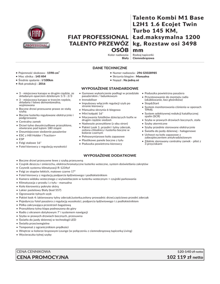 Talento Kombi M1 Base L2H1 1.6 Ecojet Twin Turbo 145 KM, FIAT PROFESSIONAL Ład.maksymalna 1200 TALENTO PRZEWÓZ kg, Rozstaw osi 3498 OSÓB mm Kolor nadwozia: Biały Rodzaj tapicerki: Ciemnobrązowa DANE TECHNICZNE • Pojemność skokowa : 1598 cm3 • Moc silnika : 145 KM • Średnie spalanie : l/100km • Rok produkcji : 2016 • Numer nadwozia : 296 G5028985 • Skrzynia biegów : Manualna • Napęd : Na jedną oś WYPOSAŻENIE STANDARDOWE • 3 - miejscowa kanapa w drugim rzędzie, ze składanym oparciem dzielonym 1/3 : 2/3 • 3 - miejscowa kanapa w trzecim rzędzie, składana i łatwo demontowalna, wyjmowana • Boczne drzwi przesuwne prawe ze stałą szybą • Boczne lusterka regulowane elektrycznie i podgrzewane • Centralny zamek • Drzwi tylne dwuskrzydłowe przeszklone, otwierane pod kątem 180 stopni • Dwumiejscowe siedzenie pasażerów • ESC z Hill Holder i Traction+ • ESP • Felgi stalowe 16" • Fotel kierowcy z regulacją wysokości • Gumowe wykończenie podłogi w przedziale pasażerskim / ładunkowym • Immobiliser • Impulsowy włącznik regulacji szyb po stronie kierowcy • Manualna skrzynia 6-biegowa • Mini kołpaki 16" • Mocowania fotelików dziecięcych Isofix w drugim rzędzie siedzeń • Nadwozie przeszklone (z obu stron) • Pakiet Look 1: przedni i tylny zderzak, osłona chłodnicy i lusterka boczne w kolorze czarnym • Pełnowymiarowe koło zapasowe • Plastikowe panele boczne z tyłu • Poduszka powietrzna kierowcy • Poduszka powietrzna pasażera • Przystosowanie do montażu radia (okablowanie, bez głośników) • Stop&Start • System monitorowania ciśnienia w oponach TPMS • System selektywnej redukcji katalitycznej spalin (SCR) • Szyba w prawych drzwiach bocznych, stała • Szyby atermiczne • Szyby przednie sterowane elektrycznie • Światła do jazdy dziennej - halogenowe • Uchwyt na koło zapasowe z zabezpieczeniem antykradzieżowym • Zdalnie sterowany centralny zamek - pilot z 3 przyciskami WYPOSAŻENIE DODATKOWE • • • • • • • • • • • • • • • • • • • • • Boczne drzwi przesuwne lewe z szybą przesuwną Czujnik deszczu i zmierzchu, elektrochromatyczne lusterko wsteczne, system doświetlania zakrętów Czynnik systemu klimatyzacji R-1234yf Felgi ze stopów lekkich, matowe czarne 17" Fotel kierowcy z regulacją podparcia lędźwiowego i podłokietnikiem Kamera widoku wstecznego z wyświetlaczem w lusterku wstecznym + czujniki parkowania Klimatyzacja z przodu i z tyłu - manualna Koło kierownicy pokryte skórą Lakier pastelowy Biały (kod 557) Ogrzewanie tylnych szyb Pakiet look 4: lakierowany tylny zderzak,lusterka,osłony prowadnic drzwi,częściowo przedni zderzak Pojedynczy fotel pasażera z regulacją wysokości, podparcia lędźwiowego i z podłokietnikiem Półka zakrywająca przestrzeń bagażową Przeszklona tylna klapa podnoszona do góry Radio z ekranem dotykowym 7' i systemem nawigacji Szyba w prawych drzwiach bocznych, przesuwna Światła do jazdy dziennej w technologii LED Światła przeciwmgielne Tempomat z ogranicznikiem prędkości Wnętrze w kolorze brązowym Lounge (w połączeniu z ciemnobrązową tapicerką Living) Wycieraczka tylnej szyby CENA CENNIKOWA CENA PROMOCYJNA 120 140 zł netto 102 119 zł netto Raty skalkulowane dla pojazdów objętych promocją Leasing PRO. Promocja ważna przy skorzystaniu z ubezpieczenia GAP oferowanego przez FCA Leasing Polska Sp. z o.o., którego składka zostanie doliczona do rat leasingowych. Usługa leasingu skierowana jest wyłącznie do przedsiębiorców. Okres gwarancji „Maximum Care” oferowany przez FCA Poland S.A., w ramach promocji Leasing PRO jest uzależniony od modelu pojazdu i zgodny z informacją poniżej. Dla modeli Fiorino i Doblo Cargo: Gwarancja "Maximum Care" 4 lata 120.000 km obejmuje 2 lata gwarancji kontraktowej i 2 lata gwarancji dodatkowej z limitem przebiegu całkowitego 120.000 km. Dla modeli Talento i Ducato: Gwarancja "Maximum Care" 4 lata 160.000 km obejmuje 2 lata gwarancji kontraktowej i 2 lata gwarancji dodatkowej z limitem przebiegu całkowitego 160.000 km. Dla modelu Fullback: Gwarancja "Maximum Care" 5 lat 150.000 km obejmuje 3 lata gwarancji kontraktowej i 2 lata gwarancji dodatkowej z limitem przebiegu całkowitego 150.000 km. Oferta dotyczy samochodów z rocznika produkcji 2016. Ilość samochodów ograniczona. Niniejsze ogłoszenie jest wyłącznie informacją handlową i nie stanowi oferty w myśl art. 66, § 1. Kodeksu Cywilnego. Sprzedający nie odpowiada za ewentualne błędy lub nieaktualność ogłoszenia.