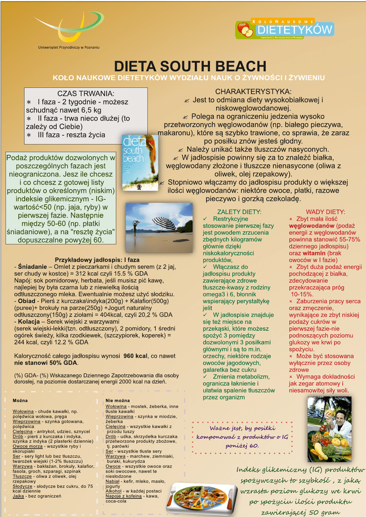 DIETA SOUTH BEACH KOŁO NAUKOWE DIETETYKÓW WYDZIAŁU NAUK O ŻYWNOŚCI I ŻYWIENIU Można Wołowina - chude kawałki, np. polędwica wołowa, pręga Wieprzowina - szynka gotowana, polędwica Cielęcina - antrykot, udziec, sznycel Drób - pierś z kurczaka i indyka, szynka z indyka (2 plasterki dziennie) Owoce morza - wszystkie ryby i skorupiaki Ser - sery light lub bez tłuszczu, twarożek wiejski (1-2% tłuszczu) Warzywa - bakłażan, brokuły, kalafior, fasola, groch, szparagi, szpinak Tłuszcze - oliwa z oliwek, olej rzepakowy Słodycze - słodycze bez cukru, do 75 kcal dziennie Jajka - bez ograniczeń Nie można Wołowina - mostek, żeberka, inne tłuste kawałki Wieprzowina - szynka w miodzie, żeberka Cielęcina - wszystkie kawałki z przodu tuszy Drób - udka, skrzydełka kurczaka, przetworzone produkty zbożowe, tj. parówki Ser - wszystkie tłuste sery Warzywa - marchew, ziemniaki, buraki, kukurydza Owoce - wszystkie owoce oraz soki owocowe, nawet te niesłodzone Nabiał - kefir, mleko, masło, jogurty Alkohol - w każdej postaci Napoje z kofeiną - kawa, coca-cola