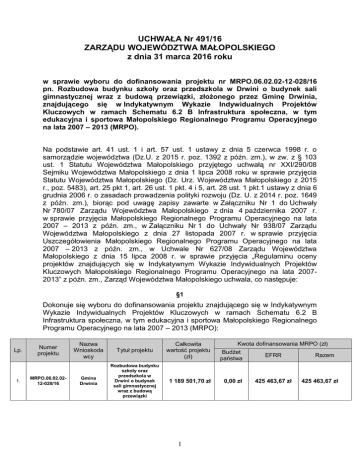 UCHWAŁA Nr 491/16 ZARZĄDU WOJEWÓDZTWA MAŁOPOLSKIEGO z dnia 31 marca 2016 roku w sprawie wyboru do dofinansowania projektu nr MRPO.06.02.02-12-028/16 pn. Rozbudowa budynku szkoły oraz przedszkola w Drwini o budynek sali gimnastycznej wraz z budową przewiązki, złożonego przez Gminę Drwinia, znajdującego się w Indykatywnym Wykazie Indywidualnych Projektów Kluczowych w ramach Schematu 6.2 B Infrastruktura społeczna, w tym edukacyjna i sportowa Małopolskiego Regionalnego Programu Operacyjnego na lata 2007 – 2013 (MRPO). Na podstawie art. 41 ust. 1 i art. 57 ust. 1 ustawy z dnia 5 czerwca 1998 r. o samorządzie województwa (Dz.U. z 2015 r. poz. 1392 z późn. zm.), w zw. z § 103 ust. 1 Statutu Województwa Małopolskiego przyjętego uchwałą nr XXI/290/08 Sejmiku Województwa Małopolskiego z dnia 1 lipca 2008 roku w sprawie przyjęcia Statutu Województwa Małopolskiego (Dz. Urz. Województwa Małopolskiego z 2015 r., poz. 5483), art. 25 pkt 1, art. 26 ust. 1 pkt. 4 i 5, art. 28 ust. 1 pkt.1 ustawy z dnia 6 grudnia 2006 r. o zasadach prowadzenia polityki rozwoju (Dz. U. z 2014 r. poz. 1649 z późn. zm.), biorąc pod uwagę zapisy zawarte w Załączniku Nr 1 do Uchwały Nr 780/07 Zarządu Województwa Małopolskiego z dnia 4 października 2007 r. w sprawie przyjęcia Małopolskiego Regionalnego Programu Operacyjnego na lata 2007 – 2013 z późn. zm., w Załączniku Nr 1 do Uchwały Nr 938/07 Zarządu Województwa Małopolskiego z dnia 27 listopada 2007 r. w sprawie przyjęcia Uszczegółowienia Małopolskiego Regionalnego Programu Operacyjnego na lata 2007 – 2013 z późn. zm., w Uchwale Nr 627/08 Zarządu Województwa Małopolskiego z dnia 15 lipca 2008 r. w sprawie przyjęcia „Regulaminu oceny projektów znajdujących się w Indykatywnym Wykazie Indywidualnych Projektów Kluczowych Małopolskiego Regionalnego Programu Operacyjnego na lata 20072013” z późn. zm., Zarząd Województwa Małopolskiego uchwala, co następuje: §1 Dokonuje się wyboru do dofinansowania projektu znajdującego się w Indykatywnym Wykazie Indywidualnych Projektów Kluczowych w ramach Schematu 6.2 B Infrastruktura społeczna, w tym edukacyjna i sportowa Małopolskiego Regionalnego Programu Operacyjnego na lata 2007 – 2013 (MRPO): Lp. 1. Numer projektu MRPO.06.02.0212-028/16 Nazwa Wnioskoda wcy Tytuł projektu Gmina Drwinia Rozbudowa budynku szkoły oraz przedszkola w Drwini o budynek sali gimnastycznej wraz z budową przewiązki Całkowita wartość projektu (zł) 1 189 501,70 zł 1 Kwota dofinansowania MRPO (zł) Budżet EFRR Razem państwa 0,00 zł 425 463,67 zł 425 463,67 zł §2 Upoważnia się członków Zarządu Województwa Małopolskiego do zawarcia umowy o dofinansowanie projektu nr MRPO.06.02.02-12-028/16 pn. Rozbudowa budynku szkoły oraz przedszkola w Drwini o budynek sali gimnastycznej wraz z budową przewiązki, złożonego przez Gminę Drwinia, znajdującego się w Indykatywnym Wykazie Indywidualnych Projektów Kluczowych w ramach Schematu 6.2 B Infrastruktura społeczna, w tym edukacyjna i sportowa MRPO na lata 2007 – 2013 według specyfikacji określonej w Załączniku nr 1 do niniejszej uchwały. §3 Wykonanie uchwały powierza się Dyrektorowi Departamentu Funduszy Europejskich. §4 Uchwała wchodzi w życie z dniem podjęcia. 2 UZASADNIENIE do Uchwały Nr 491/16 Zarządu Województwa Małopolskiego z dnia 31 marca 2016 roku w sprawie wyboru do dofinansowania projektu nr MRPO.06.02.02-12-028/16 pn. Rozbudowa budynku szkoły oraz przedszkola w Drwini o budynek sali gimnastycznej wraz z budową przewiązki, złożonego przez Gminę Drwinia, znajdującego się w Indykatywnym Wykazie Indywidualnych Projektów Kluczowych w ramach Schematu 6.2 B Infrastruktura społeczna, w tym edukacyjna i sportowa MRPO na lata 2007 – 2013. Przedmiotem projektu jest rozbudowa budynku szkoły oraz przedszkola w Drwini o budynek sali gimnastycznej wraz z budową przewiązki. Wartość całkowita projektu nr MRPO.06.02.02-12-028/16 wynosi 1 189 501,70 zł natomiast kwota dofinansowania EFRR wynosi 425 463,67 zł. Zgodnie z „Regulaminem oceny projektów znajdujących się w Indykatywnym Wykazie Indywidualnych Projektów Kluczowych Małopolskiego Regionalnego Programu Operacyjnego na lata 2007 – 2013” Wnioskodawca złożył dokumentację aplikacyjną w dniu 29 stycznia 2016 r. Zgodnie z procedurą wyboru projektów została przeprowadzona ocena formalna wniosku, a następnie ocena merytoryczna, której składowymi są: ocena finansowa oraz właściwa ocena merytoryczna. W dniu 30 marca 2016 r. zakończył się etap właściwej oceny merytorycznej wniosku. Projekt uzyskał 24 pkt, co stanowi 60 % maksymalnej liczby punktów możliwych do uzyskania na etapie oceny merytorycznej właściwej. Ostatnim etapem procedury jest dokonanie Małopolskiego wyboru projektu do dofinansowania. 3 przez Zarząd Województwa Załącznik nr 1 do Uchwały Nr 491/16 Zarządu Województwa Małopolskiego z dnia 31 marca 2016 r. Do zawarcia umowy o dofinansowanie projektu nr MRPO.06.02.02-12-028/16 pn. Rozbudowa budynku szkoły oraz przedszkola w Drwini o budynek sali gimnastycznej wraz z budową przewiązki, złożonego przez Gminę Drwinia, znajdującego się w Indykatywnym Wykazie Indywidualnych Projektów Kluczowych w ramach Schematu 6.2 B Infrastruktura społeczna, w tym edukacyjna i sportowa MRPO na lata 2007 – 2013 upoważnieni są członkowie Zarządu Województwa Małopolskiego: – Jacek Krupa – Wojciech Kozak – Stanisław Sorys – Grzegorz Lipiec – Leszek Zegzda z zastrzeżeniem, że każdorazowo umowę podpisuje łącznie dwóch członków Zarządu. 4
