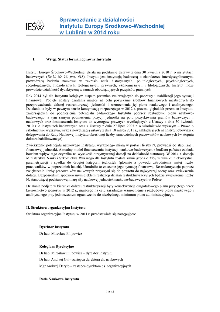 Sprawozdanie z działalności Instytutu Europy Środkowo-Wschodniej w Lublinie w 2014 roku I. Wstęp. Status formalnoprawny Instytutu Instytut Europy Środkowo-Wschodniej działa na podstawie Ustawy z dnia 30 kwietnia 2010 r. o instytutach badawczych (Dz.U. Nr 96, poz. 618). Instytut jest instytucją badawczą o charakterze interdyscyplinarnym, prowadzącą badania naukowe w zakresie nauk historycznych, politologicznych, psychologicznych, socjologicznych, filozoficznych, teologicznych, prawnych, ekonomicznych i filologicznych. Instytut może prowadzić działalność dydaktyczną w ramach obowiązujących przepisów prawnych. Rok 2014 był dla Instytutu kolejnym etapem przemian zmierzających do poprawy i stabilizacji jego sytuacji finansowej. Podjęte zostały działania mające na celu pozyskanie środków finansowych niezbędnych do przeprowadzania dalszej restrukturyzacji jednostki i wzmocnienia jej pionu naukowego i analitycznego. Działania te były w pewnym sensie kontynuacją rozpoczętego w 2012 r. procesu głębokich przemian Instytutu zmierzających do podniesienia potencjału badawczego Instytutu poprzez rozbudowę pionu naukowobadawczego, a tym samym podniesienia pozycji jednostki na polu pozyskiwania grantów badawczych i naukowych oraz dostosowania Instytutu do wymogów prawnych wynikających z Ustawy z dnia 30 kwietnia 2010 r. o instytutach badawczych oraz z Ustawy z dnia 27 lipca 2005 r. o szkolnictwie wyższym – Prawo o szkolnictwie wyższym, wraz z nowelizacją ustawy z dnia 18 marca 2011 r., nakładających na Instytut obowiązek delegowania do Rady Naukowej Instytutu określonej liczby samodzielnych pracowników naukowych (w stopniu doktora habilitowanego). Zwiększenie potencjału naukowego Instytutu, wyrażonego miarą w postaci liczby N, prowadzi do stabilizacji finansowej jednostki. Aktualny model finansowania instytucji naukowo-badawczych z budżetu państwa zakłada bowiem wpływ tego czynnika na wysokość otrzymywanej dotacji na działalność statutową. W 2014 r. dotacja Ministerstwa Nauki i Szkolnictwa Wyższego dla Instytutu została zmniejszona o 37% w wyniku niekorzystnej parametryzacji i spadku do drugiej kategorii jednostek (głównie z powodu zatrudnienia małej liczby pracowników w poprzednich latach). Utrudniło to znacznie jego sytuację finansową. Restrukturyzacja poprzez zwiększenie liczby pracowników naukowych przyczyni się do powrotu do najwyższej oceny oraz zwiększenia dotacji. Bezpośrednim spodziewanym efektem realizacji działań restrukturyzacyjnych będzie zwiększenie liczby N, stanowiącej podstawową miarę siły naukowej jednostek naukowo-badawczych w Polsce. Działania podjęte w kierunku dalszej restrukturyzacji były konsekwencją długofalowego planu przyjętego przez kierownictwo jednostki w 2012 r., mającego na celu zasadnicze wzmocnienie i rozbudowę pionu naukowego i analitycznego przy jednoczesnym ograniczeniu do niezbędnego minimum pionu administracyjnego. II. Struktura organizacyjna Instytutu Struktura organizacyjna Instytutu w 2011 r. przedstawiała się następująco: Dyrektor Instytutu Dr hab. Mirosław Filipowicz Kolegium Dyrekcyjne Dr hab. Mirosław Filipowicz – dyrektor Instytutu Dr hab. Andrzej Gil – zastępca dyrektora ds. naukowych Mgr Andrzej Deryło – zastępca dyrektora ds. organizacyjnych Rada Naukowa Instytutu 1 z 43 Zgodnie z wymogami Ustawy z dnia 30 kwietnia 2011 r. o instytutach badawczych (Dz.U. Nr 96, poz. 618) oraz decyzją Ministra Spraw Zagranicznych Instytut w grudniu 2011 r. rozpoczął proces powołania nowej Rady Naukowej. W jej skład wchodzą: 1. dr Marek Cichocki 2. dr Adam Eberhardt 3. dr hab. Mirosław Filipowicz – dyrektor IEŚW (zasiada w RN z prawem głosu) 4. dr hab. Tomasz Stępniewski – sekretarz Rady Naukowej 5. dr hab. Hubert Łaszkiewicz – zastępca przewodniczącego Rady Naukowej 6. dr Zbigniew Piłat 7. prof. Marek Pietraś 8. prof. Zdzisław Najder 9. ks. prof. Andrzej Szostek – przewodniczący Rady Naukowej 10. dr Jakub Wiśniewski (do grudnia 2014 r.), dr Wojciech Zajączkowski od 17 grudnia 2014 r. (na mocy powołania przez Ministra Spraw Zagranicznych Grzegorza Schetynę) 11. dr Anna Bazhenova 12. dr Agata Stolarz 13. dr hab. Andrzej Gil (zastępca dyrektora Instytutu ds. naukowych – z prawem uczestnictwa w obradach) Struktura zatrudnienia w 2014 r. przedstawiała się w następujący sposób: Kolegium Dyrekcyjne • dr hab. Mirosław Filipowicz – dyrektor Instytutu– • dr hab. Andrzej Gil – zastępca dyrektora ds. naukowych • mgr Andrzej Deryło – zastępca dyrektora ds. organizacyjnych Dział naukowo-badawczy • dr hab. Andrzej Gil – zastępca dyrektora ds. naukowych • dr hab. Tomasz Stępniewski – adiunkt (urlop) • dr Anna Visvizi – adiunkt • dr Hanna Bazhenova – adiunkt • mgr Paweł Jarosz – asystent • dr Agata Stolarz – asystent • mgr Alina Sobol – asystent • dr hab. Hubert Łaszkiewicz – profesor (1/3 etatu) • dr Zbigniew Piłat – adiunkt (1/10 etatu) Dział administracyjno-finansowy: • mgr Andrzej Deryło – zastępca dyrektora ds. organizacyjnych • mgr Marta Aleksandrowicz – główny księgowy • mgr Grażyna Płodowska – referent (wolontariat) • Teresa Wieczerzak – kasjer (umowa zlecenie) • Mirosława Sobczak – sprzątaczka (umowa zlecenie) 2 z 43 Dział wydawniczy: • mgr Anna Paprocka – kierownik Działu wydawniczego • mgr Agnieszka Zajdel – referent • Andrzej Koma – referent III. Działalność naukowa Instytutu Zakres problematyki badawczej Każdy z pracowników posiadał określony zakres zadań badawczych i dokumentacyjnych. Te ostatnie dotyczyły zbierania i archiwizowania informacji bieżących, gromadzonych na podstawie przeglądu prasy i serwisów informacyjnych dostępnych w Internecie, jak też poprzez tradycyjne środki przekazu informacji. Na ich podstawie przygotowywano analizy i materiały do publikacji. Podstawowym miejscem pracy były lubelskie bibl