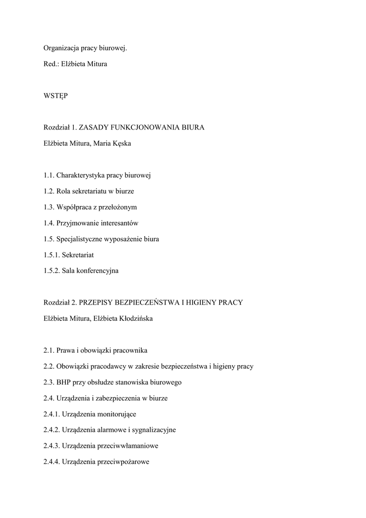 Organizacja pracy biurowej. Red.: Elżbieta Mitura WSTĘP Rozdział 1. ZASADY FUNKCJONOWANIA BIURA Elżbieta Mitura, Maria Kęska 1.1. Charakterystyka pracy biurowej 1.2. Rola sekretariatu w biurze 1.3. Współpraca z przełożonym 1.4. Przyjmowanie interesantów 1.5. Specjalistyczne wyposażenie biura 1.5.1. Sekretariat 1.5.2. Sala konferencyjna Rozdział 2. PRZEPISY BEZPIECZEŃSTWA I HIGIENY PRACY Elżbieta Mitura, Elżbieta Kłodzińska 2.1. Prawa i obowiązki pracownika 2.2. Obowiązki pracodawcy w zakresie bezpieczeństwa i higieny pracy 2.3. BHP przy obsłudze stanowiska biurowego 2.4. Urządzenia i zabezpieczenia w biurze 2.4.1. Urządzenia monitorujące 2.4.2. Urządzenia alarmowe i sygnalizacyjne 2.4.3. Urządzenia przeciwwłamaniowe 2.4.4. Urządzenia przeciwpożarowe 2.5. Ochrona środowiska i materialne środowisko pracy 2.6. Pierwsza pomoc w nagłych wypadkach Rozdział 3. ORGANIZACJA STANOWISKA PRACY, ZARZĄDZANIE BIUREM Anna Oleksiejczuk, Ewa Oleksiejczuk 3.1. Planowanie, organizowanie i nadzorowanie pracy w biurze 3.2. Funkcje i czynności kierownicze 3.3. Umiejętności kierownicze 3.4. Style kierowania 3.5. Sytuacyjne wyznaczniki skuteczności kierowania 3.6. Style kierowania ze względu na skuteczność działań kierowniczych 3.7. Zachowania przywódcze w procesie kierowania 3.8. Zachowania informacyjno-decyzyjne kierownika 3.9. Urządzenia biurowe 3.9.1. Komputer i urządzenia wspomagające 3.9.2. Środki łączności 3.9.3. Pozostałe urządzenia biurowe 3.10. Środki wykorzystywane do organizacji i archiwizacji biura Rozdział 4. REDAGOWANIE PISM Elżbieta Mitura, Elżbieta Kłodzińska 4.1. Pojęcie i rodzaje pism 4.2. Zasady redagowania pism 4.3. Blankiety korespondencyjne 4.4. Elementy i części składowe pisma 4.5. Protokoły, sprawozdania, notatki służbowe 4.7. Adresowanie kopert Rozdział 5. ORGANIZACJA OBIEGU KORESPONDENCJI Bogusława Kożuch 5.1. Instrukcja kancelaryjna 5.2. Systemy kancelaryjne 5.3. Przyjmowanie, otwieranie, sprawdzanie korespondencji 5.4. Obieg korespondencji 5.5. Wysyłanie korespondencji 5.6. Przechowywanie i archiwizowanie dokumentów Rozdział 6. KORESPONDENCJA SŁUŻBOWA Elżbieta Mitura, Elżbieta Kłodzińska 6.1. Korespondencja w sprawach osobowych 6.1.1. Dokumentacja osobowa w języku angielskim 6.1.2. Dokumentacja osobowa w języku niemieckim 6.1.3. Dokumentacja osobowa w języku hiszpańskim 6.1.4. Dokumentacja osobowa w języku rosyjskim 6.1.5. Dokumentacja osobowa w języku francuskim 6.2. Korespondencja w sprawach handlowych 6.2.1. Etapy zawierania transakcji 6.3. Korespondencja w sprawach administracyjnych 6.3.1. Pisma związane z postępowaniem administracyjnym 6.3.2. Skargi i wnioski 6.3.3. Postępowanie w sprawach wydawania zaświadczeń 6.4. Korespondencja w sprawach finansowych 6.5. Korespondencja w sprawach transportowych 6.6. Program: SendSystem – system obsługi przesyłek 6.7. Korespondencja tajna i poufna Rozdział 7. ORGANIZACJA SPOTKAŃ SŁUŻBOWYCH Elżbieta Mitura, Elżbieta Kłodzińska 7.1. Typy spotkań (zebrań) firmowych 7.2. Organizacja zebrań 7.3. Zebrania formalne i nieformalne 7.3.1. Zebrania formalne 7.3.2. Zebrania nieformalne 7.4. Podróże służbowe 7.5. Zasady savoir-vivre’u 7.6. Obcokrajowcy w biurze 7.7. Etykieta spotkania biznesowego Rozdział 8. OBSŁUGA INTERESANTÓW I UDZIELANIE INFORMACJI Magdalena Kalita, Elżbieta Kłodzińska 8.1. Działanie w przestrzeni biurowej 8.2. Typy interesantów 8.2.1. Bezpośredni kontakt z interesantem 8.3. Strategie obsługi interesantów 8.4. Prawa interesantów 8.5. Metody komunikowania się 8.5.1. Komunikacja werbalna 8.5.2. Komunikacja niewerbalna 8.5.3. Bariery w komunikacji 8.5.4. Konflikty w biurze i ich rozwiązywanie Rozdział 9. KREOWANIE WIZERUNKU PRZEDSIĘBIORSTWA W OTOCZENIU Elżbieta Mitura, Elżbieta Kłodzińska 9.1. Działania public relations w biurze 9.2. Narzędzia do budowy wizerunku 9.3. Rozmowy telefoniczne 9.4. Ubiór i cechy pracownika biurowego 9.5. Relacje z mediami ZAŁĄCZNIKI BIBLIOGRAFIA