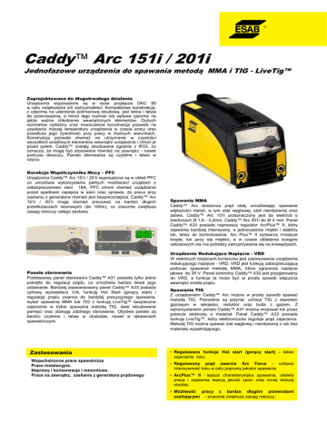 Caddy™ Arc 151i / 201i Jednofazowe urządzenia do spawania metodą MMA i TIG - LiveTig™ Zaprojektowane do długotrwałego działania Urządzenia wyposażone są w duże przyłącza OKC 50 w celu zwiększenia ich wytrzymałości. Kompaktowa konstrukcja, z odporną na uderzenia polimerową obudową, jest lekka i łatwa do przenoszenia, a mimo tego rozmiar nie wpływa ujemnie na jakże ważne chłodzenie wewnętrznych elementów. Dużych rozmiarów radiatory oraz nowoczesna konstrukcja pozwala na uzyskanie niższej temperatury urządzenia w czasie pracy oraz przedłuża jego żywotność przy pracy w trudnych warunkach. Konstrukcja pozwala również na utrzymanie w czystości wszystkich wrażliwych elementów wewnątrz urządzenia i chroni je przed pyłem. Caddy™ zostały zbudowane zgodnie z IP23, co oznacza, że mogą być stosowane również na zewnątrz - nawet podczas deszczu. Panele sterowania są czytelne i łatwe w użyciu. Korekcja Współczynnika Mocy – PFC Urządzenia Caddy™ Arc 151i / 201i wyposażone są w układ PFC co umożliwia wykorzystanie pełnych możliwości urządzeń z zabezpieczeniem sieci 16A. PFC chroni również urządzenia przed spadkami napięcia w sieci oraz sprawia, że praca przy zasilaniu z generatora również jest bezpieczniejsza. Caddy™ Arc 151i / 201i mogą również pracować na bardzo długich przedłużaczach sieciowych (do 100m), co znacznie zwiększa zasięg roboczy całego zestawu Panele sterowania Podstawowy panel sterowania Caddy™ A31 posiada tylko jedno pokrętło do regulacji prądu, co umożliwia bardzo łatwe jego ustawianie. Bardziej zaawansowany panel Caddy™ A33 posiada cyfrowy wyświetlacz V/A, funkcję Hot Start (gorący start) i regulację prądu zwarcia do bardziej precyzyjnego spawania, wybór spawania MMA lub TIG z funkcją LiveTig™ bezpieczne zajarzenie w trybie spawania metodą TIG, dwie wbudowane pamięci oraz obsługę zdalnego sterowania. Obydwa panele są bardzo czytelne i łatwe w obsłudze, nawet w rękawicach spawalniczych. Zastosowania Wszechstronne prace spawalnicze Prace instalacyjne. Naprawy i konserwacje i remontowe. Prace na zewnątrz, zasilanie z generatora prądowego Spawanie MMA Caddy™ Arc dostarcza prąd stały umożliwiając spawanie większości metali, w tym stali węglowej, stali nierdzewnej oraz żeliwa. Caddy™ Arc 151i przeznaczony jest do elektrod o średnicach Ø 1,6 - 3,2mm. Caddy™ Arc 201i do Ø 4 mm. Panel CaddyTM A33 posiada najnowszy regulator ArcPlus™ II, który zapewnia bardziej intensywny, a jednocześnie miękki i stabilny łuk, łatwy do kontrolowania. Arc Plus™ II wytwarza mniejsze krople, łuk jarzy się miękko, a w czasie układania ściegów zakosowych nie ma potrzeby zatrzymywania się na krawędziach. Urządzenie Redukujące Napięcie - VRD W niektórych miejscach konieczne jest zastosowanie urządzenia redukującego napięcie - VRD. VRD jest funkcją zabezpieczającą podczas spawania metodą MMA, która ogranicza napięcie jałowe do 35 V. Panel kontrolny CaddyTM A33 jest przygotowany do VRD, a funkcja ta może być w prosty sposób włączona wewnątrz źródła prądu. Spawanie TIG Z urządzeniem Caddy™ Arc można w prosty sposób spawać metodą TIG. Potrzebne są jedynie: uchwyt TIG z zaworem gazowym w rękojeści, reduktor oraz butla z gazem. Z wykorzystaniem panelu Caddy™ A31 można inicjować łuk przez potarcie elektrody o materiał. Panel Caddy™ A33 posiada funkcję LiveTig™, który elektronicznie reguluje prąd zajarzenia. Metodą TIG można spawać stal węglową i nierdzewną z lub bez materiału wypełniającego. • Regulowana funkcja Hot start (gorący start) - łatwe zajarzenie łuku. • Regulowany prąd zwarcia Arc Force - ustawia intensywność łuku w celu poprawy jakości spawania. • ArcPlus™ II – lepsza charakterystyka spawania, ułatwia pracę i zapewnia lepszą jakość spoin oraz mniej dalszej obróbki. • Możliwość pracy z bardzo długimi przewodami zasilającymi - znacznie zwiększa zasięg roboczy. Dane techniczne Napięcie zasilania V/ph Hz Bezpiecznik (zwłoczny), A Obciążenie przy 40ºC, MMA 25% cykl pracy, A/V 60% cykl pracy, A/V 100% cykl pracy, A/V Obciążenie przy 40ºC, TIG 25% cykl pracy, A/V 60% cykl pracy, A/V 100% cykl pracy, A/V Zakres prądu spawania MMA (DC), A Zakres prądu spawania TIG (DC), A Napięcie jałowe, V Napięcie jałowe (VRD włączone), V Wymiary dł. x szer. x wys., mm Masa, kg Stopień ochrony Klasyfikacja zastosowania Normy Caddy™ Arc 151i Caddy™ Arc 201i 230V 50/60Hz 16A 230V 50/60Hz 16 A 150/26 100/24 90/23,6 170/26,8 130/25,2 110/24,4 150/16 220/18,8 120/14,8 160/16,4 110/14,4 110/14,4 4 - 150 4 - 170 4 - 150 4 - 220 70 72 35 35 418 x 188 x 208 418 x 188 x 208 7,9 8,3 IP 23 IP 23 S S EN 60974-1, EN 60974-3, EN 60974-10 Informacje dotyczące zamawiania 0460 445 881 0460 445 883 Caddy™ Arc 201i, A33, przewody 3 m do MMA 0460 445 884 AKCESORIA Pas naramienny Wózek transportowy (dla butli od 5 do 10 l) Zdalne sterowanie MMA 1, 10 m Zdalne sterowanie AT1 Zdalne sterowanie AT1 CF – dokładna regulacja 0460 265 003 0459 366 885 0349 501 024 0459 491 896 0459 491 897 Przewody dla przystawek AT1 oraz AT1 CoarseFine: Przewód o długości 5 m 0459 552 880 Przewód o długości 10 m 0459 552 881 Przewód o długości 15 m 0459 552 882 Przewód o długości 25 m 0459 552 883 Regulacja nożna FS 002, 5 m 0349 090 886 Uchwyt TIG TXH™ 150V OKC50, 4m 0460 011 843 Uchwyt TIG TXH™ 150V OKC50, 8m 0460 011 883 Uchwyt TIG TXH™ 200V OKC50, 4m 0460 012 841 Uchwyt TIG TXH™ 200V OKC50, 8m 0460 012 881 Uchwyt elektrodowy Confort 200 0700 006 004 Uchwyt elektrodowy Handy 200, 0700 006 003 Uchwyt elektrodowy Prima 200, 0700 006 006 Zacisk masowy MP 200 0367 558 880 Młotek spawalniczy SH2 0000 663 000 Młotek spawalniczy SH3 0683 200 001 Ochrona osobista: Przyłbica spawalnicza Albatross 1000, 90 x 110 Przyłbica spawalnicza Eye-Tech Mono 10/11 Rękawice spawalnicze Heavy Duty Basic Rękawi
