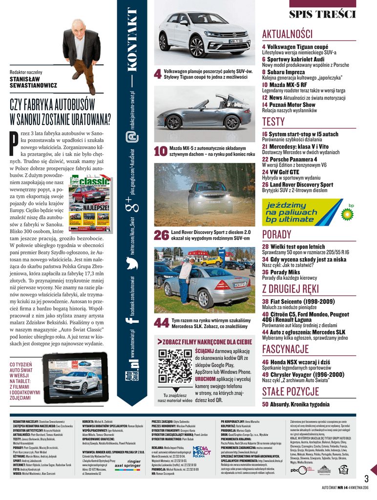 KONTAKT Redaktor naczelny rzez 3 lata fabryka autobusów w Sanoku pozostawała w upadłości i szukała nowego właściciela. Zorganizowano kilka przetargów, ale i tak nie było chętnych. Trudno się dziwić, wszak mamy już w Polsce dobrze prosperujące fabryki autobusów. Z dużym powodzeniem zaspokajają one nasz wewnętrzny popyt, a poza tym eksportują swoje pojazdy do wielu krajów NAJLEPSZE! Europy. Ciężko będzie więc znaleźć niszę dla autobusów z fabryki w Sanoku. Blisko 300 osobom, które tam jeszcze pracują, groziło bezrobocie. W połowie ubiegłego tygodnia w obecności pani premier Beaty Szydło ogłoszono, że Autosan ma nowego właściciela. Jest nim należąca do skarbu państwa Polska Grupa Zbrojeniowa, która zapłaciła za fabrykę 17,3 mln złotych. To przynajmniej trzykrotnie mniej niż pierwsze wyceny. Nie znamy na razie planów nowego właściciela fabryki, ale trzymamy kciuki za jej powodzenie. Autosan to przecież firma z bardzo bogatą historią. Współpracował z nim jako stylista znany artysta malarz Zdzisław Beksiński. Pisaliśmy o tym w naszym magazynie „Auto Świat Classic” pod koniec ubiegłego roku. A już teraz w kioskach jest dostępne jego najnowsze wydanie. P 148 STRO N Nr 2/2016 19,90 zł W TYM 8% VAT MARZEC-KWIECIEŃ KWIECIEŃ Magazyn o samochodach wiecznie młodych MERCEDES C124 4 Volkswagen Tiguan coupé Lifestylowa wersja niemieckiego SUV-a 6 Sportowy kabriolet Audi 4 Nowy model produkowany wspólnie z Porsche Volkswagen planuje poszerzyć paletę SUV-ów. Stylowy Tiguan coupé to jedna z możliwości 8 Subaru Impreza Kolejna generacja kultowego „japończyka” 10 Mazda MX-5 RF Legendarny roadster teraz także w wersji targa 12 News Aktualności ze świata motoryzacji 14 Poznań Motor Show Relacja naszych wysłanników TESTY 16 System start-stop w 15 autach plus.google.com/+AutoŚwiat CZY FABRYKA AUTOBUSÓW W SANOKU ZOSTANIE URATOWANA? AKTUALNOŚCI [email protected] STANISŁAW CZ SEWASTIANOWICZ SPIS TREŚCI 10 Porównanie szybkości działania Mazda MX-5 z automatycznie składanym sztywnym dachem – na rynku pod koniec roku 21 Mercedesy: klasa V i Vito Dostawczy Mercedes w dwóch wydaniach 22 Porsche Panamera 4 W wersji Edition z benzynowym V6 24 VW Golf GTE Hybryda w sportowym wydaniu 26 Land Rover Discovery Sport Brytyjski SUV z 2-litrowym dieslem OK001_ASC_02_2016_OKLADKAv1.indd 1 RAJD MONTE CARLO HISTORIQUE Największy polski sukces od lat! PORADY: układ P zzapłonowy 09.03.2016 15:28 PORADY Land Rover Discovery Sport z dieslem 2.0 okazał się wygodnym rodzinnym SUV-emAuto Swiat 55_5x16.indd 1 1/15/15 12:37 PM 28 Wielki test opon letnich Sprawdzamy 50 opon w rozmiarze 205/55 R 16 Nasz cykl: Jak to załatwić? 36 Porady Miks CO TYDZIEŃ AUTO ŚWIAT W WERSJI NA TABLET: Z FILMAMI I DODATKOWYMI ZDJĘCIAMI REDAKTOR NACZELNY: Stanis∏aw Sewastianowicz ZASTĘPCA REDAKTORA NACZELNEGO: Ewa Czechowska DYREKTOR ARTYSTYCZNY: Krzysztof Kubicki AKTUALNOŚCI: Piotr Burchard, Tomasz Kamiński TESTY: Janusz Borkowski, Błażej Buliński, Micha∏ Krasnodębski PORADY: Piotr Szypulski, Maciej Brzeziński, Piotr Karczmarczyk, Piotr Wróbel UŹYWANE: Marcin Matus, Andrzej Jedynak SPORT: Andrzej Jakubaszek INTERNET: Robert Rybicki, Lesław Sagan, Radosław Turek FOTO: Andrzej Kondratczyk WIDEO: Michał Mackiewicz, Alan Szerszeń 26 34 Gdy wycena szkody jest za niska facebook.com/autoswiat ŁADA NIVA Terenówka zza żelaznej kurtyny REPORTAŻ: historia ria FSC Starachowice www.autoswiat.pl SYRENA Pierwsze auto dla Kowalskiego twitter.com/Auto_Swiat AUDI 200 AVANT KOREKTA: Michał A. Zieliński WYDAWCA DODATKÓW SPECJALNYCH: Roman Dębecki WSPÓ¸PRACOWNICY: Igor Kohutnicki, Adam Mikuła, Tomasz Okurowski OPRACOWANIE GRAFICZNE: Andrzej Gawęda, Natalia Królikowska, Paweł Polaniecki WYDAWCA: RINGIER AXEL SPRINGER POLSKA SP. Z O.O. Cz∏onek Izby Wydawców Prasy i Związku Kontroli Dystrybucji Prasy www.ringieraxelspringer.pl Adres: 02-672 Warszawa, ul. Domaniewska 52 Porady dla każdego kierowcy Z DRUGIEJ RĘKI 38 Fiat Seicento (1998-2009) Maluch za nieduże pieniądze 44 Tym razem na rynku wtórnym szukaliśmy Mercedesa SLK. Zobacz, co znaleźliśmy ŚCIĄGNIJ darmową aplikację do skanowania kodów QR ze sklepów Google Play, AppStore lub Windows Phone. URUCHOM aplikację i wyceluj kamerę swojego telefonu w strony, na których znajTu znajdziesz nasz materiał wideo dziesz kod QR. REKLAMA: Media Impact Polska, e-mail: [email protected] Marek Drzewiecki, tel. 22 232 01 04, Wojciech Mistewicz, tel. 22 232 01 03, Agnieszka Laskowska (traffic), tel. 22 232 01 50 PROMOCJA: Michał Róziecki, tel. 22 232 01 89 HR: Roman Szczepanik Porównanie aut klasy średniej z dieslami 44 Auto z ogłoszenia: Mercedes SLK ZOBACZ FILMY NAKRĘCONE DLA CIEBIE PREZES ZARZĄDU: Edyta Sadowska PREZES HONOROWY: Wies∏aw Podkański DYREKTOR FINANSOWY: Grzegorz Kania DYREKTOR ZARZĄDZAJĄCY MARKĄ: Paweł Jordan DYREKTOR MARKETINGU: Piotr Bubak 40 Citroën C5, Ford Mondeo, Peugeot 406 i Renault Laguna Wybieramy kilka ogłoszeń, sprawdzamy jedno FASCYNACJE 46 Honda NSX wczoraj i dziś Spotkanie legendarnych sportowców 49 Chrysler Voyager (1996-2000) Nasz cykl „Z archiwum Auto Świata” STAŁE POZYCJE 50 Absurdy. Kronika tygodnia PR KORPORACYJNY: Anna Marucha KOLPORTAŹ: Rafał Kamiński PRODUKCJA: Mariusz Gajda DRUK: Quad/Graphics Europe Sp. z o.o., Wyszków PRENUMERATA KRAJOWA: Poczta Polska, Ruch SA oraz Kolporter SA na terenie ca∏ego kraju PRENUMERATA ZAGRANICZNA: można zamawiać pod adresem http://www.kiosk.literia.pl SPRZEDAŹ INTERNETOWA WYDAŃ ARCHIWALNYCH, SPECJALNYCH I PRENUMERATA: http://www.kiosk.literia.pl Redakcja nie zwraca materia∏ów niezamówionych, zastrzega sobie prawo redagowania nades∏anych tekstów, nie odpowiada za treść zamieszczonych reklam i og∏oszeń. Zabroniona jest bezumowna sprzedaż czasopisma po cenie niższej od ceny detalicznej ustalonej przez wydawcę. Sprzedaż numerów aktualnych i archiwalnych w innej cenie jest 